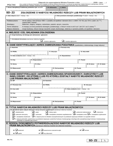 Załącznik do rozporządzenia Ministra Finansów z dnia ............................2008 r. (poz. .....) POLTAX POLA JASNE WYPEŁNIA PODATNIK, POLA CIEMNE WYPEŁNIA ORGAN PODATKOWY. WYPEŁNIĆ NA MASZYNIE, KOMPUTEROWO LUB RĘCZNIE, DUŻYMI, DRUKOWANYMI LITERAMI, CZARNYM LUB NIEBIESKIM KOLOREM. PRZED WYPEŁNIENIEM ZAPOZNAĆ SIĘ Z OBJAŚNIENIAMI. 1. Numer Identyfikacji Podatkowej podatnika wym. w cz. B 2. Nr dokumentu 3. Status └────┴────┴────┴────┴────┴────┴────┴────┴────┴────┘ SD- Z2 ZGŁOSZENIE O NABYCIU WŁASNOŚCI RZECZY LUB PRAW MAJĄTKOWYCH 5. Data powstania obowiązku podatkowego 1) (dzień - miesiąc - rok) 4. Data nabycia (dzień - miesiąc - rok) └────┴────┘-└────┴────┘-└────┴────┴────┴────┘ └────┴────┘-└────┴────┘-└────┴────┴────┴────┘ Składający: Art.4a ustawy z dnia 28 lipca 1983 r. o podatku od spadków i darowizn (Dz.U. z 2004 r. Nr 142, poz.1514, z późn. zm. 2) ), zwanej dalej "ustawą”. Małżonek, zstępny, wstępny, rodzeństwo, pasierb, ojczym, macocha. Termin składania: 6 miesięcy od dnia powstania obowiązku podatkowego, o którym mowa w art.6 ust.1 pkt 2-8 i ust.2 ustawy 3). Miejsce składania: Urząd skarbowy, którym kieruje naczelnik urzędu skarbowego, właściwy w sprawie podatku od spadków i darowizn. Podstawa prawna: A. MIEJSCE I CEL SKŁADANIA ZGŁOSZENIA 6. Urząd skarbowy, do którego jest adresowane zgłoszenie 7. Cel złożenia formularza (zaznaczyć właściwy kwadrat): q1. złożenie zgłoszenia q2. korekta zgłoszenia B. DANE IDENTYFIKUJĄCE I ADRES ZAMIESZKANIA PODATNIKA (spadkobiercy, obdarowanego, innego nabywcy) 8. Nazwisko 9. Pierwsze imię 10. PESEL 11. Imię ojca 12. Imię matki └────┴────┴────┴────┴────┴────┴────┴────┴────┴────┴────┘ 13. Data urodzenia (dzień - miesiąc - rok) 14. Obywatelstwo └────┴────┘-└────┴────┘-└────┴────┴────┴────┘ 15. Kraj 16. Województwo 18. Gmina 17. Powiat 19. Ulica 20. Nr domu 22. Miejscowość 23. Kod pocztowy 21. Nr lokalu 24. Poczta C. DANE IDENTYFIKUJĄCE I ADRES ZAMIESZKANIA SPADKODAWCY, DARCZYŃCY LUB INNEJ OSOBY, OD KTÓREJ LUB PO KTÓREJ ZOSTAŁY NABYTE WŁASNOŚĆ RZECZY LUB PRAWA MAJĄTKOWE 4) 25. NIP 26. Nazwisko └────┴────┴────┴────┴────┴────┴────┴────┴────┴────┘ 27. Pierwsze imię 28. PESEL 29. Imię ojca └────┴────┴────┴────┴────┴────┴────┴────┴────┴────┴────┘ 30. Imię matki 31. Data urodzenia (dzień - miesiąc - rok) └────┴────┘-└────┴────┘-└────┴────┴────┴────┘ 32. Kraj 33. Województwo 35. Gmina 34. Powiat 36. Ulica 39. Miejscowość 37. Nr domu 40. Kod pocztowy 38. Nr lokalu 41. Poczta D. TYTUŁ NABYCIA WŁASNOŚCI RZECZY LUB PRAW MAJĄTKOWYCH 42. Określenie tytułu nabycia własności rzeczy lub praw majątkowych (zaznaczyć właściwy kwadrat): q1. dziedziczenie q2. zapis q3. dalszy zapis q4. polecenie testamentowe q5. darowizna q6. polecenie darczyńcy q7. zachowek q8. nieodpłatne zniesienie współwłasności q9. nieodpłatna renta q10. nieodpłatne użytkowanie q11. nieodpłatna służebność q12. nabycie praw do wkładów oszczędnościowych na podstawie dyspozycji wkładem na wypadek śmierci q13. nabycie jednostek uczestnictwa na podstawie dyspozycji uczestnika funduszu inwestycyjnego otwartego albo specjalistycznego funduszu inwestycyjnego otwartego na wypadek jego śmierci E. RODZAJ DOKUMENTU POTWIERDZAJĄCEGO NABYCIE WŁASNOŚCI RZECZY LUB PRAW MAJĄTKOWYCH (zaznaczyć właściwy kwadrat lub właściwe kwadraty) q testament 46. q ugoda 43. Min. Fin. q prawomocne orzeczenie sądu 47. q inny dokument 44. 45. q umowa SD- Z2 (3) 1/4 POLTAX POLA JASNE WYPEŁNIA PODATNIK, POLA CIEMNE WYPEŁNIA ORGAN PODATKOWY. WYPEŁNIĆ NA MASZYNIE, KOMPUTEROWO LUB RĘCZNIE, DUŻYMI, DRUKOWANYMI LITERAMI, CZARNYM LUB NIEBIESKIM KOLOREM. PRZED WYPEŁNIENIEM ZAPOZNAĆ SIĘ Z OBJAŚNIENIAMI. F. DANE DOTYCZĄCE NABYTYCH RZECZY LUB PRAW MAJĄTKOWYCH Lp. Wielkość udziału nabytego w rzeczy lub w prawie majątkowym Rzeczy lub prawa majątkowe według stanu w dniu nabycia udział 5) 100% a b 48. 1 Spółdzielcze własnościowe prawo do lokalu mieszkalnego o pow. użytk. . . . . . nr Kw 2 49. c 50. 51. Wartość rynkowa nabytej rzeczy lub nabytego prawa majątkowego (udziału) w dniu powstania obowiązku podatkowego (w zł) d e 52. m 2; q . . . . . . . . . . . . . . . . . . . . . . 53. Lokal mieszkalny stanowiący odrębną nieruchomość o pow. użytk. . . . . . . Miejsce położenia rzeczy lub wykonywania prawa majątkowego (adres) m2; 54. / ..... ..... 55. q nr Kw . . . . . . . . . . . . . . . . . . . . . . . 56. 57. 61. 62. 66. 67. / ..... ..... wraz z udziałem w nieruchomości wspólnej 58. 3 59. Nieruchomość niezabudowana o powierzchni gruntu . . . . . . . . . . . . . m 2; q nr Kw . . . . . . . . . . . . . . . . . . . . . . q1. własność 4 q2. użytkowanie wieczyste 63. Nieruchomość o powierzchni gruntu . . . . . . . nr Kw . . . . . . . . . . . . . . . . m 2; Gospodarstwo rolne o łącznej pow. . . . . . . . mieszkalnym o pow. użytk. 65. q / ..... ..... 68. (w tym wartość budynku mieszkalnego – udziału) 70. 71. q ha, w tym zabudowane budynkiem . . . . . . . . . . . . . / ..... ..... m 2; nr Kw . . . . . . . . . . . . . . . . . . . . . . 69. 5 64. q1. własność q2. użytkowanie wieczyste zabudowana budynkiem mieszkalnym 