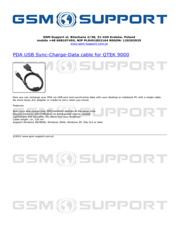 GSM-Support ul. Bitschana 2/38, 31-420 Kraków, Poland mobile +48 608107455, NIP PL9451852164 REGON: 120203925 www.gsm-support.com.pl PDA USB Sync-Charge-Data cable for QTEK 9000 Now you can recharge your PDA via USB port and synchronize data with your desktop or notebook PC with a single cable. No more bulky A/C adapter or cradle to carry when you travel. Features: Auto Sync and charge your PDA handheld devices at the same time. Directly connects with USB port, no extra power source needed. Lightweight and packable, fits easily into your briefcase Cable length: ca. 120 cm Support Windows 98/98ME, Windows 2000, Windows XP, Mac 8.6 or later ©2012 www.gsm-support.com.pl Powered by TCPDF (www.tcpdf.org)