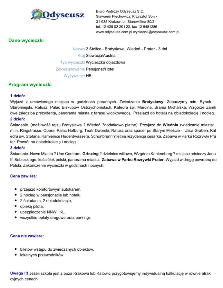 Biuro Podróży Odyseusz S.C. Sławomir Piechowicz, Krzysztof Sonik 31-035 Kraków, ul. Starowiślna 80/3 tel. 12 428 02 20 i 22, fax 12 6481286 www.odyseusz.com.pl [email protected] Dane wycieczki Nazwa 2 Stolice - Bratysława, Wiedeń - Prater - 3 dni Kraj Słowacja/Austria Typ wycieczki Wycieczka objazdowa Zakwaterowanie Pensjonat/Hotel Wyżywienie HB Program wycieczki 1 dzień: Wyjazd z umówionego miejsca w godzinach porannych. Zwiedzanie Bratysławy. Zobaczymy min. Rynek Staromiejski, Ratusz, Pałac Biskupów Ostrzychomskich, Katedra św. Marcina, Brama Michalska, Wzgórze Zamk owe (siedziba prezydenta, panorama miasta z tarasu widokowego). Przejazd do hotelu na obiadokolację i nocleg. 2 dzień: Śniadanie. (możliwość rejsu Bratysława ? Wiedeń ?dodatkowo płatne). Przyjazd do Wiednia zwiedzanie miasta: m.in. Ringstrasse, Opera, Pałac Hofburg, Teatr Dworski, Ratusz oraz spacer po Starym Mieście - Ulica Graben, Kat edra św. Stefana. Kamienice Huderdwassera, Schonbrunn ? letnia rezydencja cesarka. Zabawa w Parku Rozrywki Pra ter. Powrót na obiadokolację i nocleg. 3 dzień: Śniadanie. Nowe Miasto ? Uno Centrum, Grinzing ? dzielnica willowa, Wzgórze Kahlemberg ? miejsce odsieczy Jana III Sobieskiego, kościółek polski, panorama miasta. Zabawa w Parku Rozrywki Prater. Wyjazd w drogę powrotną do Polski. Zakończenie wycieczki w godzinach nocnych. Cena zawiera: przejazd komfortowym autokarem, 2 nocleg w pensjonacie lub hotelu, 2 śniadania, 2 obiadokolacje, opiekę pilota, ubezpieczenie NNW i KL, wszystkie opłaty drogowe oraz parkingi. Cena nie zawiera: biletów wstępu do zwiedzanych obiektów, lokalnych przewodników Uwaga !!! Jeżeli szkoła jest z poza Krakowa lub Katowic przygotowujemy indywidualną kalkulację w równie atrak cyjnych cenach. Gwarantujemy konkurencyjne ceny i dobrą jakość usług. Cena Miasto wyjazdu Katowice Kraków Rzeszów Cena w przypadku 30os. 615.00 zł 640.00 zł 695.00 zł Cena w przypadku 44os. 515.00 zł 535.00 zł 570.00 zł