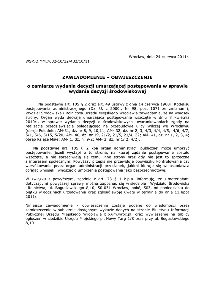 Wrocław, dnia 24 czerwca 2011r. WSR.O.MM.7682-10/32/482/10/11 ZAWIADOMIENIE – OBWIESZCZENIE o zamiarze wydania decyzji umarzającej postępowania w sprawie wydania decyzji środowiskowej Na podstawie art. 105 § 2 oraz art. 49 ustawy z dnia 14 czerwca 1960r. Kodeksu postępowania administracyjnego (Dz. U. z 2000r. Nr 98, poz. 1071 ze zmianami), Wydział Środowiska i Rolnictwa Urzędu Miejskiego Wrocławia zawiadamia, że na wniosek strony, Organ wyda decyzję umarzającą postępowanie wszczęte w dniu 8 kwietnia 2010r., w sprawie wydania decyzji o środowiskowych uwarunkowaniach zgody na realizację przedsięwzięcia polegającego na przebudowie ulicy Wilczej we Wrocławiu (obręb Południe: AM-31, dz. nr 8, 9, 10,11; AM- 32, dz. nr 2, 3, 4/3, 4/4, 4/5, 4/6, 4/7, 5/1, 5/6, 5/15, 5/20; AM- 40, dz. nr 19, 21/2, 21/5, 21/4, 22; AM- 41, dz. nr 1, 2, 3, 4; obręb Księże Małe: AM- 1, dz. nr 9/2; AM- 2, dz. nr 1/ 2, 4/2). Na podstawie art. 105 § 2 kpa organ administracji publicznej może umorzyć postępowanie, jeżeli wystąpi o to strona, na której żądanie postępowanie zostało wszczęte, a nie sprzeciwiają się temu inne strony oraz gdy nie jest to sprzeczne z interesem społecznym. Powyższy przepis nie przewiduje obowiązku kontrolowania czy weryfikowania przez organ administracji przesłanek, jakimi kieruje się wnioskodawca cofając wniosek i wnosząc o umorzenie postępowania jako bezprzedmiotowe. W związku z powyższym, zgodnie z art. 73 § 1 k.p.a. informuję, że z materiałami dotyczącymi powyższej sprawy można zapoznać się w siedzibie Wydziału Środowiska i Rolnictwa, ul. Bogusławskiego 8,10, 50-031 Wrocław, pokój 503, od poniedziałku do piątku w godzinach urzędowania oraz zgłosić swoje uwagi w terminie do dnia 11 lipca 2011r. Niniejsze zawiadomienie - obwieszczenie zostaje podane do wiadomości przez zamieszczenie w publicznie dostępnym wykazie danych na stronie Biuletynu Informacji Publicznej Urzędu Miejskiego Wrocławia bip.um.wroc.pl. oraz wywieszenie na tablicy ogłoszeń w siedzibie Urzędu Miejskiego pl. Nowy Targ 1/8 oraz przy ul. Bogusławskiego 8,10.