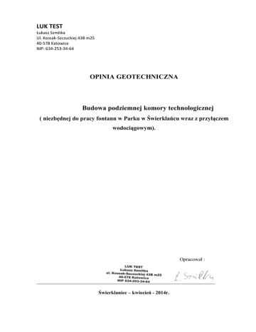 LUK TEST Łukasz Szmitka Ul. Kossak-Szczuckiej 43B m25 40-578 Katowice NIP: 634-253-34-64 OPINIA GEOTECHNICZNA Budowa podziemnej komory technologicznej ( niezbędnej do pracy fontann w Parku w Świerklańcu wraz z przyłączem wodociągowym). Opracował : Świerklaniec – kwiecień - 2014r. SPIS TREŚCI 1.WSTĘP 2. POŁOŻENIE I MORFOLOGIA 3. BUDOWA GEOLOGICZNA 4. WARUNKI WODNE 5. WNIOSKI 1 1. WSTĘP Niniejsze badanie geotechniczne zostało wykonane na zlecenie Firmy Park-M Sp. z o.o. ul. Piaski 12, 33-340 Stary Sącz NIP: 734-33-53-983 Przedmiotem opracowania jest teren pod budowę podziemnej komory technologicznej (wraz z przyłączem wodociągowym), niezbędnej do prawidłowego fukcjonowania fontann zlokalizowanych w Parku w Świerkalńcu. W udokumentowanych przekrojach poprzecznych wykonano 2 otwory badawcze do głębokości 4 m. 2. PODŁOŻE I MORFOLOGIA Badany teren obejmuje niewielki obszar w Parku w Świerklańcu, nieopodal isniejących fontann. Wykonane zostały dwa otwory badawcze, których celem było określenie rodzaju istniejących w podłożu warstw geotechnicznych. Otwór nr 1 i 2 zgodnie z załączoną mapką. Pod względem morfologicznym, jest to obszar Płaskowyżu Rybnickiego- pozostałość moreny dennej lodowca. 3. BUDOWA GEOLOGICZNA Pierwszą warstwę stanowi gleba brunatna wyługowana, przeważająca na terenie Płaskowyżu Rybnickiego, sięgająca głębokości 0,5 metra. Poniżej znajduję się jednorodna warstwa piasków średnioziarnistych (średniozagęszczonych, o stopniu zagęszczenia równym 0,65) ciągnąca się do końca głębokości wykonywanyh otworów. Nr warstwy Rodzaj Głeboko ść [m] Miąższość [m] I. Gleba 0,0 -0,5 0,5 brunatna II. Piasek średni 0,5 - 4,0 3,5 brązowożółta Barwa Stopień zagęszczenia ID 0,6 (średniozagęszczony) 2 4. WARUNKI WODNE Wykonane badania nie wykazały głębokości, na której znajduje się zwierciadło wód gruntowych – co jest jednoznaczne z jego wystepowaniem poniżej czwartego metra pod poziomem terenu, a których zasilanie odbywa się przez spływy z sąsiadującego jeziora. 5. WNIOSKI - Projektowana komora znajduje się na terenie o jednorodnej budowie geologicznej. Występujące w podłożu grunty to gleba brunatna oraz piaski średnie,średniozagęszczone. - Występujące tu grunty zaliczono prostych warunków gruntowych - Według katalogu KNR 2-01 gleba, piaski i żwiry zaliczane są do II kategorii urabialności - Sondowania nie wykazały zwierciadła wód gruntowych do głębokości czterech metrów. 3