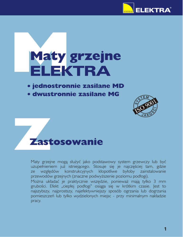 M Maty grzejne jednostronnie zasilane MD dwustronnie zasilane MG Z Zastosowanie Maty grzejne mog¹ s³u¿yæ jako podstawowy system grzewczy lub byæ uzupe³nieniem ju¿ istniej¹cego. Stosuje siê je najczêœciej tam, gdzie ze wzglêdów konstrukcyjnych k³opotliwe by³oby zainstalowanie przewodów grzejnych (znaczne podwy¿szenie poziomu pod³ogi). Mo¿na uk³adaæ je praktycznie wszêdzie, poniewa¿ maj¹ tylko 3 mm „ gruboœci. Efekt „ciep³ej pod³ogi osi¹ga siê w krótkim czasie. Jest to najszybszy, najprostszy, najefektywniejszy sposób ogrzania lub dogrzania pomieszczeñ lub tylko wydzielonych miejsc - przy minimalnym nak³adzie pracy. 1 Z Zalety PROSTY MONTA¯ maty grzejne przykleja siê bezpoœrednio na odpowiednio przygotowanym pod³o¿u za pomoc¹ kleju do terakoty wyj¹tkowo prosty i szybki sposób instalowania systemu grzejnego KOMFORT U¯YTKOWANIA ca³a obs³uga ogranicza siê do ustawienia odpowiedniej temperatury za pomoc¹ regulatora temperatury równomierna temperatura w ca³ym pomieszczeniu niska temperatura powierzchni grzejnej (tj. pod³ogi) ciep³a, sucha posadzka w krótkim czasie ca³kowicie niewidoczna instalacja grzewcza BEZPIECZEÑSTWO przewód grzejny maty jest na ca³ej d³ugoœci ekranowany i uziemiony lub zerowany po³¹czenie przewodu przez wy³¹cznik ró¿nicowopr¹dowy eliminuje wszelkie zagro¿enia NISKIE KOSZTY wyj¹tkowo niski koszt instalacji systemu niskie koszty eksploatacji - dziêki ³atwoœci regulacji temperatury, ogrzewa siê tylko te powierzchnie i tylko wtedy, gdy mamy tak¹ potrzebê KONSERWACJA ten problem nie istnieje GWARANCJA 10 lat 2 C Charakterystyka Maty grzejne ELEKTRA produkowane s¹ w gotowych zestawach przygotowanych do bezpoœredniego u³o¿enia. Rozró¿niamy maty grzejne jednostronnie i dwustronnie zasilane. Maty grzejne jednostronnie zasilane dziêki swojej budowie s¹ prostsze w uk³adaniu i monta¿u. Maty dwustronnie zasilane s¹ cieñsze. Przewód grzejny przymocowany jest do siatki z tworzywa sztucznego. Przewód grzejny zakoñczony jest oryginalnie po³¹czonym 4-metrowym przewodem ,,zimnym’’. Istnieje mo¿liwoœæ instalowania dwóch lub wiêkszej iloœci mat w jednym pomieszczeniu. W takim przypadku maty nale¿y po³¹czyæ równolegle. Dotyczy to przede wszystkim du¿ych pomieszczeñ. UWAGA: Po³¹czenie równoleg³e dwóch lub wiêkszej iloœci mat powinno byæ poprzedzone doprowadzeniem wszystkich przewodów ,,zimnych’’ do puszki instalacyjnej. Niedopuszczalne jest wykonywanie takich po³¹czeñ i umieszczanie ich pod posadzk¹. UWAGA: W opakowaniu oprócz maty grzejnej znajduj¹ sie dwa odcinki rurki ochronnej typu peszel oraz pog³êbiona puszka instalacyjna. 3 W Wybór w³aœciwej mocy jednostkowej W zale¿noœci od zastosowania oraz rodzaju pomieszczenia nale¿y wybraæ maty o mocy jednostkowej 100W/m2 lub 160W/m2. W³aœciwy dobór ilustruje tabela 1. Tabela 1. KUCHNIA / £AZIENKA POWIERZCHNIA GRZEJNA < 3/4 POWIERZCHNI CA£KOWITEJ POWIERZCHNIA GRZEJNA > 3/4 POWIERZCHNI CA£KOWITEJ POZOSTA£E POMIESZCZENIA Ogrzewanie 100W/m2 160W/m2 Dogrzewanie 100W/m2 UWAGA: W razie jakichkolwiek w¹tpliwoœci prosimy o kontakt z dzia³em technicznym naszej firmy. 4 D Dane techniczne MATY GRZEJNE ELEKTRA MG - dwustronnie zasilane Tabela 2. 100 W/m2 RODZAJ WYMIARY POWIERZCHNIA MOC - mxm m2 W MG100/1,0 MG100/1,5 MG100/2,0 MG100/2,5 MG100/3,0 MG100/3,5 MG100/4,5 MG100/5,0 MG100/6,0 MG100/8,0 MG100/9,0 MG100/10,0 MG100/12,0 0,5 x 2,0 0,5 x 3,0 0,5 x 4,0 0,5 x 5,0 0,5 x 6,0 0,5 x 7,0 0,5 x 9,0 0,5 x 10,0 0,5 x 12,0 0,5 x 16,0 0,5 x 18,0 0,5 x 20,0 0,5 x 24,0 1,00 1,50 2,00 2,50 3,00 3,50 4,50 5,00 6,00 8,00 9,00 10,00 12,00 100 150 200 250 300 350 450 500 600 800 900 1000 nowoœæ! 1200 nowoœæ! Tabela 3. 160 W/m2 RODZAJ WYMIARY POWIERZCHNIA - mxm m2 MG160/1,0 MG160/1,5 MG160/2,0 MG160/2,5 MG160/3,0 MG160/3,5 MG160/4,0 MG160/5,0 MG160/6,0 MG160/7,0 MG160/8,0 MG160/9,0 MG160/10 0,5 x 2,0 0,5 x 3,0 0,5 x 4,0 0,5 x 5,0 0,5 x 6,0 0,5 x 7,0 0,5 x 8,0 0,5 x 10,0 0,5 x 12,0 0,5 x 14,0 0,5 x 16,0 0,5 x 18,0 0,5 x 20,0 1,00 1,50 2,00 2,50 3,00 3,50 4,00 5,00 6,00 7,00 8,00 9,00 10,00 MOC W 160 240 320 400 480 560 640 800 960 1120 1280 nowoœæ! 1440 nowoœæ! 1600 nowoœæ! 5 MATY GRZEJNE ELEKTRA MD - jednostronnie zasilane Tabela 4. 100 W/m2 RODZAJ WYMIARY POWIERZCHNIA - mxm m2 0,5 x 2,0 0,5 x 3,0 0,5 x 4,0 0,5 x 5,0 0,5 x 6,0 0,5 x 7,0 0,5 x 8,0 0,5 x 9,0 0,5 x 10,0 0,5 x 12,0 0,5 x 16,0 0,5 x 20,0 1,00 1,50 2,00 2,50 3,00 3,50 4,00 4,50 5,00 6,00 8,00 10,00 MD100/1,0 MD100/1,5 MD100/2,0 MD100/2,5 MD100/3,0 MD100/3,5 MD100/4,0 MD100/4,5 MD100/5,0 MD100/6,0 MD100/8,0 MD100/10,0 MOC W 100 150 200 250 300 350 400 450 500 600 800 nowoœæ! 1000 nowoœæ! Tabela 5. 160 W/m2 RODZAJ WYMIARY POWIERZCHNIA MOC - mxm m2 W MD160/1,0 MD160/1,5 MD160/2,0 MD160/2,5 MD160/3,0 MD160/3,5 MD160/4,0 MD160/4,5 MD160/5,0 MD160/6,0 MD160/7,0 MD160/8,0 0,5 x 2,0 0,5 x 3,0 0,5 x 4,0 0,5 x 5,0 0,5 x 6,0 0,5 x 7,0 0,5 x 8,0 0,5 x 9,0 0,5 x 10,0 0,5 x 12,0 0,5 x 14,0 0,5 x 16,0 1,00 1,50 2,00 2,50 3,00 3,50 4,00 4,50 5,00 6,00 7,00 8,00 160 240 320 400 480 560 640 720 800 960 1120 1280 nowoœæ! nowoœæ! nowoœæ! nowoœæ! UWAGA: Przewody grzejne do mat s¹ wykonane na napiêcie znamionowe 230V/50 Hz. 6 R Regulacja temperatury Nieodzownym elementem systemu ogrzewania pod³ogowego jest regulator temperatury. Umo¿liwia on w³aœciw¹ pracê mat grzejnych. Wybór odpowiedniego typu regulatora temperatury zapewnia optymalny efekt grzewczy, zgodny z oczekiwaniami u¿ytkowników. Je¿eli maty grzejne s¹ jedynie uzupe³nieniem istniej¹cego ju¿ (podstawowego) „ systemu grzewczego, to u¿ytkownika interesuje efekt tzw. „ciep³ej pod³ogi (np. dogrzanie ³azienki) - wówczas nale¿y zastosowaæ regulatory temperatury z czujnikiem pod³ogowym. Czujnik pod³ogowy pozwala na utrzymanie po¿¹danej temperatury pod³ogi. Je¿eli maty grzejne s¹ podstawowym Ÿród³em ogrzewania, to u¿ytkownika interesuje uzyskanie optymalnej temperatury powietrza w pom