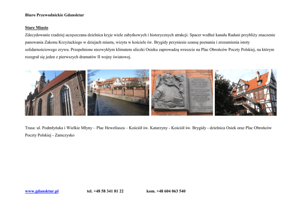 Biuro Przewodnickie Gdansktur Stare Miasto Zdecydowanie rzadziej uczęszczana dzielnica kryje wiele zabytkowych i historycznych atrakcji. Spacer wzdłuż kanału Raduni przybliży znaczenie panowania Zakonu Krzyżackiego w dziejach miasta, wizyta w kościele św. Brygidy przyniesie szansę poznania i zrozumienia istoty solidarnościowego zrywu. Przepełnione niezwykłym klimatem uliczki Osieku zaprowadzą wreszcie na Plac Obrońców Poczty Polskiej, na którym rozegrał się jeden z pierwszych dramatów II wojny światowej. Trasa: ul. Podmłyńska i Wielkie Młyny – Plac Heweliusza – Kościół św. Katarzyny - Kościół św. Brygidy - dzielnica Osiek oraz Plac Obrońców Poczty Polskiej - Zamczysko www.gdansktur.pl tel. +48 58 341 81 22 kom. +48 604 063 540