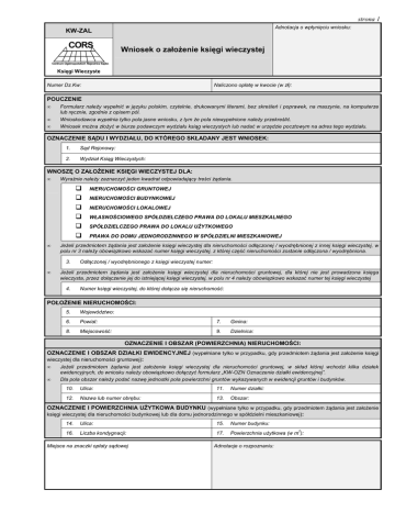 strona 1 Adnotacja o wpłynięciu wniosku: KW-ZAL CORS Wniosek o założenie księgi wieczystej Centrum Ogólnopolskich Rejestrów Sądow Księgi Wieczyste Numer Dz.Kw: Naliczono opłatę w kwocie (w zł): POUCZENIE • • • Formularz należy wypełnić w języku polskim, czytelnie, drukowanymi literami, bez skreśleń i poprawek, na maszynie, na komputerze lub ręcznie, zgodnie z opisem pól. Wnioskodawca wypełnia tylko pola jasne wniosku, z tym że pola niewypełnione należy przekreślić. Wniosek można złożyć w biurze podawczym wydziału ksiąg wieczystych lub nadać w urzędzie pocztowym na adres tego wydziału. OZNACZENIE SĄDU I WYDZIAŁU, DO KTÓREGO SKŁADANY JEST WNIOSEK: 1. Sąd Rejonowy: 2. Wydział Ksiąg Wieczystych: WNOSZĘ O ZAŁOŻENIE KSIĘGI WIECZYSTEJ DLA: • Wyraźnie należy zaznaczyć jeden kwadrat odpowiadający treści żądania. NIERUCHOMOŚCI GRUNTOWEJ NIERUCHOMOŚCI BUDYNKOWEJ NIERUCHOMOŚCI LOKALOWEJ WŁASNOŚCIOWEGO SPÓŁDZIELCZEGO PRAWA DO LOKALU MIESZKALNEGO SPÓŁDZIELCZEGO PRAWA DO LOKALU UŻYTKOWEGO PRAWA DO DOMU JEDNORODZINNEGO W SPÓŁDZIELNI MIESZKANIOWEJ • Jeżeli przedmiotem żądania jest założenie księgi wieczystej dla nieruchomości odłączonej / wyodrębnionej z innej księgi wieczystej, w polu nr 3 należy obowiązkowo wskazać numer księgi wieczystej, z której część nieruchomości zostanie odłączona / wyodrębniona. 3. • Odłączonej / wyodrębnionego z księgi wieczystej numer: Jeżeli przedmiotem żądania jest założenie księgi wieczystej dla nieruchomości gruntowej, dla której nie jest prowadzona księga wieczysta, przez dołączenie jej do istniejącej księgi wieczystej, w polu nr 4 należy obowiązkowo wskazać numer tej księgi wieczystej 4. Numer księgi wieczystej, do której dołącza się nieruchomość: POŁOŻENIE NIERUCHOMOŚCI: 5. Województwo: 6. Powiat: 7. Gmina: 8. Miejscowość: 9. Dzielnica: OZNACZENIE I OBSZAR (POWIERZCHNIA) NIERUCHOMOŚCI: OZNACZENIE I OBSZAR DZIAŁKI EWIDENCYJNEJ (wypełniane tylko w przypadku, gdy przedmiotem żądania jest założenie księgi wieczystej dla nieruchomości gruntowej): • • Jeżeli przedmiotem żądania jest założenie księgi wieczystej dla nieruchomości gruntowej, w skład której wchodzi kilka działek ewidencyjnych, do wniosku należy obowiązkowo dołączyć formularz „KW-OZN Oznaczenie działki ewidencyjnej”. Dla pola obszar należy podać nazwę jednostki pola powierzchni gruntów wykazywanych w ewidencji gruntów i budynków. 10. Ulica: 11. Numer działki: 12. Nazwa lub numer obrębu: 13. Obszar: OZNACZENIE I POWIERZCHNIA UŻYTKOWA BUDYNKU (wypełniane tylko w przypadku, gdy przedmiotem żądania jest założenie księgi wieczystej dla nieruchomości budynkowej lub dla domu jednorodzinnego w spółdzielni mieszkaniowej): 14. Ulica: 15. Numer budynku: 16. Liczba kondygnacji: 17. Powierzchnia użytkowa (w m ): Miejsce na znaczki opłaty sądowej Adnotacje o rozpoznaniu: 2 strona 2 OZNACZENIE I OBSZAR (POWIERZCHNIA) NIERUCHOMOŚCI (c.d.): OZNACZENIE I POWIERZCHNIA UŻYTKOWA LOKALU (wypełniane tylko w przypadku, gdy przedmiotem żądania jest założenie księgi wieczystej dla nieruchomości lokalowej, własnościowego spółdzielczego prawa do lokalu mieszkalnego lub spółdzielczego prawa do lokalu użytkowego): • Pole nr 24 należy wypełnić tylko w przypadku, gdy przedmiotem żądania jest założenie księgi wieczystej dla nieruchomości lokalowej. 18. Ulica: 19. Numer budynku: 20. Numer lokalu: 21. Kondygnacja: 22. Powierzchnia użytkowa lokalu wraz z powierzchnią pomieszczeń przynależnych (w m ): 23. Rodzaj i liczba izb wchodzących w skład lokalu oraz pomieszczeń przynależnych do lokalu: 24. Wielkość udziału w nieruchomości wspólnej lub w prawie użytkowania wieczystego i prawie własności wspólnych części budynku: 2 NA PODSTAWIE ZAŁĄCZONYCH DOKUMENTÓW WNOSZĘ O WPIS: • Do wniosku należy obowiązkowo dołączyć formularz „KW-ZAD Żądanie wpisu w księdze wieczystej”, jeżeli w zakładanej księdze wieczystej: ▫ ▫ ma być ujawniony budynek i / lub urządzenie (dotyczy tylko księgi zakładanej dla nieruchomości gruntowej); ma być ujawnionych więcej niż dwóch współwłaścicieli lub współuprawnionych lub ma być ujawniony więcej niż jeden właściciel i jeden użytkownik wieczysty; mają zostać ujawnione prawa (inne niż własność, użytkowanie wieczyste, własnościowe spółdzielcze prawo do lokalu mieszkalnego, spółdzielcze prawo do lokalu użytkowego, prawo do domu jednorodzinnego w spółdzielni mieszkaniowej), roszczenia, ograniczenia w rozporządzaniu nieruchomością, hipoteki. ▫ WŁAŚCICIELA / UŻYTKOWNIKA WIECZYSTEGO / UPRAWNIONEGO*): • • W żądaniu powinno się w szczególności określić rodzaj przysługującego podmiotowi prawa, wpisać imię i nazwisko lub nazwę / firmę i siedzibę oraz określić wielkość przysługującego udziału w prawie. Jeżeli wnioskodawca żąda ujawnienia w księdze wieczystej kilku współwłaścicieli nieruchomości, współużytkowników wieczystych lub współuprawnionych z tytułu własnościowego spółdzielczego prawa do lokalu mieszkalnego, spółdzielczego prawa do lokalu użytkowego lub prawa do domu jednorodzinnego w spółdzielni mieszkaniowej, każdego z nich należy wskazać w osobnej rubryce. W jednej rubryce należy wskazać współmałżonków, którym przysługuje dane prawo na zasadzie wspólności ustawowej lub umownej małżeńskiej oraz spółki jawne i wspólników spółek cywilnych, którym przysługuje dane prawo na zasadzie współwłasności łącznej. 25. Wartość przedmiotu żądania (w zł): 26. Treść żądania: 27. Treść żądania: NUMER KSIĘGI WIECZYSTEJ (ZBIORU DOKUMENTÓW): • W polu nr 28 należy wpisać numer księgi lub numer zbioru, jeżeli dla nieruchomości (własnościowego spółdzielczego prawa do lokalu mieszkalnego, spółdzielczego prawa do lokalu użytkowego lub prawa do domu jednoro