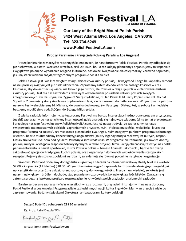 Our Lady of the Bright Mount Polish Parish 3424 West Adams Blvd, Los Angeles, CA 90018 Tel: 323-734-5249 www.PolishFestivalLA.com Drodzy Parafianie i Przyjaciele Polskiej Parafii w Los Angeles! Proszę koniecznie zaznaczyć w rodzinnych kalendarzach, że nasz doroczny Polski Festiwal Parafialny odbędzie się już niebawem, w ostatni weekend września, czyli 29-30.IX. br. Po raz kolejny planujemy i organizujemy to wspaniałe i wyjątkowe polonijne wydarzenie religijno-kulturalne, dosłowne świętowanie dla całej rodziny. Zarówno najmłodsi, jak i najstarsi wiekiem znajdą w tegorocznym programie coś dla siebie! Polski Festiwal jest wielkim świętem wiary i dziedzictwa kultury polskiej. Trwający od lutego br. kapitalny remont naszej polskiej świątyni jest już bliski ukończenia. Zapraszamy zatem do odwiedzenia naszego kościoła w czas Festiwalu, aby dowiedzieć się więcej nie tylko o jego historii, ale również o religii i jej roli w kształtowaniu historii i kultury polskiej. Jest dla nas zaszczytem i łaskawym wyróżnieniem posiadanie relikwii polskich świętych i błogosławionych: św. Faustyna, św. Zygmunt Szczęsny-Feliński, bł. Jan Paweł II, bł. Jerzy Popiełuszko i bł. Michał Sopoćko. Z pewnością staną się dla nas orędownikami łask, ale też wzorem do naśladowania. W tym roku, za patrona naszego Festiwalu obieramy bł. Michała, kierownika duchowego św. Faustyny. Dlatego też, w sobotę i w niedzielę będziemy modlić się o godz.3:00pm do Bożego Miłosierdzia. Z wielką radością informujemy, że tegoroczny Festiwal ma bardzo interesujący i różnorodny program artystyczny. Juz dziś zapraszamy do naszej witryny internetowej, gdzie znajdują się najnowsze wiadomości na temat przygotowań i przebiegu naszego festiwalu: www.PolishFestivalLA.com. Jest już naszą tradycją, ze zapraszamy na nasze świętowanie utalentowanych polskich i zagranicznych artystów, m.in. Violetta Brzezińska, wokalistka, laureatka programu “Szansa na sukces”, czy miejscowa piosenkarka Eva Angeli. Kulminacyjnym punktem programu sobotniego wieczoru będzie multimedialny koncert brytyjskiego artysty (solisty legendy muzyki rockowej lat 80-tych, zespołu Classix Nouveaux!) Sal Solo pod tytułem: Wołamy o sprawiedliwość. W programie nie zabraknie, jak zawsze dobrej, polskiej muzyki i występów zespołów folklorystycznych, a także projekcji filmu. Swoją obecnością zaszczyci nas polski parlamentarzysta, a nawet sportowiec, mistrz Polski w boksie – Tomasz Adamek. Jak co roku, będzie też okazja zakosztować specjałów tradycyjnej kuchni polskiej oraz wspaniałych domowych wypieków wedle staropolskich receptur. Pojawią się stoiska z polskimi wyrobami, zareklamują się również polonijne instytucje i organizacje. Szanowni Państwo! Dodajemy do tego listu książeczkę z biletami na loterię festiwalową. Każdy bilet ma wartość $2.00 a książeczka (11 biletów) $20.00. W tym roku można wygrać naprawdę bardzo wiele atrakcyjnych nagród, jak np. certyfikaty na przeróżne usługi, sprzęt sportowy czy domowego użytku. Trzeba nam wiedzieć, ze loteria jest naszym największym źródłem dochodu, stąd pragniemy rozprowadzić jak największą ilość biletów. Zwracam się zatem z serdeczną i pokorną prośbą o rozprowadzenie ich wśród swoich przyjaciół, znajomych i sąsiadów. Bardzo serdecznie zapraszamy Was wszystkich wraz z rodzinami, przyjaciółmi i znajomymi na nasz doroczny Polski Festiwal w Los Angeles! Przyprowadźcie też ludzi innych nacji, kultur i języków. Mamy im przecież wiele do zaprezentowania. Bądźmy świadkami Chrystusa i ambasadorami kultury polskiej! Szczęść Boże! Do zobaczenia 29 i 30 września! Ks. Prob. Rafał Dyguła TChr wraz z Komitetem Festiwalowym