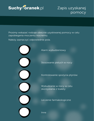 Zapis uzyskanej pomocy Prosimy wskazać rodzaje obecnie uzyskiwanej pomocy w celu zapobiegania moczeniu nocnemu. Należy zaznaczyć odpowiednie pola. Alarm wybudzeniowy Stosowanie pieluch w nocy Kontrolowanie spożycia płynów Wybudzanie w nocy w celu skorzystania z toalety Leczenie farmakologiczne Inne