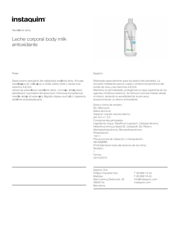 Nawilżanieskóry Lechecorporalbodymilk antioxidante Polski Español Opracowanespecjalniedlanajbardziejwrażliwejskóry.Emulsja nawilżającadociałaączywsobiezaletyoliwkizoliwekoraz witaminyA,E,D,K. Utrzymujeprawidłowenawilżenieskóry,chroniącskóręprzed szkodliwymiczynnikamiklimatycznymi.Kremowakonsystencja nawilżaskóręodwewnątrz,łagodziobjawysuchoś ciizapewnia działanieantyoksydacyjne. Elaboradaespecialmenteparalaspielesmássensibles.La emulsiónhidratanteparaelcuerpocombinalosbeneficiosdel aceitedeolivaylasvitaminasA,E,D,K. Mantienelapielhidratada,protegiendolacapasuperficialdelos agentesclimáticosexternos.Sufórmulacremosahidratadesde elinterior,aliviandolasensibilidaddelapielseca, proporcionandounefectoantioxidante. Dosisyformadeempleo: Seutilizapuro. Datostécnicos: Aspecto:Líquidoviscosoblanco. pH:6.0+/-0.5 Componentesprincipales: Ingredients:Aqua,ParaffinumLiquidum,CetearylAlcohol, HelianthusAnnuusSeedOil,Ceteareth-20,Parfum, Methylisothiazolinone,Benzisothiazolinone. Presentación: 12x1l. Precaucionesdeutilizaciónomanipulación: NOINGERIR P102Mantenerfueradelalcancedelosniños. Revisión:: 1 Fecha:: 22/10/2015 DetervicS.A. PolígonIndustrialCan Malloles SantLlorençDesmunts,32 08500Vic Barcelona T938891344 F938891640 [email protected] instaquim.com