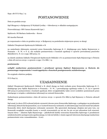 Sygn. akt II Cz 844 / 13 POSTANOWIENIE Dnia 20 grudnia 2013r. Sąd Okręgowy w Bydgoszczy II Wydział Cywilny – Odwoławczy w składzie następującym: Przewodniczący: SSO Janusz Kasnowski (spr.) Sędziowie: SO Barbara Jankowska – Kocon SO Aurelia Pietrzak po rozpoznaniu w dniu 20 grudnia 2013r. w Bydgoszczy na posiedzeniu niejawnym sprawy ze skargi Zakładu Ubezpieczeń Społecznych Oddziału w B. na zaniechanie dokonania czynności przez Komornika Sądowego K. C. działającego przy Sądzie Rejonowym w Poznaniu – N. W. w P. tj. nie wydanie postanowienia o kosztach egzekucji w sprawie prowadzonej przeciwko dłużnikowi Ł. N. (1) o sygn. KM 5024 /10 na skutek zażalenia Zakładu Ubezpieczeń Społecznych Oddziału w B. na postanowienie Sądu Rejonowego w Świeciu z dnia 28 czerwca 2013r. w sprawie o sygn. I Co 886 / 13 postanawia: uchylić zaskarżone postanowienie i przekazać sprawę Sądowi Rejonowemu w Świeciu do ponownego rozpoznania i rozstrzygnięcia o kosztach postępowania zażaleniowego. Na oryginale właściwe podpisy. II Cz 844/13 UZASADNIENIE Zakład Ubezpieczeń Społecznych Oddział w B. złożył skargę na brak wydania przez Komornika Sądowego K. C. działającego przy Sądzie Rejonowym w Poznaniu – N. W., i prowadzącego egzekucję wobec Ł. N. (2) w sprawie KM 5024/10 postanowienia o kosztach egzekucji, które uwzględniałoby także zwrot wydatków poniesionych przez skarżącego w związku z udzieleniem informacji na wniosek Komornika. Zaskarżonym postanowieniem z dnia 28 czerwca 2013r. w sprawie ICo 886/13 Sąd Rejonowy w Świeciu odrzucił skargę. Sąd uznał, że skoro ZUS wykonał jedynie czynności zlecone przez Komornika Sądowego, a polegające na przekazaniu informacji, których był dysponentem, za co wystawił stosowny rachunek, to adresatem jego roszczeń może być jedynie Komornik, który zlecił skarżącemu wykonanie czynności. Dla uprawnień skarżącego obojętne jest przy tym, czy Komornik uwzględni wszystkie koszty w swoich orzeczeniach czy też nie, bo nie on jest adresatem tych orzeczeń. Innymi słowy – zdaniem Sądu Rejonowego – jakiekolwiek byłoby orzeczenia Komornika Sądowego w przedmiocie ustalenia kosztów postępowania egzekucyjnego, to i tak nie byłoby w stanie zagrozić interesom skarżącego (zaskarżone postanowienie wraz z uzasadnieniem – k.20). W zażaleniu na postanowienie Zakład Ubezpieczeń Społecznych Oddział w B. domagał się jego uchylenia i przekazania sprawy Sądowi Rejonowemu do ponownego rozpoznania i rozstrzygnięcia także o kosztach postępowania zażaleniowego. W uzasadnieniu zażalenia skarżący wywodził, że obowiązek uiszczenia opłaty za udzielenie przez niego informacji powstał w toku postępowania egzekucyjnego co sprawia, że koszty obejmujące te opłaty należy uznać za składnik kosztów postępowania egzekucyjnego, które ostatecznie ustala Komornik w odrębnym postanowieniu (art.770 kpc). Takie postanowienia podlegają zaskarżeniu w drodze skargi złożonej w trybie art.7671 kpc. Dotyczy to także sytuacji, gdy Komornik zaniecha dokonania czynności (tu wydania takiego postanowienia). Zdaniem skarżącego Komornik powinien był uiścić mu należna opłatę za udzielenie informacji, zgodnie z rachunkiem, a następnie rozliczyć ten koszt w postanowieniu kończącym sprawę. Jeżeli kwestionowałby zasadność uiszczenia takiej opłaty na rzecz skarżącego, to powinien był dać temu wyraz w osobnym postanowieniu, które podlega doręczeniu stronom postępowania egzekucyjnego i ZUS. W ten sposób otwiera się ZUS możliwość kwestionowania wysokości opłaty należnej za udzielenie informacji w drodze wniesienia skargi na czynność komornika (zażalenie – k.24 do 26). Sąd Okręgowy zważył, co następuje: Zażalenie podgalało uwzględnieniu. Zasadą jest, że celowe koszty egzekucyjne powinny być ustalone w postępowaniu egzekucyjnym, z którego wynikły i nie mogą być ustalane w innym postępowaniu (por. stanowisko wyrażone w wyroku Sądu Najwyższego z dnia 14.06.1973r. w sprawie I CR 250/73, które zachowuje nadal aktualność). Oczywiste jest, że wydatki, które komornik musi ponieść w celu uzyskania określonych informacji (w tym przypadku z ZUS) stanowią element kosztów egzekucji (zgodnie z art.39 ust.2 pkt 7 ustawy z dnia 29.08.1997r. o komornikach sądowych i egzekucji – j.t. w Dz.U. 231 z 2011r. poz.1376 ze zm.). Winny być zatem rozliczone poprzez ich uwzględnienie w całości lub w części albo ich nieuwzględnienie w drodze wydania stosownego postanowienia (jak wymaga art.770 kpc). Skoro w tym wypadku komornik nie wydał postanowienia, to zainteresowanemu (tu ZUS) przysługuje skarga na zaniechanie przez niego dokonania czynności. Skarga jest bowiem podstawowym środkiem zaskarżenia w postępowaniu egzekucyjnym wszelkich czynności komornika zarówno rozstrzygających, jak i faktycznych oraz daje możliwość zaskarżenia zaniechania dokonania przez niego czynności, do których jest zobowiązany. Zatem rację ma skarżący, że komornik powinien był w ramach wydatków uiścić opłaty należne ZUS za udzielone informacje a następnie uwzględnić je w ostatecznym rozliczeniu kosztów egzekucji albo też w rozliczeniu tych kosztów odmówić ZUS ich przyznania w całości albo w części, co stworzyłoby zainteresowanemu możliwość zaskarżenia orzeczenia komornika w drodze wniesienia skargi. Przyjęcie zapatrywania Sądu Rejonowego oznaczałoby, że w każdym przypadku, gdy komornik zaniechałby uiszczenia ZUS stosownych opłat za udzielone informacje, ten musiałby wystąpić na drogę sądową ze odpowiednim roszczeniem w postępowaniu procesowym, do czego brak jest podstaw prawnych. Z tych zasadniczych przyczyn Sąd odwoławczy uchylił zaskarżone postanowienie i przekazał sprawę Sadowi Rejonowemu w Świeciu do ponownego rozpoznania i rozstrzygnięcia też o kosztach postępowania zażaleniowego (na podstawie art.3864 kpc w związ
