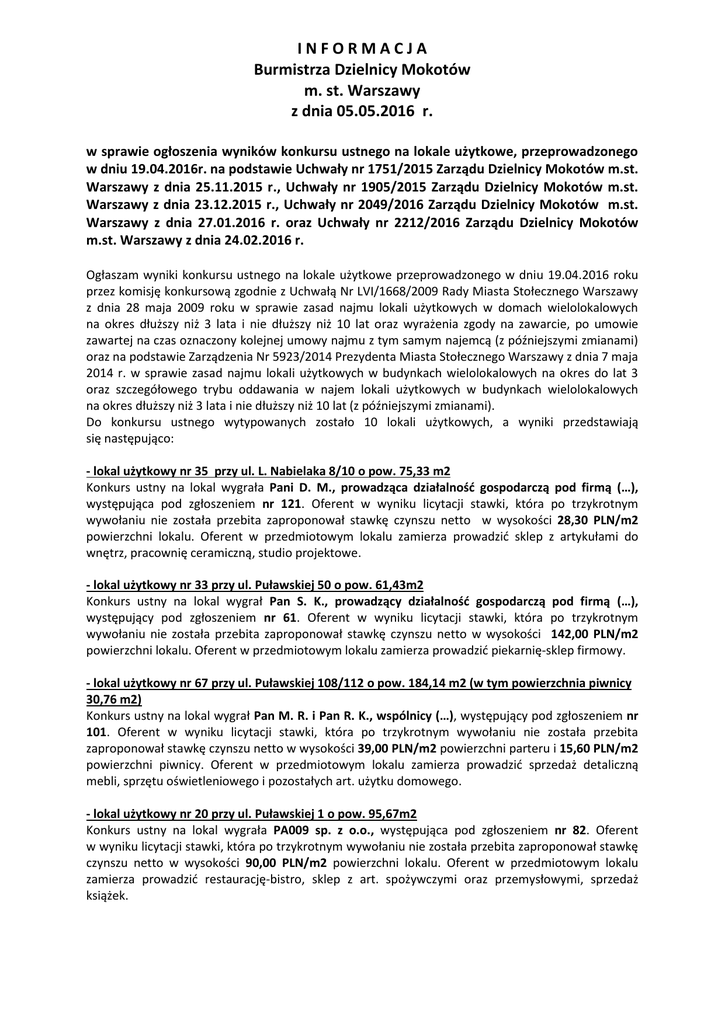 INFORMACJA Burmistrza Dzielnicy Mokotów m. st. Warszawy z dnia 05.05.2016 r. w sprawie ogłoszenia wyników konkursu ustnego na lokale użytkowe, przeprowadzonego w dniu 19.04.2016r. na podstawie Uchwały nr 1751/2015 Zarządu Dzielnicy Mokotów m.st. Warszawy z dnia 25.11.2015 r., Uchwały nr 1905/2015 Zarządu Dzielnicy Mokotów m.st. Warszawy z dnia 23.12.2015 r., Uchwały nr 2049/2016 Zarządu Dzielnicy Mokotów m.st. Warszawy z dnia 27.01.2016 r. oraz Uchwały nr 2212/2016 Zarządu Dzielnicy Mokotów m.st. Warszawy z dnia 24.02.2016 r. Ogłaszam wyniki konkursu ustnego na lokale użytkowe przeprowadzonego w dniu 19.04.2016 roku przez komisję konkursową zgodnie z Uchwałą Nr LVI/1668/2009 Rady Miasta Stołecznego Warszawy z dnia 28 maja 2009 roku w sprawie zasad najmu lokali użytkowych w domach wielolokalowych na okres dłuższy niż 3 lata i nie dłuższy niż 10 lat oraz wyrażenia zgody na zawarcie, po umowie zawartej na czas oznaczony kolejnej umowy najmu z tym samym najemcą (z późniejszymi zmianami) oraz na podstawie Zarządzenia Nr 5923/2014 Prezydenta Miasta Stołecznego Warszawy z dnia 7 maja 2014 r. w sprawie zasad najmu lokali użytkowych w budynkach wielolokalowych na okres do lat 3 oraz szczegółowego trybu oddawania w najem lokali użytkowych w budynkach wielolokalowych na okres dłuższy niż 3 lata i nie dłuższy niż 10 lat (z późniejszymi zmianami). Do konkursu ustnego wytypowanych zostało 10 lokali użytkowych, a wyniki przedstawiają się następująco: - lokal użytkowy nr 35 przy ul. L. Nabielaka 8/10 o pow. 75,33 m2 Konkurs ustny na lokal wygrała Pani D. M., prowadząca działalność gospodarczą pod firmą (…), występująca pod zgłoszeniem nr 121. Oferent w wyniku licytacji stawki, która po trzykrotnym wywołaniu nie została przebita zaproponował stawkę czynszu netto w wysokości 28,30 PLN/m2 powierzchni lokalu. Oferent w przedmiotowym lokalu zamierza prowadzić sklep z artykułami do wnętrz, pracownię ceramiczną, studio projektowe. - lokal użytkowy nr 33 przy ul. Puławskiej 50 o pow. 61,43m2 Konkurs ustny na lokal wygrał Pan S. K., prowadzący działalność gospodarczą pod firmą (…), występujący pod zgłoszeniem nr 61. Oferent w wyniku licytacji stawki, która po trzykrotnym wywołaniu nie została przebita zaproponował stawkę czynszu netto w wysokości 142,00 PLN/m2 powierzchni lokalu. Oferent w przedmiotowym lokalu zamierza prowadzić piekarnię-sklep firmowy. - lokal użytkowy nr 67 przy ul. Puławskiej 108/112 o pow. 184,14 m2 (w tym powierzchnia piwnicy 30,76 m2) Konkurs ustny na lokal wygrał Pan M. R. i Pan R. K., wspólnicy (…), występujący pod zgłoszeniem nr 101. Oferent w wyniku licytacji stawki, która po trzykrotnym wywołaniu nie została przebita zaproponował stawkę czynszu netto w wysokości 39,00 PLN/m2 powierzchni parteru i 15,60 PLN/m2 powierzchni piwnicy. Oferent w przedmiotowym lokalu zamierza prowadzić sprzedaż detaliczną mebli, sprzętu oświetleniowego i pozostałych art. użytku domowego. - lokal użytkowy nr 20 przy ul. Puławskiej 1 o pow. 95,67m2 Konkurs ustny na lokal wygrała PA009 sp. z o.o., występująca pod zgłoszeniem nr 82. Oferent w wyniku licytacji stawki, która po trzykrotnym wywołaniu nie została przebita zaproponował stawkę czynszu netto w wysokości 90,00 PLN/m2 powierzchni lokalu. Oferent w przedmiotowym lokalu zamierza prowadzić restaurację-bistro, sklep z art. spożywczymi oraz przemysłowymi, sprzedaż książek. - lokal użytkowy nr 15 przy ul. J. Dąbrowskiego 40 o pow. 75,54 m2 (w tym powierzchnia piwnicy 14,32 m2) Konkurs ustny na lokal wygrała Pani M. D.-L., występująca pod zgłoszeniem nr 2. Oferent w wyniku licytacji stawki, która po trzykrotnym wywołaniu nie została przebita zaproponował stawkę czynszu netto w wysokości 26,00 PLN/m2 powierzchni lokalu. Oferent w przedmiotowym lokalu zamierza prowadzić działalność gastronomiczną, kawiarnię-czekoladziarnię. - lokal użytkowy nr U-7 przy ul. Dolnej 21B o pow. 65,40 m2 Konkurs ustny na lokal wygrała Pani M. P., prowadząca działalność gospodarczą pod firmą (…), występująca pod zgłoszeniem nr 41. Oferent w wyniku licytacji stawki, która po trzykrotnym wywołaniu nie została przebita zaproponował stawkę czynszu netto w wysokości 45,00 PLN/m2 powierzchni lokalu. Oferent w przedmiotowym lokalu zamierza prowadzić działalność medycznąaparaty słuchowe. - lokal użytkowy nr 17 przy ul. L. Narbutta 26 o pow. 23,82 m2 Konkurs ustny na lokal wygrał Pan P. E., prowadzący działalność gospodarczą pod firmą (…), występujący pod zgłoszeniem nr 21. Oferent w wyniku licytacji stawki, która po trzykrotnym wywołaniu nie została przebita zaproponował stawkę czynszu netto w wysokości 41,20 PLN/m2 powierzchni lokalu. Oferent w przedmiotowym lokalu zamierza prowadzić biuro, pracownię programistyczną. - lokal użytkowy nr 43 przy ul. Puławskiej 67 o pow. 100,83 m2 Na w/w lokal nikt po raz drugi nie złożył zgłoszenia spełniającego wymogi konkursu. Lokal zostanie przeznaczony do najmu poza procedurą konkursową. - lokal użytkowy nr 20 przy al. Niepodległości 140 o pow. 10,60 m2 Na w/w lokal położony w suterenie nikt nie złożył zgłoszenia spełniającego wymogi konkursu. Lokal zostanie przeznaczony do najmu poza procedurą konkursową w drodze indywidualnych negocjacji. - lokal użytkowy nr 37 przy ul. Puławskiej 27 o pow. 23,19 m2 Na w/w lokal położony w piwnicy nikt nie złożył zgłoszenia spełniającego wymogi konkursu. Lokal zostanie przeznaczony do najmu poza procedurą konkursową w drodze indywidualnych negocjacji. BURMISTRZ DZIELNICY MOKOTÓW M.ST. WARSZAWY /-/ Bogdan Olesiński