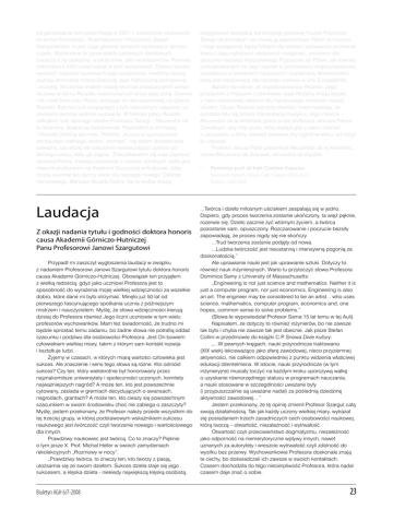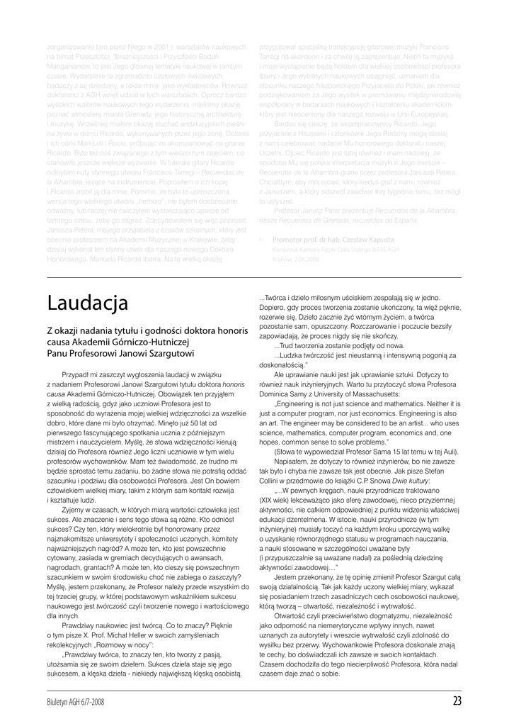 zorganizowanie tam przez Niego w 2001 r. warsztatów naukowych na temat Przeszłości, Teraźniejszości i Przyszłości Badań Manganianów, to jest Jego głównej tematyki naukowej w tamtym czasie. Wydarzenie to zgromadziło czołowych światowych badaczy z tej dziedziny, a także mnie, jako wykładowców. Również doktoranci z AGH wzięli udział w tych warsztatach. Oprócz bardzo wysokich walorów naukowych tego wydarzenia, mieliśmy okazję poznać atmosferę miasta Grenady, jego historyczną architekturę i muzykę. Wcześniej miałem okazję słuchać andaluzyjskich pieśni na żywo w domu Ricardo, wykonywanych przez jego żonę, Dolores i ich córki Mari-Loli i Rocio, próbując im akompaniować na gitarze Ricardo. Było też coś związanego z tym wieczornym zajęciem, co stanowiło jeszcze większe wyzwanie. W futerale gitary Ricardo odkryłem nuty słynnego utworu Francisco Tarregi – Recuerdos de la Alhambra, leżące na instrumencie. Poprosiłem o ich kopię i Ricardo zrobił ją dla mnie. Pomimo, że była to uproszczona wersja tego wielkiego utworu „tremolo”, nie byłem dostatecznie odważny, lub raczej nie ćwiczyłem wystarczająco uparcie od tamtego czasu, żeby go zagrać. Zdecydowałem się więc poprosić Janusza Patera, mojego przyjaciela z czasów szkolnych, który jest obecnie profesorem na Akademii Muzycznej w Krakowie, żeby dzisiaj wykonał ten słynny utwór dla naszego nowego Doktora Honorowego, Manuela Ricardo Ibarra. Na tę wielką okazję Laudacja Z okazji nadania tytułu i godności doktora honoris causa Akademii Górniczo-Hutniczej Panu Profesorowi Janowi Szargutowi Przypadł mi zaszczyt wygłoszenia laudacji w związku z nadaniem Profesorowi Janowi Szargutowi tytułu doktora honoris causa Akademii Górniczo-Hutniczej. Obowiązek ten przyjąłem z wielką radością, gdyż jako uczniowi Profesora jest to sposobność do wyrażenia mojej wielkiej wdzięczności za wszelkie dobro, które dane mi było otrzymać. Minęło już 50 lat od pierwszego fascynującego spotkania ucznia z późniejszym mistrzem i nauczycielem. Myślę, że słowa wdzięczności kierują dzisiaj do Profesora również Jego liczni uczniowie w tym wielu profesorów wychowanków. Mam też świadomość, że trudno mi będzie sprostać temu zadaniu, bo żadne słowa nie potrafią oddać szacunku i podziwu dla osobowości Profesora. Jest On bowiem człowiekiem wielkiej miary, takim z którym sam kontakt rozwija i kształtuje ludzi. Żyjemy w czasach, w których miarą wartości człowieka jest sukces. Ale znaczenie i sens tego słowa są różne. Kto odniósł sukces? Czy ten, który wielokrotnie był honorowany przez najznakomitsze uniwersytety i społeczności uczonych, komitety najważniejszych nagród? A może ten, kto jest powszechnie cytowany, zasiada w gremiach decydujących o awansach, nagrodach, grantach? A może ten, kto cieszy się powszechnym szacunkiem w swoim środowisku choć nie zabiega o zaszczyty? Myślę, jestem przekonany, że Profesor należy przede wszystkim do tej trzeciej grupy, w której podstawowym wskaźnikiem sukcesu naukowego jest twórczość czyli tworzenie nowego i wartościowego dla innych. Prawdziwy naukowiec jest twórcą. Co to znaczy? Pięknie o tym pisze X. Prof. Michał Heller w swoich zamyśleniach rekolekcyjnych „Rozmowy w nocy”: „Prawdziwy twórca, to znaczy ten, kto tworzy z pasją, utożsamia się ze swoim dziełem. Sukces dzieła staje się jego sukcesem, a klęska dzieła - niekiedy największą klęską osobistą. Biuletyn AGH 6/7-2008 przygotował specjalną transkrypcję gitarowej muzyki Francisco Tarregi na akordeon i za chwilę ją zaprezentuje. Niech ta muzyka i moje wystąpienie będą hołdem dla wielkiej osobowości profesora Ibarry i Jego wybitnych naukowych osiągnięć, uznaniem dla stosunku naszego hiszpańskiego Przyjaciela do Polski, jak również podziękowaniem za Jego wysiłek w promowaniu międzynarodowej współpracy w badaniach naukowych i kształceniu akademickim, który jest nieoceniony dla naszego rozwoju w Unii Europejskiej. Bardzo się cieszę, że współpracownicy Ricardo, Jego przyjaciele z Hiszpanii i członkowie Jego Rodziny mogą dzisiaj z nami celebrować nadanie Mu honorowego doktoratu naszej Uczelni. Ojciec Ricardo jest tutaj również i mam nadzieję, że spodoba Mu się polska interpretacja muzyki o Jego mieście – Recuerdos de la Alhambra grane przez profesora Janusza Patera. Chciałbym, aby mój ojciec, który kiedyś grał z nami, również z Januszem, a który odszedł zaledwie trzy tygodnie temu, też mógł to usłyszeć. Profesor Janusz Pater prezentuje Recuerdos de la Alhambra, nasze Recuerdos de Granada, recuerdos de España. Promotor prof. dr hab. Czesław Kapusta Kierownik Katedry Fizyki Ciała Stałego WFiIS AGH Kraków, 2.06.2008 ...Twórca i dzieło miłosnym uściskiem zespalają się w jedno. Dopiero, gdy proces tworzenia zostanie ukończony, ta więź pęknie, rozerwie się. Dzieło zacznie żyć wtórnym życiem, a twórca pozostanie sam, opuszczony. Rozczarowanie i poczucie bezsiły zapowiadają, że proces nigdy się nie skończy. ...Trud tworzenia zostanie podjęty od nowa. ...Ludzka twórczość jest nieustanną i intensywną pogonią za doskonałością.” Ale uprawianie nauki jest jak uprawianie sztuki. Dotyczy to również nauk inżynieryjnych. Warto tu przytoczyć słowa Profesora Dominica Samy z University of Massachusetts: „Engineering is not just science and mathematics. Neither it is just a computer program, nor just economics. Engineering is also an art. The engineer may be considered to be an artist... who uses science, mathematics, computer program, economics and, one hopes, common sense to solve problems.” (Słowa te wypowiedział Profesor Sama 15 lat temu w tej Auli). Napisałem, że dotyczy to również inżynierów, bo nie zawsze tak było i chyba nie zawsze tak jest obecnie. Jak pisze Stefan Collini w przedmowie do książki C.P. Snowa Dwie kultury: 
