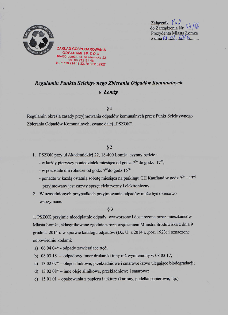 Załącznik „ i i.i do Zarządzenia Nr../. Prezydenta Miasta Łomża zóm*0LQ.LM)Lp.t ZAKŁAD GOSPODAROWANIA ODPADAMI SP. Z O.O. 18-400 Łomża. ul. Akademicka 22 tel. 86 212 51 48 NIP: 718 214 18 32,R: 361102927 Regulamin Punktu Selektywnego Zbierania Odpadów Komunalnych w Łomży §1 Regulamin określa zasady przyjmowania odpadów komunalnych przez Punkt Selektywnego Zbierania Odpadów Komunalnych, zwane dalej „PSZOK". §2 1. PSZOK przy ul Akademickiej 22, 18-400 Łomża czynny będzie : - w każdy pierwszy poniedziałek miesiąca od godz. 7 00 do godz. 17 00 , - w pozostałe dni robocze od godz. 7 00 do godz 15 00 - ponadto w każdą ostatnią sobotę miesiąca na parkingu CH Kaufland w godz 9 00 - 13' przyjmowany jest zużyty sprzęt elektryczny i elektroniczny. 2. W uzasadnionych przypadkach przyjmowanie odpadów może być okresowo wstrzymane. §3 1. PSZOK przyjmie nieodpłatnie odpady wytworzone i dostarczone przez mieszkańców Miasta Łomża, sklasyfikowane zgodnie z rozporządzeniem Ministra Środowiska z dnia 9 grudnia 2014 r. w sprawie katalogu odpadów (Dz. U. z 2014 r. ,poz. 1923) i oznaczone odpowiednio kodami: a) 06 04 04* - odpady zawierające rtęć; b) 08 03 18 - odpadowy toner drukarski inny niż wymieniony w 08 03 17; c) 13 02 07* - oleje silnikowe, przekładniowe i smarowe łatwo ulegające biodegradacji; d) 13 02 08* - inne oleje silnikowe, przekładniowe i smarowe; e) 15 01 01 - opakowania z papieru i tektury (kartony, pudełka papierowe, itp.) ae) 20 01 33* - Baterie i akumulatory łącznie z bateriami i akumulatorami wymienionymi w 16 06 01, 16 06 02 lub 16 06 03 oraz nie sortowane baterie i akumulatory zawierające te baterie; af) 20 01 34 - baterie i akumulatory inne niż wymienione w 20 01 33; ag) 20 01 35* - zużyte urządzenia elektryczne i elektroniczne inne niż wymienione w 20 01 21 i 20 01 23 zawierające niebezpieczne składniki; ah) 20 01 36 - zużyte urządzenia elektryczne i elektroniczne inne niż wymienione w 20 01 21,20 01 23 i 20 01 35; ai) 20 01 38 - drewno inne niż wymienione w 20 01 37; aj) 20 01 39 - tworzywa sztuczne (meble ogrodowe, wiadra, miski, doniczki, itp.); ak) 20 01 80 - środki ochrony roślin inne niż wymienione w 20 01 19; al) 20 01 99 - inne nie wymienione frakcje zbierane w sposób selektywny; am) 20 02 01 - odpady ulegające biodegradacji (gałęzie, liście, skoszona trawa). §4 PSZOK gromadzi odpady selektywne w pojemnikach o określanym kolorze: 1) niebieski zamknięty KP -7 - opakowania z papieru i tektury (kartony, pudełka papierowe, itp.), 2) zielony zamknięty KP - 7 - opakowania ze szkła, 3) żółty zamknięty KP - 7 - opakowania z tworzyw sztucznych (puszki), 4) pomarańczowy otwarty KP - 7 - gruz poremontowy , 5) zielony otwarty KP -17 - opakowania wielkogabarytowe. Pozostałe odpady składowane będą w zależności od frakcji w specjalnie dostosowanych pojemnikach w budynku zamkniętym. §5 1) Odpady wymagające opakowania przyjmowane są wyłącznie w szczelnych i nie cieknących pojemnikach, zawierających informację o rodzaju odpadu. 2) Odpady ulegające biodegradacji, o których mowa w § 3 pkt. 1 lit. am, przyjmowane są w workach foliowych o pojemności od 60 do 120 1. Każdy mieszkaniec Miasta Łomży może dostarczyć jednorazowo maksymalnie 6 takich worków. §6 Do PSZOK przyjmowane są wyłącznie odpady dostarczone w sposób umożliwiający ich selektywne odebranie zgodnie z kategoriami odpadów wymienionymi w § 3 pkt. 1. §7 Obsługa PSZOK odmówi przyjęcia odpadów dostarczonych w sposób niezgodny z Regulaminem, w szczególności z § 3 - § 5. §8 Na terenie PSZOK dzieci poniżej 12 roku życia mogą przebywać jedynie pod opieką osoby pełnoletniej. §9 Osoby przebywające na terenie PSZOK obowiązane są do: 1) przestrzegania zaleceń obsługi PSZOK, w szczególności w zakresie miejsca złożenia odpadów oraz sposobu poruszania się po PSZOK; 2) zachowania wymogów bezpieczeństwa, w szczególności nieużywania źródeł otwartego ognia; 3) zachowania kierunku przemieszczania się wynikającego z oznaczeń; 4) stosowania się do ogólnych zasad ruchu drogowego. V