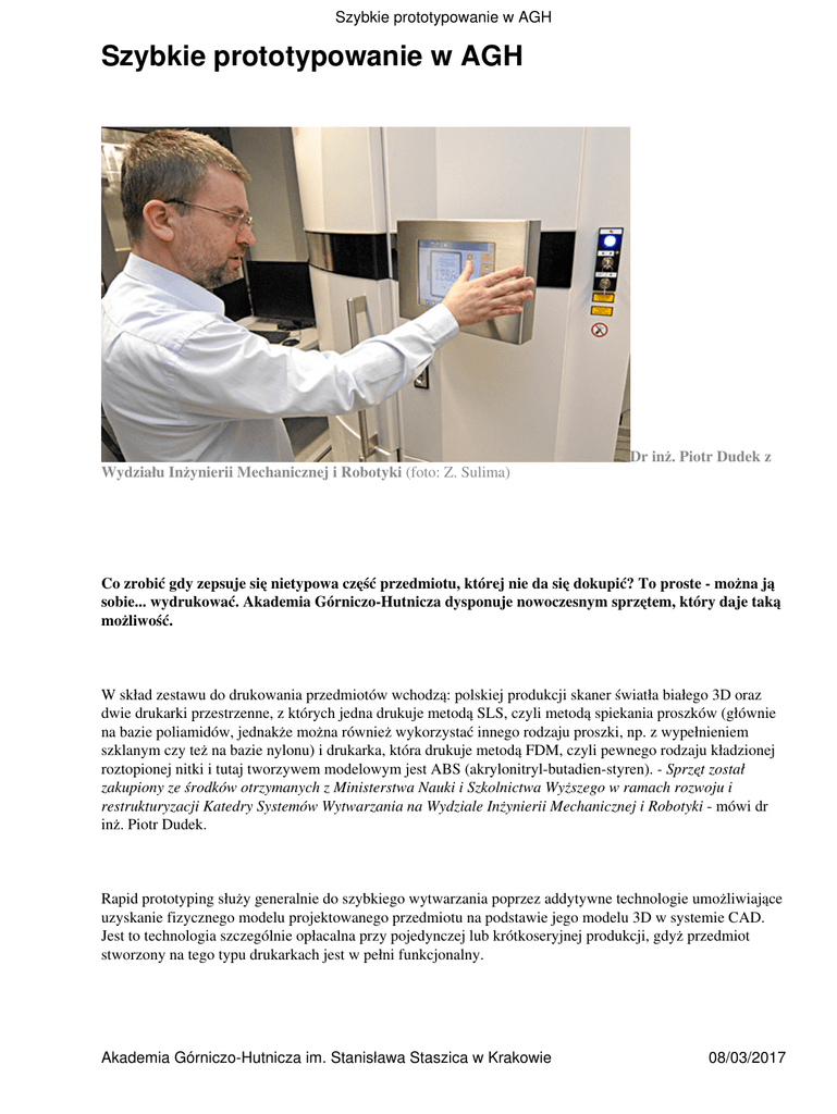 Szybkie prototypowanie w AGH Szybkie prototypowanie w AGH Dr inż. Piotr Dudek z Wydziału Inżynierii Mechanicznej i Robotyki (foto: Z. Sulima) Co zrobić gdy zepsuje się nietypowa część przedmiotu, której nie da się dokupić? To proste - można ją sobie... wydrukować. Akademia Górniczo-Hutnicza dysponuje nowoczesnym sprzętem, który daje taką możliwość. W skład zestawu do drukowania przedmiotów wchodzą: polskiej produkcji skaner światła białego 3D oraz dwie drukarki przestrzenne, z których jedna drukuje metodą SLS, czyli metodą spiekania proszków (głównie na bazie poliamidów, jednakże można również wykorzystać innego rodzaju proszki, np. z wypełnieniem szklanym czy też na bazie nylonu) i drukarka, która drukuje metodą FDM, czyli pewnego rodzaju kładzionej roztopionej nitki i tutaj tworzywem modelowym jest ABS (akrylonitryl-butadien-styren). - Sprzęt został zakupiony ze środków otrzymanych z Ministerstwa Nauki i Szkolnictwa Wyższego w ramach rozwoju i restrukturyzacji Katedry Systemów Wytwarzania na Wydziale Inżynierii Mechanicznej i Robotyki - mówi dr inż. Piotr Dudek. Rapid prototyping służy generalnie do szybkiego wytwarzania poprzez addytywne technologie umożliwiające uzyskanie fizycznego modelu projektowanego przedmiotu na podstawie jego modelu 3D w systemie CAD. Jest to technologia szczególnie opłacalna przy pojedynczej lub krótkoseryjnej produkcji, gdyż przedmiot stworzony na tego typu drukarkach jest w pełni funkcjonalny. Akademia Górniczo-Hutnicza im. Stanisława Staszica w Krakowie 08/03/2017 Szybkie prototypowanie w AGH Element powstały w technologii FDM jest wprawdzie nieco mniej wytrzymały niż przedmiot wykonany na wtryskarce, jednakże możemy w pewnym stopniu sterować wytrzymałością poprzez zagęszczenie lub luźniejsze pokrycie nitkami w taki sposób, aby struktura wewnętrzna była gęstsza, dzięki temu przedmiot jest bardziej wytrzymały. Luźniejsze wypełnienie powoduje mniejsze zużycie materiału modelowego, co oczywiście znacząco przekłada się na koszty wydruku. Przedmiot nie jest może w stu procentach wytrzymały, tak jak w przypadku modelu wytłaczanego na wtryskarkach, ale jest funkcjonalny. Przy zapotrzebowaniu na krótkie serie, czyli kilka - kilkanaście sztuk drukowanie jest też dużo bardziej opłacalne niż tworzenie matryc, nawet kilkunastokrotnie. Nasi naukowcy drukowali już na różnorodne zlecenia, np. model dydaktyczny podzielnicy na pracę dyplomową jednego ze studentów, elementy zwieszenia modeli RC, model prototypowej szczoteczki do zębów. Obecnie w fazie drukowania i projektowania jest kilka modeli z prac dyplomowych i projektów studentów: model dłutownicy Fellowsa, tokarki, maszyny do giga makro fotografii . - To co tu robimy to w pełni użyteczne modele - zapewnia dr Dudek. Urządzenie na Wydziale Inżynierii Mechanicznej i Robotyki drukuje tylko w plastiku, więc nie zastąpi odlewów z metalu, ale są już takie maszyny, które mają lasery większej mocy (moc naszego lasera to max. 30 watów) i mogą drukować w proszkach metali. W takich maszynach moc lasera zaczyna się od 100 watów i z nich można uzyskać produkt metalowy. Dzięki tego typu urządzeniom można sprawdzić, jak w rzeczywistości będzie wyglądał odlew metalowy. Ważnym aspektem w tym przypadku jest gęstość modelu - systemy tworzące metalowe części pozwalają uzyskać modele o gęstości 99 proc. Dzięki temu charakterystyki wytrzymałościowe tak uzyskanych modeli nie różnią się od charakterystyk części uzyskanych czasochłonnymi metodami tradycyjnymi. To są oczywiście znacznie większe koszty, bo proszek metalowy jest droższy niż plastikowy. Za to stosując metodę drukowania w 3D można uzyskać obiekty, których nie da się stworzyć metodą odlewania, lub jest to skomplikowane. Jednakże w proszkach stopów stali, brązów, aluminium, chromowo-kobaltowych, tytanu, złota czy też srebra możliwy jest wydruk bardzo skomplikowanych kształtów. Należy tylko zwrócić uwagę, że powierzchnia tak uzyskanych przedmiotów charakteryzuje się większą chropowatością i wymaga dodatkowej obróbki wykańczającej. Jak to działa? Najpierw należy narysować w programie 3D lub zeskanować dany przedmiot i zapisać go w formacie STL, w którym powierzchnia przedmiotu opisywana jest za pomocą siatki trójkątów. Kolejnym krokiem jest odpowiednie pozycjonowanie przedmiotu, zwykle tak, aby zajmował on po wydruku jak najmniejszą wysokość komory roboczej, gdyż koszty i czas wydruku jest wówczas najmniejszy. Kolejnym krokiem jest uruchomienie procedury lub programu do "pocięcia" modelu na warstwy. W przypadku maszyny FDM można już tak przetworzone dane wysłać do drukarki i uruchomić proces drukowania, a po jego zakończeniu oderwać model od stołu i oczyścić z materiału podporowego. Dla maszyny SLS należy jeszcze po pocięciu na warstwy poprawić ewentualne błędy ścieżki lasera dla niektórych warstw, przygotować zadanie i wysłać je poprzez sieć do drukarki. Drukarka powinna być dokładnie wyczyszczona, przygotowany wcześniej proszek (minimum 24 godz. wcześniej) umieszczony w zasobnikach i po rozprowadzeniu wstępnym proszku na stole roboczym można uruchomić proces wstępnego nagrzewania i proces wydruku. Po wydrukowaniu należy pozwolić, aby wydrukowane elementy powoli wystygły w maszynie minimum tyle czasu, ile trwał proces wydruku. Drukowanie dużych elementów może trwać nawet 1,5 dnia, wówczas dodatkowe 1,5 dnia maszyna musi stygnąć. Tak więc wytworzenie prototypu trwa około trzech dni. Małych Akademia Górniczo-Hutnicza im. Stanisława Staszica w Krakowie 08/03/2017 Szybkie prototypowanie w AGH modeli odpowiednio krócej. Co bardzo ciekawe, drukarka 3D potrafi tworzyć przedmioty wraz z ich częściami ruchomymi. Jeśli drukujemy np. klucz francuski to mimo że klucz będzie drukowany jako jedna całość (przedmiot jednobryłowy) to jeg