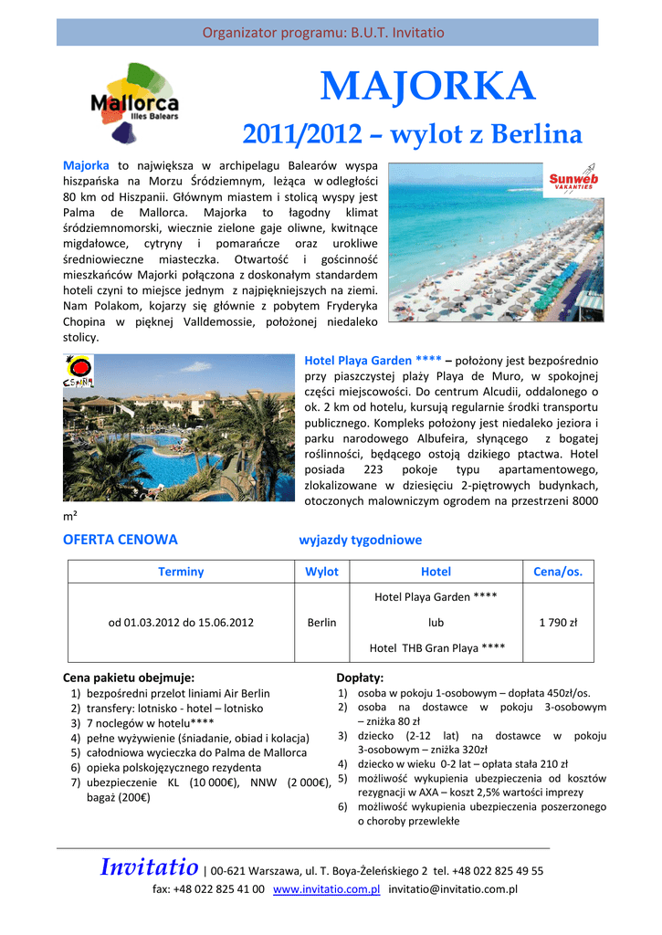 Organizator programu: B.U.T. Invitatio MAJORKA 2011/2012 – wylot z Berlina Majorka to największa w archipelagu Balearów wyspa hiszpańska na Morzu Śródziemnym, leżąca w odległości 80 km od Hiszpanii. Głównym miastem i stolicą wyspy jest Palma de Mallorca. Majorka to łagodny klimat śródziemnomorski, wiecznie zielone gaje oliwne, kwitnące migdałowce, cytryny i pomarańcze oraz urokliwe średniowieczne miasteczka. Otwartość i gościnność mieszkańców Majorki połączona z doskonałym standardem hoteli czyni to miejsce jednym z najpiękniejszych na ziemi. Nam Polakom, kojarzy się głównie z pobytem Fryderyka Chopina w pięknej Valldemossie, położonej niedaleko stolicy. Hotel Playa Garden **** – położony jest bezpośrednio przy piaszczystej plaży Playa de Muro, w spokojnej części miejscowości. Do centrum Alcudii, oddalonego o ok. 2 km od hotelu, kursują regularnie środki transportu publicznego. Kompleks położony jest niedaleko jeziora i parku narodowego Albufeira, słynącego z bogatej roślinności, będącego ostoją dzikiego ptactwa. Hotel posiada 223 pokoje typu apartamentowego, zlokalizowane w dziesięciu 2-piętrowych budynkach, otoczonych malowniczym ogrodem na przestrzeni 8000 m² OFERTA CENOWA Terminy wyjazdy tygodniowe Wylot Hotel Cena/os. Hotel Playa Garden **** od 01.03.2012 do 15.06.2012 Berlin lub 1 790 zł Hotel THB Gran Playa **** Cena pakietu obejmuje: 1) 2) 3) 4) 5) 6) 7) bezpośredni przelot liniami Air Berlin transfery: lotnisko - hotel – lotnisko 7 noclegów w hotelu**** pełne wyżywienie (śniadanie, obiad i kolacja) całodniowa wycieczka do Palma de Mallorca opieka polskojęzycznego rezydenta ubezpieczenie KL (10 000€), NNW (2 000€), bagaż (200€) Dopłaty: 1) osoba w pokoju 1-osobowym – dopłata 450zł/os. 2) osoba na dostawce w pokoju 3-osobowym – zniżka 80 zł 3) dziecko (2-12 lat) na dostawce w pokoju 3-osobowym – zniżka 320zł 4) dziecko w wieku 0-2 lat – opłata stała 210 zł 5) możliwość wykupienia ubezpieczenia od kosztów rezygnacji w AXA – koszt 2,5% wartości imprezy 6) możliwość wykupienia ubezpieczenia poszerzonego o choroby przewlekłe Invitatio | 00-621 Warszawa, ul. T. Boya-Żeleńskiego 2 tel. +48 022 825 49 55 fax: +48 022 825 41 00 www.invitatio.com.pl [email protected]