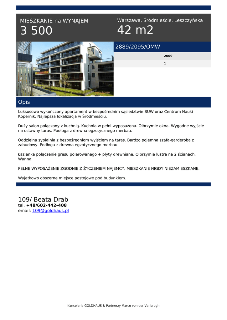 MIESZKANIE na WYNAJEM 3 500 Warszawa, Śródmieście, Leszczyńska 42 m2 2889/2095/OMW 2009 1 Opis Luksusowo wykończony apartament w bezpośrednim sąsiedztwie BUW oraz Centrum Nauki Kopernik. Najlepsza lokalizacja w Śródmieściu. Duży salon połączony z kuchnią. Kuchnia w pełni wyposażona. Olbrzymie okna. Wygodne wyjście na ustawny taras. Podłoga z drewna egzotycznego merbau. Oddzielna sypialnia z bezpośredniom wyjściem na taras. Bardzo pojemna szafa-garderoba z zabudowy. Podłoga z drewna egzotycznego merbau. Łazienka połączenie gresu polerowanego + płyty drewniane. Olbrzymie lustra na 2 ścianach. Wanna. PEŁNE WYPOSAŻENIE ZGODNIE Z ŻYCZENIEM NAJEMCY. MIESZKANIE NIGDY NIEZAMIESZKANE. Wyjątkowo obszerne miejsce postojowe pod budynkiem. 109/ Beata Drab tel. +48/602-442-408 email: [email protected] Kancelaria GOLDHAUS & Partnerzy Marco von der Vanbrugh Powered by TCPDF (www.tcpdf.org)
