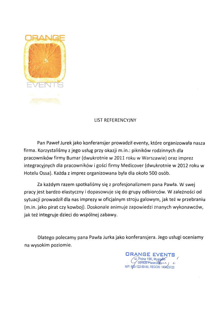 LIST REFERENCYJNY Pan Pawet Jurek jako konferansjer prowadzit eventy, kt6re organizowata nasza firma. Korzvstalismv z jego uslug przy okazji m.in.: piknik6w rodzinnyeh dla praeownik6w firmy Bumar (dwukrotnie w 2011 roku w Warszawie) oraz imprez integraeyjnyeh dla praeownik6w i gosci firmy Medieover (dwukrotnie w 2012 roku w Hotelu Ossa). Kazda z imprez organizowana byta dla okoio 500 os6b . Za kazdvm razem spotkallsmv sie z profesjonalizmem pana Pawta. W swej praey jest bardzo elastyezny i dopasowuje sie do grupy odbiore6w. W zaleznosci ad sytuaeji prowadzit dla nas imprezy w ofiejalnym stroju galowym, jak tez w przebraniu (m.in . jako pirat ezy kowboj). Doskonale animuje zapowiedzi znanyeh wykonawe6w, jak tez integruje dzieci do wsp61nej zabawy. Dlatego poleeamy pana Pawta Jurka jako konferansjera. Jego usiugi oeeniamy na wysokim poziomie. O ~NGE EVENTS ul. Polna 15K, MYllia4!O . O515OtrPiasecz~ c- NIP: 6 3-122-89-80, REGON: 14;d3723 (