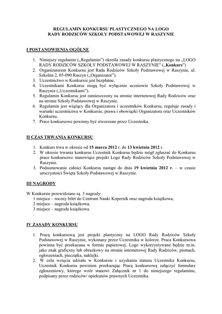 REGULAMIN KONKURSU PLASTYCZNEGO NA LOGO RADY RODZICÓW SZKOŁY PODSTAWOWEJ W RASZYNIE I POSTANOWIENIA OGÓLNE 1. Niniejszy regulamin („Regulamin”) określa zasady konkursu plastycznego na „LOGO RADY RODZICÓW SZKOŁY PODSTAWOWEJ W RASZYNIE” („Konkurs”) 2. Organizatorem Konkursu jest Rada Rodziców Szkoły Podstawowej w Raszynie, ul. Szkolna 2, 05-090 Raszyn („Organizator”). 3. Uczestnictwo w Konkursie jest bezpłatne. 4. Uczestnikami Konkursu mogą być wyłącznie uczniowie Szkoły Podstawowej w Raszynie („Uczestnikami”). 5. Regulamin Konkursu jest zamieszczony na stronie internetowej Rady Rodziców oraz na stronie Szkoły Podstawowej w Raszynie. 6. Regulamin jest wiąŜący dla Organizatora i uczestników Konkursu, reguluje zasady i warunki uczestnictwa w Konkursie, prawa i obowiązki Organizatora oraz Uczestników Konkursu. 7. Prace konkursowe powinny być stworzone przez Uczestnika. II CZAS TRWANIA KONKURSU 1. Konkurs trwa w okresie od 15 marca 2012 r. do 13 kwietnia 2012 r. 2. W okresie trwania konkursu Uczestnik Konkursu będzie mógł zgłaszać do Konkursu prace konkursowe stanowiące projekt Logo Rady Rodziców Szkoły Podstawowej w Raszynie. 3. Podsumowanie całości Konkursu nastąpi do dnia 19 kwietnia 2012 r. – w czasie uroczystości Święta Szkoły Podstawowej w Raszynie. III NAGRODY W Konkursie przewidziane są 3 nagrody: 1 miejsce – roczny bilet do Centrum Nauki Kopernik oraz nagroda ksiąŜkowa, 2 miejsce – nagroda ksiąŜkowa, 3 miejsce – nagroda ksiąŜkowa. . IV ZASADY KONKURSU 1. Pracą konkursową jest projekt plastyczny na LOGO Rady Rodziców Szkoły Podstawowej w Raszynie, wykonany przez Uczestnika w kolorze. Praca Konkursowa powinna być przekazana w formie papierowej. Logo wykorzystywane będzie m.in. jako znak graficzny lub obrazkowy na stronie internetowej Rady Rodziców, pismach, ogłoszeniach, pieczątka, naklejki. 2. W celu wzięcia udziału w Konkursie i uzyskania statusu Uczestnika Konkursu, Uczestnik Konkursu powinien przekazując Pracę konkursową załączyć formularz zgłoszeniowy, którego wzór stanowi Załącznik nr 1 do niniejszego regulaminu, podpisany przez rodziców/ opiekunów prawnych Uczestnika. 3. Prace Konkursowe winny być przekazywane do Pani Katarzyny Bilskiej lub Pani Małgorzaty Kasprzak do dnia 13 kwietnia 2012 r. 4. Uczestnik Konkursu moŜe składać kilka Prac Konkursowych, załączając do kaŜdej z nich formularz zgłoszeniowy. Uczestnik, niezaleŜnie od liczby zgłoszonych prac konkursowych moŜe zdobyć tylko jedną nagrodę. 5. Praca konkursowa niezaleŜnie od załączenia formularza zgłoszeniowego winna być na odwrotnej stronie pracy konkursowej podpisania imieniem i nazwiskiem Uczestnika, ze wskazaniem klasy. 6. Zgłoszenie Pracy Konkursowej przez Uczestnika Konkursu (rodziców/ opiekunów prawnych) jest równoznaczne z przeniesieniem na Organizatora wszelkich autorski praw majątkowych do Prac Konkursowych bez Ŝadnych ograniczeń terytorialnych, na wszystkich znanych w chwili zgłoszenia Pracy Konkursowej polach eksploatacji obejmujących w szczególności prawo do rozpowszechniania, zwielokrotniania dowolną techniką, uŜywania, dostosowywania, edytowania i wielokrotnego publikowania Pracy Konkursowej w dowolny sposób, zarówno w celach komercyjnych jak i niekomercyjnych, z prawem tworzenia dzieł zaleŜnych. 7. Autor Pracy Konkursowej przez fakt zgłoszenia swego uczestnictwa zobowiązuje się nie wykonywać względem Organizatora ani jakichkolwiek jego następców prawnych swoich autorskich praw osobistych. 8. Z chwilą zgłoszenia Pracy Konkursowej Uczestnik przenosi na Organizatora własność nośników na których utrwalił Pracę Konkursową, wskazanych w ust. 1 powyŜej. 9. Uczestnikowi nie naleŜy się jakakolwiek naleŜność od Organizatora z tytułu uczestnictwa w Konkursie. 10. Uczestnik zachowuje prawo do korzystania z Pracy Konkursowej dla celów osobistych z wyłączeniem prawa do publicznego udostępniania. V SPOSÓB ROZLICZANIA KONKURSU 1. Komisja Konkursowa w składzie: - Pani Katarzyna Bilska, - Pani Małgorzata Kasprzak, - 3 przedstawicieli Rady Rodziców, dokona wyboru najlepszych Prac Konkursowych. 2. Wyniki konkursu oraz wręczenie nagród nastąpi 19 kwietnia 2012 r. na uroczystości Święta Szkoły Podstawowej w Raszynie. VI POSTANOWIENIA KOŃCOWE 1. Zgłaszając swój udział w Konkursie i biorąc w nim udział, Uczestnik (rodzice/ opiekunowie prawni) akceptuje treść Regulaminu Konkursu i wyraŜa zgodę na opisane w nim zasady prowadzenia Konkursu. 2. Postanowienia niniejszego Regulaminu Konkursu są wyłączną podstawą prowadzenia Konkursu. 3. Niniejszy Regulamin Konkursu jest dostępny na stronie internetowej Rady Rodziców oraz stronie internetowej Szkoły Podstawowej w Raszynie. FORMULARZ ZGŁOSZENIOWY W KONKURSIE PLASTYCZNYM „LOGO RADY RODZICÓW SZKOŁY PODSTAWOWEJ W RASZYNIE” NR PRACY KONKURSOWEJ______________________ (wypełnia Nauczyciel przyjmujący pracę) Imię i nazwisko Uczestnika: 1. Niniejszym jako Rodzice/ Opiekunowie prawni ww. Uczestnika oświadczam, iŜ akceptuję treść Regulaminu Konkursu . 2. Oświadczam, Ŝe Praca Konkursowa jest wyłącznym dziełem Uczestnika nie obciąŜonym prawami i roszczeniami osób trzecich. 3. Z dniem dokonania zgłoszenia przenoszę na Organizatora, tj. Radę Rodziców Szkoły Podstawowej w Raszynie wszelkie autorskie praw majątkowe do Pracy Konkursowej objętej zgłoszeniem bez Ŝadnych ograniczeń terytorialnych, na wszystkich znanych w chwili zgłoszenia polach eksploatacji obejmujących w szczególności prawo do rozpowszechniania, zwielokrotniania dowolną techniką, uŜywania, dostosowywania, edytowania i wielokrotnego publikowania Pracy Konkursowej w dowolny sposób, zarówno w celach komercyjnych jak i niekomercyjnych, z prawem tworzenia dzieł zaleŜnych. 4. Niniejszym oświadczam, iŜ Uczestnik nie będzie wykonywać względem Organizatora ani jakichkolwiek jego następcy prawnego swoich auto