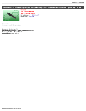 Informacje o produkcie S0001467 - Blokada pompy wtryskowej silnik Mercedes OM 604 z pompą Lucas Cena : 23,75 zł (netto) 29,21 zł (brutto) Nr katalogowy : S0001467 Producent : Tesam Zastosowanie: Samochody mercedes OM 604 z pompą Lucas Gwarancja 12 miesięcy: Tak Stan produktu: Używany / Nowy / Regenerowany: Nowy Czas wysyłki: 24h | 48h | 3 dni: 24h Koszty wysyłki: 21zł | 26zł | 0zł Wygenerowano w programie www.oscGold.com