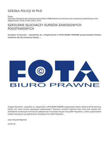 SZKOŁA POLICJI W PILE Źródło: http://pila.szkolapolicji.gov.pl/spp/aktualnosci/2016-1/3386,Szkolenie-sluchaczy-kursow-zawodowych-podstawowych.html Wygenerowano: Środa, 8 marca 2017, 03:42 SZKOLENIE SŁUCHACZY KURSÓW ZAWODOWYCH PODSTAWOWYCH Grzegorz Surowców – specjalista ds. antypirackich z FOTA BIURO PRAWNE przeprowadził kolejne szkolenie dla 40 słuchaczy Szkoły ... Grzegorz Surowców – specjalista ds. antypirackich z FOTA BIURO PRAWNE przeprowadził kolejne szkolenie dla 40 słuchaczy Szkoły, tym razem kursów zawodowych podstawowych. Głównymi tematami szkolenia były: techniczne aspekty dot. obchodzenia skutecznych technicznych zabezpieczeń w konsolach do gier firmy SONY Playstation, a także rozpoznawanie znaków towarowych oraz podrobionych akcesoriów firmy SONY Playstation. autor: Krzysztof Opaliński (16.05.16) Ocena: 0/5 (0) Tweetnij