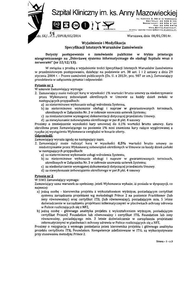 Szpital Kliniczny im. ks.Anny Mazowieckiej UL. K P - O W P moe@i~"y .-.-- - - ...I!?../DPUB/O5/2014 '-,oucu 2 , 00-3 15 WP~SZAWA Z Z 596 6 1 0 0 Z Z 596 64 17 64 0 OENTRALA: S E K R E T a RFAX: laT: WWW.SIP~TALKP~OWP.PI~ r-nniL: ~ E . ~ E T A ~ , ~ ~ @ S Z P , T I \ L K A R O ~ A p p ~ ~ - Warszawa, dnia 08/01/2014r. WyjaSnienie i Modyfikacja Specyfikacji lstotnych W a r u n k o w Z a m o w i e n i a Dotyczy postgpowania o zam6wienie publiczne w trybie przetargu nieograniczonego na ,,Dzierzawg systemu informatycznego d o obsiugi Szpitala wraz z senverami" (nr 12/12/13). W zwiqzku z proSbq o wyjainienie treici Specyfikacji lstotnych Warunk6w Zam6wienia w przedmiotowym postgpowaniu, dziaiajqc na podstawie art. 38 ust. 1 i 2 ustawy z dnia 29 stycznia 2004 r. - Prawo zam6wien publicznych (Dz. U. z 2013r, poz. 907 ze zm.), Zamawiajqcy przedstawia w zatqczeniu pytania i odpowiedzi: F!Ytanie n r 1 W umowie Zamawiajqcy wymaga: 2. Zamawiajqcy moie naliczyC karq w wysokoici 1% wartoici brutto umowy za niedotrzymanie przez Wykonawcg zobowigzan okreilonych w Umowie za kazdy dzied zwioki w nastqpujqcych przypadkach: a) za nieterminowe wykonanie ustugi wdroienia Systernu, b) za nieterminowe wykonanie obsiugi i napraw w gwarantowanych terminach, okreilonych w Zatqczniku Nr. 3 w zakresie usuwania usterek Systemu; c) za niedostarczenie wymaganej dokurnentacji dotyczgcej przedmiotu Umowy. d) za niewykonanie zobowigzania okreilonego w par.8 pkt. 4 umowy Prosimy o zmniejszenie wysokoSci kary umownej do 0.1% wartoici brutto umowy. Kara okreilona przez Zamawiajqcego na poziomie 1 % nosi znamiona kary raigco wyg6rowanej a ryzyko jej wystgpienia Wykonawca uwzglqdni w koszcie oferty. Ddpowiedk Zamawiajqcy wyraza zgodg na nastgpujgcy zapis. 2. Zarnawiajgcy moze naliczyC karg w wysokoSci 0,5% wartoici brutto umowy za niedotrzymanie przez Wykonawcg zobowigzali okreilonych w Umowie za kaidy dzieri zwtoki w nastqpujgcych przypadkach: a) za nieterminowe wykonanie ustugi wdrozenia Systemu. b) za nieterminowe wykonanie obstugi i napraw w gwarantowanych terminach, okreilonych w Zaiqczniku Nr. 3 w zakresie usuwania usterek Systemu; c) za niedostarczenie wymaganej dokumentacji dotyczqcej przedmiotu Umowy. d) za niewykonanie zobowigzania okreilonego w par.8 pkt. 4 umowy Pvtanie nr2 W SlWZ Zamawiajgcy wymaga: Zarnawiajgcy uzna warunek za spetniony, jeieli Wykonawca wykaze, iz posiada w dyspozycji, co najmniej: a) jedng osobg - kierownika projektu z wyksztaiceniem wyzszym, posiadajgcym certyfikat systemu zarzqdzania projektami wg metodologii Prince 2 na poziomie Practitioner (lub inny rownowainy) oraz certyfikat lTlL (lub r6wnowazny), posiadajqcym min. 5 letnie doiwiadczenie w zarzqdzaniu projektami informatycznymi w plac6wkach ochrony zdrowia w Polsce rozliczajqcych sig z NFZ, b) jedng osobq - giownego analityka projektu z wyksztaiceniem wyzszym, posiadajqcym certyfikat Prince2 Foundation lub r6wnowazny i certyfikat ITIL Foundation 1ub inny rbwnowazny, posiadajqcego min. 3 letnie doiwiadczenie w zarzgdzaniu projektami informatycznymi w plac6wkach ochrony zdrowia w Polsce rozliczajgcych sig z NFZ, Prosimy o rezygnacjq z wymogu posiadania przez kierownika projektu i gi6wnego analityka projektu certyfikatu lTlL Foundation. Kornpetencje zdefiniowane w ITlL sg wykorzystywane przy stosowaniu metodyki Prince 2. Ddpowiedi: Zamawiajqcy wyraza zgodq. W wyniku modyfikacji Zamawiajqcy przekazuje w zaiqczeniu uaktualniony zaiqcznik nr 6 do SlWZ - wykaz osbb. Wobec powyzszego Zamawiajqcy dokonuiew nastqpujqcy sposbb JEST: ROZDZIAL V. WARUNKI UDZIALU w POSTEPOWANIU ORAZ SPOSOB DOKONYWANIA OCENY SPELNIENIA TYCH WARUNKOW. 0 udzielenie zambwienia mogq ubiegaC siq Wykonawcy, wobec ktbrych brak jest podstaw do wykluczenia z postqpowania na podstawie art. 24 ust 1 i 2 ustawy Pzp oraz ktbrzy speiniajq warunki okreilone w art. 22 ust. 1 ustawy Pzp, w szczegblnoici: , . 1, dvsoonuia osobami zdolnvmi d o w v b Zamawiajqcy uzna warunek za speiniony, jezeli Wykonawca wykaze, iz posiada w dyspozycji, co najmniej: a) jednq osobq - kierownika projektu z wyksztaiceniem wyiszym, posiadajqcym certyfikat systemu zarzqdzania projektami wg metodologii Prince 2 na poziomie Practitioner (lub inny rbwnowazny) ~ ra cer L posiadajqcym min. 5 letnie doiwiadczenie w zarzqdzaniu projektami informatycznymi w placbwkach ochrony zdrowia w Polsce rozliczajqcych siq z NFZ, b) jednq osobq - gMwnego analityka projektu z wyksztaiceniem wyiszym, posiadajqcym certyfikat Prince2 Foundation lub rbwnowainy i certvfikat ITlL Foundation lub inny rbwnowainv, posiadajqcego min. 3 letnie doiwiadczenie w zarzqdzaniu projektami informatycznymi w placbwkach ochrony zdrowia w Polsce rozliczajqcych siq z NFZ, c) dwie osoby - wdroieniowcy z wyksztaiceniem wyiszym, posiadajqcy certyfikat systemu zarzqdzania projektami wg metodologii Prince 2 na poziomie Foundation (lub inny rbwnowainy), posiadajqcy min. 2 letnie doiwiadczenie we wdroieniach oferowanego systemu informatycznego HIS/RIS w placbwkach ochrony zdrowia w Polsce rozliczajqcych siq z NFZ, d) jednq osobq - Administratora Baz Danych - osoba posiadajqca min. 5 letnie doiwiadczenia na danym stanowisku, oraz certyfikaty w zakresie: Certyfikat PRINCE2 na poziomie Foundation, Certyfikat z administracji serwerem bazy danych, na ktbrym pracowai bqdzie oferowany system, na poziomie zaawansowanym (np. Oracle Database l l g Administrator Certified Professional, Microsoft SQL Server Certified [T Professional, Sybase Adaptive Server Enterprise Administrator Professional) lub inny rbwnowainy, e) jednq osobq - Administratora Systembw Operacyjnych - osoba posiadajqca rnin. 5 doiwiadczenie na danym stanowisku, oraz certyfikaty w zakresie: Certyfikat PRINCE2 na poziomie Foundation lub inny rbwnowainy, Certyfikat z administracji systemem operacyjnym na poziomie zaawansowanym (np. Microsoft Certified Systems Administrator [MCSA), Red Hat Certified Engineer (RHCE)). Certyfikat z administracji systemem wirtualizacji na poziomie zaawansowanym (np. VMware Cer