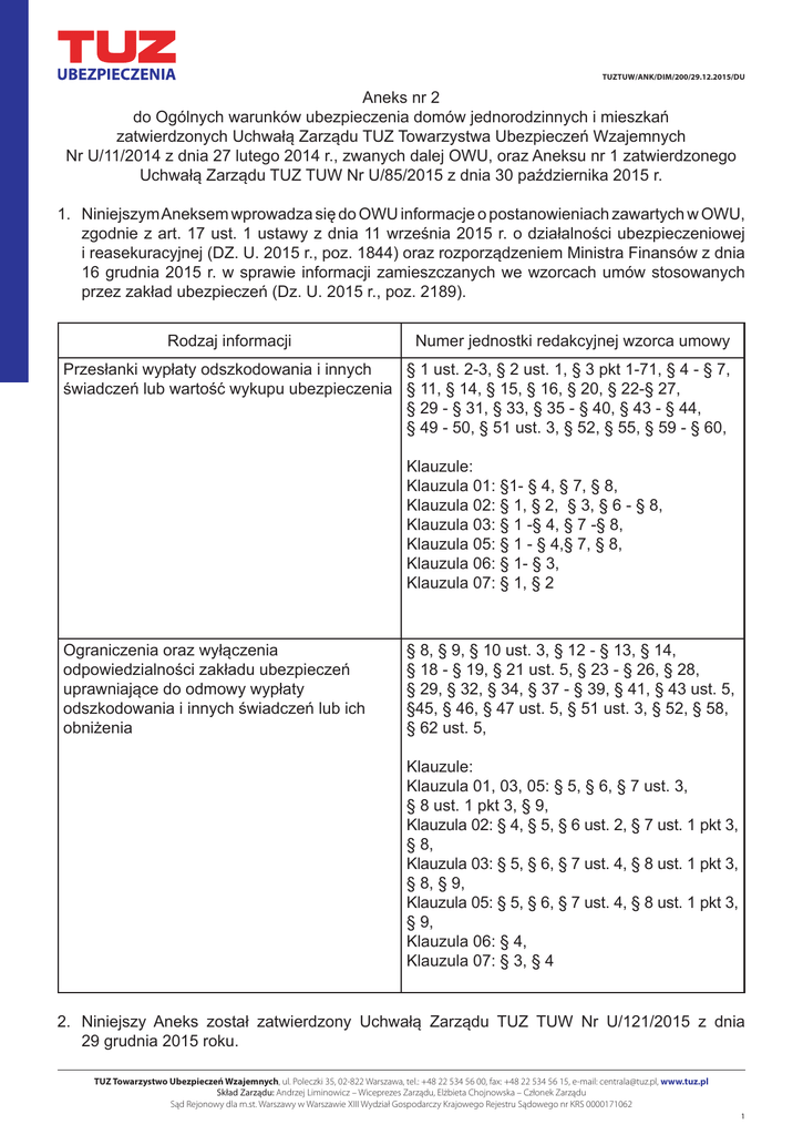 TUZTUW/ANK/DIM/200/29.12.2015/DU Aneks nr 2 do Ogólnych warunków ubezpieczenia domów jednorodzinnych i mieszkań zatwierdzonych Uchwałą Zarządu TUZ Towarzystwa Ubezpieczeń Wzajemnych Nr U/11/2014 z dnia 27 lutego 2014 r., zwanych dalej OWU, oraz Aneksu nr 1 zatwierdzonego Uchwałą Zarządu TUZ TUW Nr U/85/2015 z dnia 30 października 2015 r. 1. Niniejszym Aneksem wprowadza się do OWU informacje o postanowieniach zawartych w OWU, zgodnie z art. 17 ust. 1 ustawy z dnia 11 września 2015 r. o działalności ubezpieczeniowej i reasekuracyjnej (DZ. U. 2015 r., poz. 1844) oraz rozporządzeniem Ministra Finansów z dnia 16 grudnia 2015 r. w sprawie informacji zamieszczanych we wzorcach umów stosowanych przez zakład ubezpieczeń (Dz. U. 2015 r., poz. 2189). Rodzaj informacji Numer jednostki redakcyjnej wzorca umowy Przesłanki wypłaty odszkodowania i innych § 1 ust. 2-3, § 2 ust. 1, § 3 pkt 1-71, § 4 - § 7, świadczeń lub wartość wykupu ubezpieczenia § 11, § 14, § 15, § 16, § 20, § 22-§ 27, § 29 - § 31, § 33, § 35 - § 40, § 43 - § 44, § 49 - 50, § 51 ust. 3, § 52, § 55, § 59 - § 60, Klauzule: Klauzula 01: §1- § 4, § 7, § 8, Klauzula 02: § 1, § 2, § 3, § 6 - § 8, Klauzula 03: § 1 -§ 4, § 7 -§ 8, Klauzula 05: § 1 - § 4,§ 7, § 8, Klauzula 06: § 1- § 3, Klauzula 07: § 1, § 2 Ograniczenia oraz wyłączenia odpowiedzialności zakładu ubezpieczeń uprawniające do odmowy wypłaty odszkodowania i innych świadczeń lub ich obniżenia § 8, § 9, § 10 ust. 3, § 12 - § 13, § 14, § 18 - § 19, § 21 ust. 5, § 23 - § 26, § 28, § 29, § 32, § 34, § 37 - § 39, § 41, § 43 ust. 5, §45, § 46, § 47 ust. 5, § 51 ust. 3, § 52, § 58, § 62 ust. 5, Klauzule: Klauzula 01, 03, 05: § 5, § 6, § 7 ust. 3, § 8 ust. 1 pkt 3, § 9, Klauzula 02: § 4, § 5, § 6 ust. 2, § 7 ust. 1 pkt 3, § 8, Klauzula 03: § 5, § 6, § 7 ust. 4, § 8 ust. 1 pkt 3, § 8, § 9, Klauzula 05: § 5, § 6, § 7 ust. 4, § 8 ust. 1 pkt 3, § 9, Klauzula 06: § 4, Klauzula 07: § 3, § 4 2. Niniejszy Aneks został zatwierdzony Uchwałą Zarządu TUZ TUW Nr U/121/2015 z dnia 29 grudnia 2015 roku. TUZ Towarzystwo Ubezpieczeń Wzajemnych, ul. Poleczki 35, 02-822 Warszawa, tel.: +48 22 534 56 00, fax: +48 22 534 56 15, e-mail: [email protected], www.tuz.pl Skład Zarządu: Andrzej Liminowicz – Wiceprezes Zarządu, Elżbieta Chojnowska – Członek Zarządu Sąd Rejonowy dla m.st. Warszawy w Warszawie XIII Wydział Gospodarczy Krajowego Rejestru Sądowego nr KRS 0000171062 1 TUZTUW/ANK/DIM/200/29.12.2015/DU 3. Niniejszy Aneks wchodzi w życie z dniem 1 stycznia 2016 roku. Andrzej Liminowicz Wiceprezes Zarządu TUZ TUW Elżbieta Chojnowska Członek Zarządu TUZ TUW TUZ Towarzystwo Ubezpieczeń Wzajemnych, ul. Poleczki 35, 02-822 Warszawa, tel.: +48 22 534 56 00, fax: +48 22 534 56 15, e-mail: [email protected], www.tuz.pl Skład Zarządu: Andrzej Liminowicz – Wiceprezes Zarządu, Elżbieta Chojnowska – Członek Zarządu Sąd Rejonowy dla m.st. Warszawy w Warszawie XIII Wydział Gospodarczy Krajowego Rejestru Sądowego nr KRS 0000171062 2 TUZTUW/OWU/DIM/206/01.11.2008/DUR OGÓLNE WARUNKI UBEZPIECZENIA DOMÓW JEDNORODZINNYCH I MIESZKAŃ POSTANOWIENIA OGÓLNE §1 1. Ogólne warunki ubezpieczenia domów jednorodzinnych i mieszkań, zwane dalej OWU mają zastosowanie w umowach ubezpieczenia zawieranych przez TUZ Towarzystwo Ubezpieczeń Wzajemnych zwane dalej TUZ TUW z osobami fizycznymi, osobami prawnymi i jednostkami organizacyjnymi nie posiadającymi osobowości prawnej, zwanymi dalej Ubezpieczającymi, użytkującymi dom jednorodzinny lub mieszkanie na podstawie odpowiedniego tytułu prawnego. 2. Umowa ubezpieczenia może zostać zawarta na cudzy rachunek, w takim przypadku postanowienia OWU stosuje się odpowiednio do Ubezpieczonego. Ubezpieczający zobowiązany jest do zapłacenia składki. Uprawnionym do otrzymania odszkodowania jest Ubezpieczony. 3. Umowa ubezpieczenia zawierana na podstawie niniejszych OWU obejmuje ochroną ubezpieczeniową wyłącznie zdarzenia zaistniałe w okresie ubezpieczenia na terytorium RP, z zastrzeżeniem w § 16 ust. 4 niniejszych OWU. §2 1. Umowa ubezpieczenia może być zawierana na uzgodnionych przez strony warunkach odbiegających od postanowień niniejszych OWU. 2. Warunki odmienne od niniejszych OWU uzgodnione przez strony w trybie określonym w ust. 1 winny być sporządzone na piśmie i w pełnym brzmieniu dołączone do umowy pod rygorem ich nieważności. 3. W sprawach nieuregulowanych w niniejszych OWU do umowy ubezpieczenia mają zastosowanie właściwe przepisy prawa polskiego, a w szczególności Kodeksu cywilnego i Ustawy o działalności ubezpieczeniowej. DEFINICJE §3 Przez użyte w niniejszych OWU pojęcia należy rozumieć: 1) adwokat - adwokat lub radca prawny zgodnie z odpowiednimi przepisami obowiązującymi w tym zakresie, 2) awaria instalacji (wodnej, kanalizacyjnej, elektrycznej, alarmowej lub centralnego ogrzewania lub pieca grzewczego) - każdy przypadek nieprawidłowego funkcjonowania, wynikający z przyczyn wewnętrznych pochodzenia mechanicznego, hydraulicznego lub elektrycznego powodujący przerwanie działania instalacji w miejscu zamieszkania w zakresie wykraczającym poza odpowiedzialność administracji budynku lub służb miejskich, 3) awaria pojazdu - każdy przypadek losowy wynikający z przyczyn wewnętrznych pochodzenia mechanicznego, hydraulicznego, elektronicznego, pneumatycznego bądź elektrycznego powodujący unieruchomienie ubezpieczonego pojazdu; pojęcie awaria pojazdu nie obejmuje awarii akumulatora, 4) awaria sprzętu - każdy przypadek uszkodzenia sprzętu RTV/AGD znajdującego się w miejscu zamieszkania, wynikający z przyczyn wewnętrznych, a nie z działania lub zaniechania człowieka w związku z normalną eksploatacją lub konserwacją, powodujący nieprawidłowe funkcjonowanie tego sprzętu, 5) budynek - obiekt budowlany trwale związany z gruntem, wydzielony z przestrzeni 