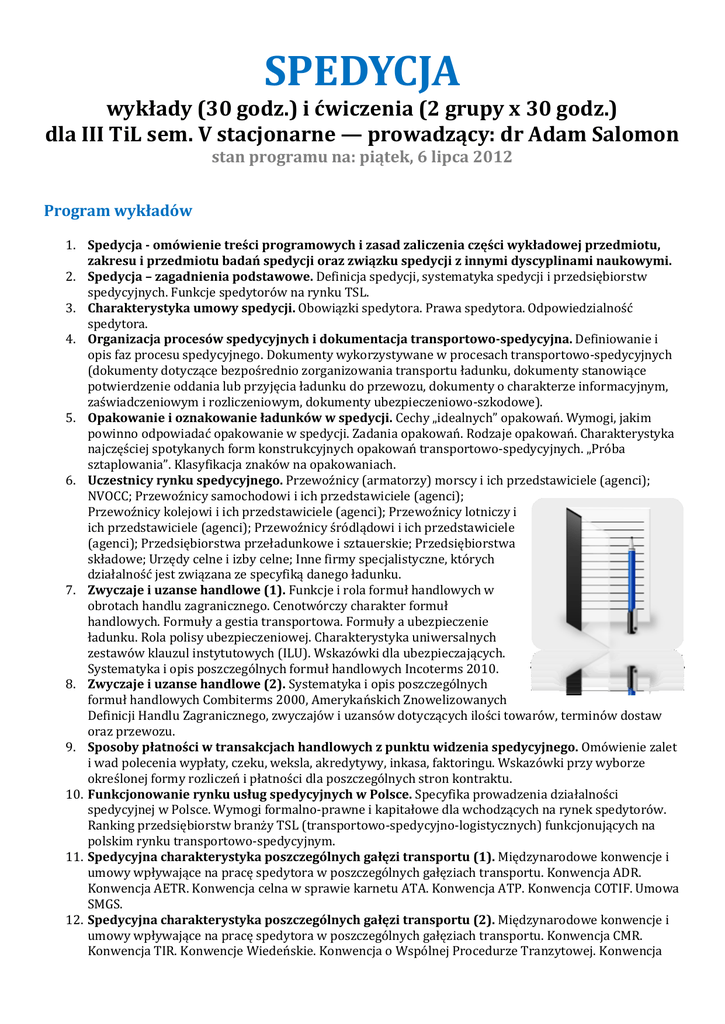 SPEDYCJA wykłady (30 godz.) i ćwiczenia (2 grupy x 30 godz.) dla III TiL sem. V stacjonarne — prowadzący: dr Adam Salomon stan programu na: piątek, 6 lipca 2012 Program wykładów 1. Spedycja - omówienie treści programowych i zasad zaliczenia części wykładowej przedmiotu, zakresu i przedmiotu badań spedycji oraz związku spedycji z innymi dyscyplinami naukowymi. 2. Spedycja – zagadnienia podstawowe. Definicja spedycji, systematyka spedycji i przedsiębiorstw spedycyjnych. Funkcje spedytorów na rynku TSL. 3. Charakterystyka umowy spedycji. Obowiązki spedytora. Prawa spedytora. Odpowiedzialność spedytora. 4. Organizacja procesów spedycyjnych i dokumentacja transportowo-spedycyjna. Definiowanie i opis faz procesu spedycyjnego. Dokumenty wykorzystywane w procesach transportowo-spedycyjnych (dokumenty dotyczące bezpośrednio zorganizowania transportu ładunku, dokumenty stanowiące potwierdzenie oddania lub przyjęcia ładunku do przewozu, dokumenty o charakterze informacyjnym, zaświadczeniowym i rozliczeniowym, dokumenty ubezpieczeniowo-szkodowe). 5. Opakowanie i oznakowanie ładunków w spedycji. Cechy „idealnych” opakowań. Wymogi, jakim powinno odpowiadać opakowanie w spedycji. Zadania opakowań. Rodzaje opakowań. Charakterystyka najczęściej spotykanych form konstrukcyjnych opakowań transportowo-spedycyjnych. „Próba sztaplowania”. Klasyfikacja znaków na opakowaniach. 6. Uczestnicy rynku spedycyjnego. Przewoźnicy (armatorzy) morscy i ich przedstawiciele (agenci); NVOCC; Przewoźnicy samochodowi i ich przedstawiciele (agenci); Przewoźnicy kolejowi i ich przedstawiciele (agenci); Przewoźnicy lotniczy i ich przedstawiciele (agenci); Przewoźnicy śródlądowi i ich przedstawiciele (agenci); Przedsiębiorstwa przeładunkowe i sztauerskie; Przedsiębiorstwa składowe; Urzędy celne i izby celne; Inne firmy specjalistyczne, których działalność jest związana ze specyfiką danego ładunku. 7. Zwyczaje i uzanse handlowe (1). Funkcje i rola formuł handlowych w obrotach handlu zagranicznego. Cenotwórczy charakter formuł handlowych. Formuły a gestia transportowa. Formuły a ubezpieczenie ładunku. Rola polisy ubezpieczeniowej. Charakterystyka uniwersalnych zestawów klauzul instytutowych (ILU). Wskazówki dla ubezpieczających. Systematyka i opis poszczególnych formuł handlowych Incoterms 2010. 8. Zwyczaje i uzanse handlowe (2). Systematyka i opis poszczególnych formuł handlowych Combiterms 2000, Amerykańskich Znowelizowanych Definicji Handlu Zagranicznego, zwyczajów i uzansów dotyczących ilości towarów, terminów dostaw oraz przewozu. 9. Sposoby płatności w transakcjach handlowych z punktu widzenia spedycyjnego. Omówienie zalet i wad polecenia wypłaty, czeku, weksla, akredytywy, inkasa, faktoringu. Wskazówki przy wyborze określonej formy rozliczeń i płatności dla poszczególnych stron kontraktu. 10. Funkcjonowanie rynku usług spedycyjnych w Polsce. Specyfika prowadzenia działalności spedycyjnej w Polsce. Wymogi formalno-prawne i kapitałowe dla wchodzących na rynek spedytorów. Ranking przedsiębiorstw branży TSL (transportowo-spedycyjno-logistycznych) funkcjonujących na polskim rynku transportowo-spedycyjnym. 11. Spedycyjna charakterystyka poszczególnych gałęzi transportu (1). Międzynarodowe konwencje i umowy wpływające na pracę spedytora w poszczególnych gałęziach transportu. Konwencja ADR. Konwencja AETR. Konwencja celna w sprawie karnetu ATA. Konwencja ATP. Konwencja COTIF. Umowa SMGS. 12. Spedycyjna charakterystyka poszczególnych gałęzi transportu (2). Międzynarodowe konwencje i umowy wpływające na pracę spedytora w poszczególnych gałęziach transportu. Konwencja CMR. Konwencja TIR. Konwencje Wiedeńskie. Konwencja o Wspólnej Procedurze Tranzytowej. Konwencja SPEDYCJA wykłady (30 godz.) i ćwiczenia (2 grupy x 30 godz.) dla III TiL sem. V stacjonarne z dr. Adamem Salomonem Barcelońska. Konwencja Narodów Zjednoczonych o Międzynarodowym Multimodalnym Przewozie Towarów. 13. Transport multimodalny z punktu widzenia spedycyjnego. Pojęcie transportu multimodalnego. Rodzaje transportu multimodalnego (przewozy kontenerowe, przewozy „Piggy-back”, przewozy lądowo-morskie). Aspekty organizacyjno-prawne transportu multimodalnego (dokumentacja, rola Operatora Transportu Multimodalnego, kwotowy limit odpowiedzialności Operatora Transportu Multimodalnego za uszkodzenie/utratę ładunku, perspektywy rozwoju transportu multimodalnego w Polsce). 14. Związki spedytorów i organizacje spedycyjne w Polsce. Związki zrzeszające organizacje spedycyjne działające w skali międzynarodowej (FIATA), europejskiej (CLECAT) i polskiej (PISiL). 15. Zakończenie wykładów (wykład rezerwowy). Podstawowa literatura do wykładów Adam Salomon, Spedycja - teoria, przykłady, ćwiczenia, Wydawnictwo Akademii Morskiej w Gdyni, Gdynia 2011 – podręcznik podstawowy do wykładów, ćwiczeń, egzaminu i zaliczenia. Adam Salomon, Spedycja w handlu morskim. Procedury i dokumenty, Wydawnictwo Uniwersytetu Gdańskiego, Gdańsk 2003 Instytutowe Klauzule Ładunkowe (2009) [doc, 217 KB] Combiterms 2000 (English version) [32 KB] Combiterms 2000 (info pl) [72 KB] Piotr M. Sikorski, Tomasz Zembrzycki, Spedycja w praktyce. Poradnik menedżera, CIM, Warszawa 1999 Piotr M. Sikorski, Spedycja w praktyce - wiek XXI, PWT, Warszawa 2008 Reguły Haga-Visby (info pl) [74 KB] Podręcznik spedytora, praca zbiorowa pod red. Danuty Marciniak-Neider i Janusza Neidera, PISiL, Gdynia 2003 Polska Gazeta Transportowa (online): http://www.pgt.pl Pierwszy Serwis Międzynarodowy Transportu i Spedycji (online): http://www.psm.pl Polska Izba Spedycji i Logistyki (online): http://www.pisil.pl Program ćwiczeń wraz z wymaganą literaturą 1. ĆWICZENIA DOTYCZĄCE ZASAD ZALICZENIA ĆWICZEŃ ZE SPEDYCJI – na zajęcia nie trzeba niczego przynosić. 2. ĆWICZENIA DOTYCZĄCE KONSTRUOWANIA UMOWY SPEDYCJI – na zajęcia należy przynieść treść Kodeksu Cywilne