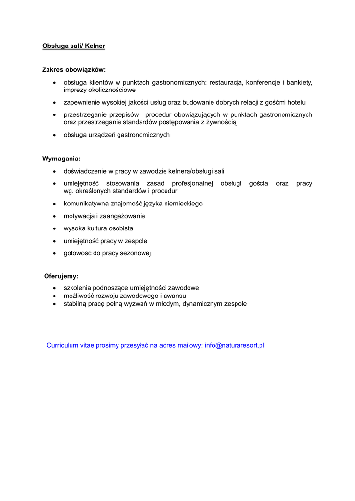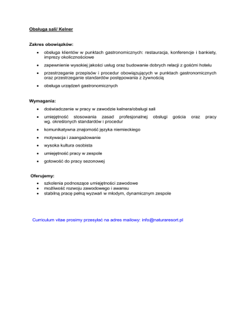 Obsługa sali/ Kelner Zakres obowiązków: obsługa klientów w punktach gastronomicznych: restauracja, konferencje i bankiety, imprezy okolicznościowe zapewnienie wysokiej jakości usług oraz budowanie dobrych relacji z gośćmi hotelu przestrzeganie przepisów i procedur obowiązujących w punktach gastronomicznych oraz przestrzeganie standardów postępowania z żywnością obsługa urządzeń gastronomicznych Wymagania: doświadczenie w pracy w zawodzie kelnera/obsługi sali umiejętność stosowania zasad profesjonalnej wg. określonych standardów i procedur komunikatywna znajomość języka niemieckiego motywacja i zaangażowanie wysoka kultura osobista umiejętność pracy w zespole gotowość do pracy sezonowej obsługi gościa Oferujemy: szkolenia podnoszące umiejętności zawodowe możliwość rozwoju zawodowego i awansu stabilną pracę pełną wyzwań w młodym, dynamicznym zespole Curriculum vitae prosimy przesyłać na adres mailowy: [email protected] oraz pracy