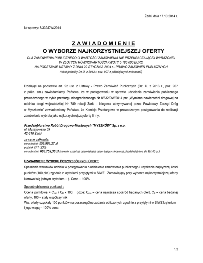 Żarki, dnia 17.10.2014 r. Nr sprawy: 8/332/DW/2014 ZAWIADOMIENIE O WYBORZE NAJKORZYSTNIEJSZEJ OFERTY DLA ZAMÓWIENIA PUBLICZNEGO O WARTOŚCI ZAMÓWIENIA NIE PRZEKRACZAJĄCEJ WYRAŻONEJ W ZŁOTYCH RÓWNOWARTOŚCI KWOTY 5 186 000 EURO NA PODSTAWIE USTAWY Z DNIA 29 STYCZNIA 2004 r.- PRAWO ZAMÓWIEŃ PUBLICZNYCH /tekst jednolity Dz.U. z 2013 r. poz. 907 z późniejszymi zmianami/) Działając na podstawie art. 92 ust. 2 Ustawy - Prawo Zamówień Publicznych (Dz. U. z 2013 r., poz. 907 z późn. zm.) zawiadamiamy Państwa, że w postępowaniu w sprawie udzielenia zamówienia publicznego prowadzonego w trybie przetargu nieograniczonego Nr 8/332/DW/2014 pn: „Wymiana nawierzchni drogowej na odcinku drogi wojewódzkiej Nr 789 relacji Żarki - Niegowa utrzymywanej przez Powiatowy Zarząd Dróg w Myszkowie” zawiadamiamy Państwa, że Komisja Przetargowa w prowadzonym postępowaniu do realizacji zamówienia wybrała jako najkorzystniejszą ofertę firmy: Przedsiębiorstwo Robót Drogowo-Mostowych "MYSZKÓW" Sp. z o.o. ul. Myszkowska 59 42-310 Żarki za cenę całkowitą: cena (netto): 559.961,27 zł podatek VAT: 23% cena (brutto): 688.752,36 zł (słownie: sześćset osiemdziesiąt osiem tysięcy siedemset pięćdziesiąt dwa zł i 36/100 gr.) UZASADNIENIE WYBORU POSZCZEGÓLNYCH OFERT: Spełnienie warunków udziału w postępowaniu o udzielenie zamówienia publicznego i uzyskanie najwyższej ilości punktów (100 pkt.) zgodnie z kryteriami przyjętymi w SIWZ. Zamawiający przy wyborze najkorzystniejszej oferty kierował się jednym kryterium – tj. Cena – 100% Sposób obliczenia punktacji : Ocena punktowa = Cmin / CB x 100; gdzie: Cmin – cena najniższa spośród badanych ofert, CB – cena badanej oferty, 100 – stały współczynnik Ww. oferty uzyskały 100 punktów na poszczególne zadania obliczonych zgodnie z przyjętymi w SIWZ kryterium i jego wagą – 100% cena. 1/2 INFORMACJA O ZŁOŻONYCH OFERTACH ZAWIERAJĄCA PUNKTACJĘ PRZYZNANĄ OFERTOM W KAŻDYM KRYTERIUM OCENY OFERT I ŁĄCZNĄ PUNKTACJĘ: Nr oferty i nazwa Wykonawcy PUNKTACJA PRZYZNANA OFERENTOM W KAŻDYM KRYTERIUM OCENY OFERT I ŁĄCZNA PUNKTACJA KRYTERIUM: CENA 100% Oferowana cena całkowita 91,05 pkt. cena (netto): 615.028,00 zł podatek VAT: 23% cena (brutto): 756.484,44 zł 93,97 pkt. cena (netto): 595.901,00 zł podatek VAT: 23% cena (brutto): 732.958,23 zł 93,51 pkt. cena (netto): 598.848,90 zł podatek VAT: 23% cena (brutto): 736.584,15 zł 100,0 pkt. cena (netto): 559.961,27 zł podatek VAT: 23% cena (brutto): 688.752,36 zł Oferta Nr 1 Przedsiębiorstwo UsługowoHandlowe "DOMAX" Arkadiusz Mika ul. Grabińska 8; 42-283 Boronów Oferta Nr 2 Przedsiębiorstwo HandlowoUsługowe "LARIX" Sp. z o.o. ul. Klonowa 11; 42-700 Lubliniec Oferta Nr 3 "TRANZIT" Sp. z o.o. Lubachowy 68; 29-130 Moskorzew Oferta Nr 4 Przedsiębiorstwo Robót DrogowoMostowych "MYSZKÓW" Sp. z o.o. ul. Myszkowska 59; 42-310 Żarki Podstawą prawną dokonanego wyboru jest art. 91 ust. 1 PZP oraz Kodeks cywilny. Józef PABIAN Dyrektor Powiatowego Zarządu Dróg w Myszkowie Otrzymują: 1. Strona internetowa www.pzd.myszkow.pl 2. Tablica ogłoszeń siedziba PZD Myszków 2/2