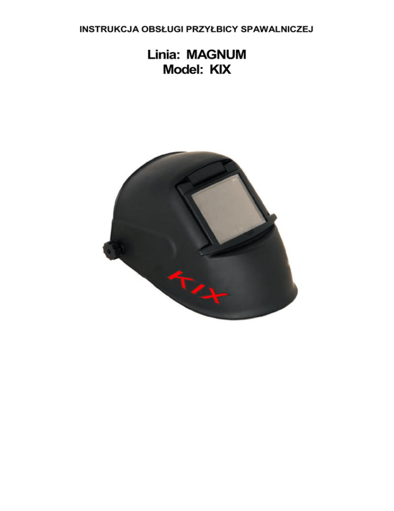 INSTRUKCJA OBSŁUGI PRZYŁBICY SPAWALNICZEJ Linia: MAGNUM Model: KIX -i- 1. DANE TECHNICZNE Przeznaczenie: Wyłącznie do spawania łukowego Przyłbica: Wykonana ze specjalnego materiału polimerowego Stopień ochrony Standard 11 DIN (możliwość zmiany w zależności od rodzaju założonego filtra od 8 DIN do13 DIN) Wymiary filtrów Filtr wewnętrzny 110x90 [mm] Filtr ochronny 110x90 [mm] Filtr zewnętrzny 110x90 [mm] Masa całkowita 390 [g] 2. OSTRZEŻENIE W celu zminimalizowania ryzyka wystąpienia utraty zdrowia lub zniszczenia sprzętu powinny być zachowane podstawowe środki ostrożności w czasie użytkowania przyłbicy. Przeczytaj wszystkie wskazówki przed użyciem przyłbicy spawalniczej. 1. 2. 3. 4. 5. 6. 7. Z przyłbicy powinny korzystać wyłącznie osoby dorosłe. Przyłbica przeznaczona jest do ochrony twarzy i oczu podczas procesu spawania łukowego i tylko do tego celu powinna być wykorzystywana. Przyłbice należy utrzymywać w czystości w celu jej prawidłowego działania oraz zapewnienia jej optymalnej sprawności. Przed użyciem przyłbicy należy sprawdzić czy przyłbica jest kompletna i nieuszkodzona. Wszelkie elementy przyłbicy zużyte lub zniszczone powinny być wymienione. Używaj oryginalnych części zamiennych. W żadnym wypadku nie wolno kłaść przyłbicy na gorącej powierzchni. 3. ZASTOSOWANIE • • • • Przyłbica nie została zaprojektowana do cięcia laserowego, oraz spawania gazowego. Przyłbica została zaprojektowana w celu ochrony oczu i twarzy przed odpryskami, iskrami oraz promieniowaniem podczerwonym (IR) oraz ultrafioletowym (UV) występującym podczas procesu spawania łukowego. Przyłbica nie stanowi ochrony przed substancjami wybuchowymi, szkodliwymi oparami i kwasami. Przyłbicę można stosować podczas spawania MMA, MIG/MAG, TIG. Nigdy nie należy używać przyłbicy bez prawidłowo zamontowanego filtra. -2- 4. KONSERWACJA I PRZECHOWYWANIE • • • • Temperatura przechowywania: -20°C ÷ +70°C. Filtr należy utrzymywać w czystości. W przypadku zabrudzenia filtra, czyścić go przy użyciu wilgotnej miękkiej szmatki (w żadnym wypadku nie używać agresywnych, lub powodujących zarysowania środków czyszczących). Jeśli osłona filtru pokryje się odpryskami bądź innymi zanieczyszczeniami utrudniającymi pracę, należy ją bezzwłocznie wymienić. Nie przechowywać przyłbicy w pobliżu źródeł ciepła, lub innych miejscach mogących spowodować jej uszkodzenie. 5. REGULACJA PRZYŁBICY Przyłbica spawalnicza wyposażona jest w nagłowię umożliwiające dopasowanie jej do indywidualnych potrzeb, zapewniając każdemu użytkownikowi właściwy kąt obserwacji oraz wygodę. Zobrazowane jest to na zdjęciach poniżej. Regulacja przyłbicy w pionie, poziomie odbywa się poprzez przestawienie odpowiedniego zatrzasku w żądaną pozycję. Regulacja obwodu odbywa się za pomocą pokrętła umieszczonego z tyłu nagłowia. Pokrętło to należy wcisnąć i przekręcić w celu ustawienia żądanego rozmiaru. W celu uzyskania najlepszej ostrości zaleca się ustawić jak najmniejszą odległość pomiędzy filtrem a oczami. Dzięki prawidłowemu ustawieniu przyłbicy uzyskuje się maksymalną ochronę twarzy przed odpryskami spawalniczymi oraz oczu przed promieniowaniem ultrafioletowym (UV) i podczerwonym (IR). -3-