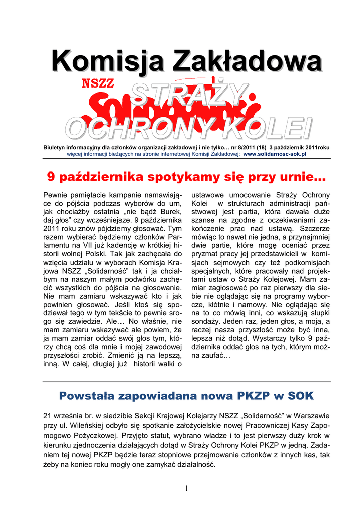 Komisja Zakładowa STRAŻY OCHRONY KOLEI Biuletyn informacyjny dla członków organizacji zakładowej i nie tylko… nr 8/2011 (18) 3 październik 2011roku więcej informacji bieżących na stronie internetowej Komisji Zakładowej: www.solidarnosc-sok.pl 9 października spotykamy się przy urnie… Pewnie pamiętacie kampanie namawiające do pójścia podczas wyborów do urn, jak chociażby ostatnia „nie bądź Burek, daj głos” czy wcześniejsze. 9 października 2011 roku znów pójdziemy głosować. Tym razem wybierać będziemy członków Parlamentu na VII już kadencję w krótkiej historii wolnej Polski. Tak jak zachęcała do wzięcia udziału w wyborach Komisja Krajowa NSZZ „Solidarność” tak i ja chciałbym na naszym małym podwórku zachęcić wszystkich do pójścia na głosowanie. Nie mam zamiaru wskazywać kto i jak powinien głosować. Jeśli ktoś się spodziewał tego w tym tekście to pewnie srogo się zawiedzie. Ale… No właśnie, nie mam zamiaru wskazywać ale powiem, że ja mam zamiar oddać swój głos tym, którzy chcą coś dla mnie i mojej zawodowej przyszłości zrobić. Zmienić ją na lepszą, inną. W całej, długiej już historii walki o ustawowe umocowanie Straży Ochrony Kolei w strukturach administracji państwowej jest partia, która dawała duże szanse na zgodne z oczekiwaniami zakończenie prac nad ustawą. Szczerze mówiąc to nawet nie jedna, a przynajmniej dwie partie, które mogę oceniać przez pryzmat pracy jej przedstawicieli w komisjach sejmowych czy też podkomisjach specjalnych, które pracowały nad projektami ustaw o Straży Kolejowej. Mam zamiar zagłosować po raz pierwszy dla siebie nie oglądając się na programy wyborcze, kłótnie i namowy. Nie oglądając się na to co mówią inni, co wskazują słupki sondaży. Jeden raz, jeden głos, a moja, a raczej nasza przyszłość może być inna, lepsza niż dotąd. Wystarczy tylko 9 października oddać głos na tych, którym można zaufać… Powstała zapowiadana nowa PKZP w SOK 21 września br. w siedzibie Sekcji Krajowej Kolejarzy NSZZ „Solidarność” w Warszawie przy ul. Wileńskiej odbyło się spotkanie założycielskie nowej Pracowniczej Kasy Zapomogowo Pożyczkowej. Przyjęto statut, wybrano władze i to jest pierwszy duży krok w kierunku zjednoczenia działających dotąd w Straży Ochrony Kolei PKZP w jedną. Zadaniem tej nowej PKZP będzie teraz stopniowe przejmowanie członków z innych kas, tak żeby na koniec roku mogły one zamykać działalność. 1 2 Obradowała Komisja Zakładowa SOK 29 września br. w siedzibie Sekcji Krajowej Kolejarzy NSZZ „Solidarność” w Warszawie przy ul. Wileńskiej odbyło się posiedzenie Komisji Zakładowej NSZZ „Solidarność” SOK. Posiedzenie w całości poświęcone było obecnej sytuacji w Straży Ochrony Kolei, kwestiom finansowym, które musiały być uregulowane na tym szczeblu oraz fundacji sztandaru, który już niedługo powinien być przekazany Komisji Zakładowej. Tyle ogólna tematyka, a przekazując więcej szczegółów: Przewodniczący poinformował zebranych o tym co dzieje się w Komendzie Głównej, o rozpoczynającym się niebawem cyklu szkoleń językowych dla ok. 500 funkcjonariuszy, o innych szkoleniach jakie będą przechodzili wszyscy funkcjonariusze w związku z Euro 2012, o zakończeniu przetargu na 52 samochody terenowe podczas którego został wybrany Mitsubishi L200, o tym, że zmienił się dostawca umundurowania służbowego. Umundurowanie to jest oceniane dużo wyżej niż dotąd dostarczane. Ponadto poinformował, że kierownictwo Komendy Głównej czyni starania by osoby funkcyjne zamiast umundurowania polowego otrzymywały umundurowanie wyjściowe, które jak wszyscy sygnalizują by- łoby bardziej przydatne. O zakupach wyposażenia dodatkowego, o przygotowaniach do przetargu na 2 pojazdy z mobilnym monitoringiem, a także rozmowach na temat budowy 9 centrów monitoringu wizyjnego na najważniejszych obiektach infrastruktury. Innym tematem było poinformowanie zebranych o utworzeniu nowej Pracowniczej Kasy Zapomogowo Pożyczkowej oraz o tym, iż związki zawodowe nadzorujące tworzenie się tej kasy zrobią wszystko by przejście obecnych członków siedmiu kas do nowej odbyło się bez jakichkolwiek problemów, a jej późniejsze sprawne funkcjonowanie też będzie tak zorganizowane żeby nikt nie odczuwał zmian. Komisja Zakładowa podjęła decyzję o wyglądzie sztandaru, który jest właśnie fundowany naszej organizacji związkowej. Wszystko wskazuje na to, iż poświęcenie gotowego już sztandaru odbędzie się w listopadzie w Częstochowie. Projekt sztandaru niezwłocznie po jego zatwierdzeniu będzie dostępny na naszej stronie internetowej. Wszystkich zainteresowanych odsyłam właśnie tam już niebawem. Rozmawiano również o problemach z jakimi borykają się poszczególne Komisje Oddziałowe. Nie ma zgody na odbieranie praw pracowniczych Jak możemy się dowiedzieć z komunikatu Międzyzwiązkowego Komitetu Strajkowego na 5 października zaplanowana była pikieta pod Ministerstwem Infrastruktury w związku w brakiem porozumienia co do realizacji ulg przejazdowych na rok 2012, a także związanego z tym wypowiedzenia Ponadzakładowego Układu Zbiorowego Pracy dla pracodawców zrzeszonych w Związku Pracodawców Kolejowych (ZPK). Na prośbę Przewodniczącego Krzysztofa Mamińskiego akcję odroczono ponieważ jak podkreślił Prezes Mamiński istnieje duże prawdopodobieństwo podtrzymania wcześniej wynegocjowanych 3 ulg w kształcie jak dotąd do końca 2012 roku. W tym celu będzie rozmawiał z przedstawicielami przewoźników. Komunikat w sprawie akcji protestacyjnej zaplanowanej na dzień 5.10.2011r. związanej z brakiem regulacji ulg przejazdowych na 2012 rok wynikających z wypowiedzenia PUZP W dniu 29.09.2011r. odbyto się spotkanie przedstawicieli Federacji Związków Zawodowych Pracowników PKP, Konfederacji Kolejowych Związków Zawodowych i Sekcji Krajowej Ko