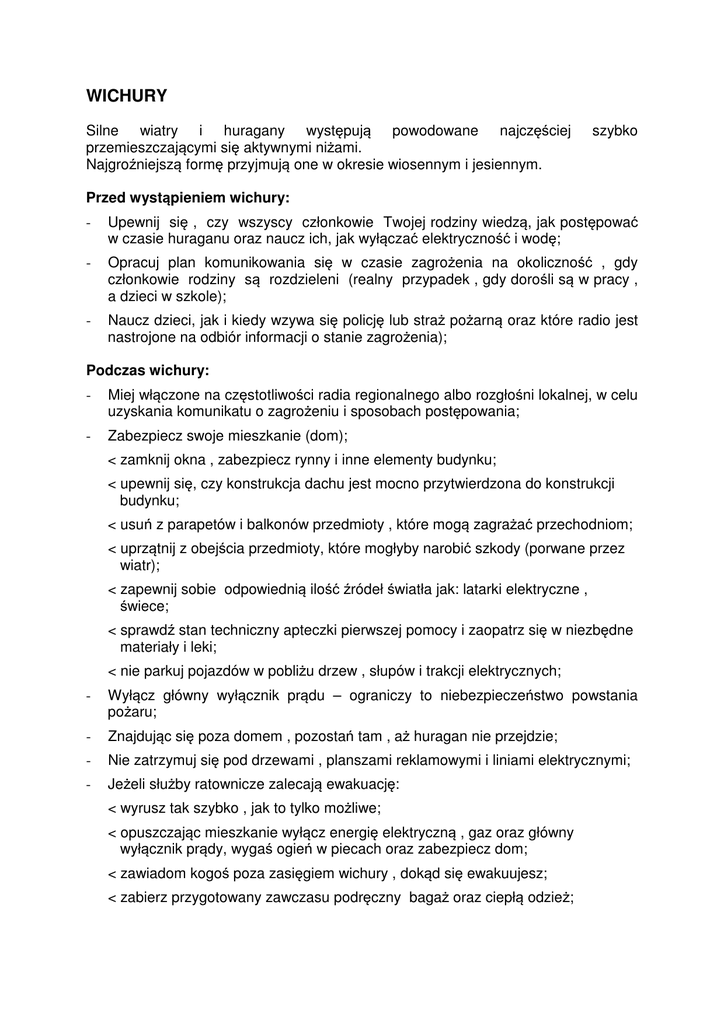 WICHURY Silne wiatry i huragany występują powodowane najczęściej przemieszczającymi się aktywnymi niżami. Najgroźniejszą formę przyjmują one w okresie wiosennym i jesiennym. szybko Przed wystąpieniem wichury: - Upewnij się , czy wszyscy członkowie Twojej rodziny wiedzą, jak postępować w czasie huraganu oraz naucz ich, jak wyłączać elektryczność i wodę; - Opracuj plan komunikowania się w czasie zagrożenia na okoliczność , gdy członkowie rodziny są rozdzieleni (realny przypadek , gdy dorośli są w pracy , a dzieci w szkole); - Naucz dzieci, jak i kiedy wzywa się policję lub straż pożarną oraz które radio jest nastrojone na odbiór informacji o stanie zagrożenia); Podczas wichury: - Miej włączone na częstotliwości radia regionalnego albo rozgłośni lokalnej, w celu uzyskania komunikatu o zagrożeniu i sposobach postępowania; - Zabezpiecz swoje mieszkanie (dom); < zamknij okna , zabezpiecz rynny i inne elementy budynku; < upewnij się, czy konstrukcja dachu jest mocno przytwierdzona do konstrukcji budynku; < usuń z parapetów i balkonów przedmioty , które mogą zagrażać przechodniom; < uprzątnij z obejścia przedmioty, które mogłyby narobić szkody (porwane przez wiatr); < zapewnij sobie odpowiednią ilość źródeł światła jak: latarki elektryczne , świece; < sprawdź stan techniczny apteczki pierwszej pomocy i zaopatrz się w niezbędne materiały i leki; < nie parkuj pojazdów w pobliżu drzew , słupów i trakcji elektrycznych; - Wyłącz główny wyłącznik prądu – ograniczy to niebezpieczeństwo powstania pożaru; - Znajdując się poza domem , pozostań tam , aż huragan nie przejdzie; - Nie zatrzymuj się pod drzewami , planszami reklamowymi i liniami elektrycznymi; - Jeżeli służby ratownicze zalecają ewakuację: < wyrusz tak szybko , jak to tylko możliwe; < opuszczając mieszkanie wyłącz energię elektryczną , gaz oraz główny wyłącznik prądy, wygaś ogień w piecach oraz zabezpiecz dom; < zawiadom kogoś poza zasięgiem wichury , dokąd się ewakuujesz; < zabierz przygotowany zawczasu podręczny bagaż oraz ciepłą odzież; Po wichurze: - Udziel pierwszej pomocy rannym i poszkodowanym osobom; - Unikaj leżących i zwisających przewodów elektrycznych; - Ostrożnie wkraczaj do swego domu; - Sprawdź instalacją (elektryczną , wodociągową , kanalizacyjna i gazową) w zniszczonym domu; O wszystkich zdarzeniach , mających istotne znaczenie dla bezpieczeństwa ludzi informuj Służby dyżurne Straży Pożarnej , Policji , Pogotowie Energetyczne i inne.