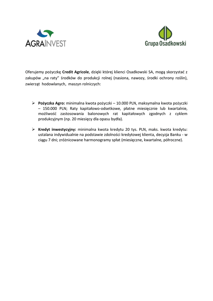 Oferujemy pożyczkę Credit Agricole, dzięki której klienci Osadkowski SA, mogą skorzystać z zakupów „na raty” środków do produkcji rolnej (nasiona, nawozy, środki ochrony roślin), zwierząt hodowlanych, maszyn rolniczych: Pożyczka Agro: minimalna kwota pożyczki – 10.000 PLN, maksymalna kwota pożyczki – 150.000 PLN; Raty kapitałowo-odsetkowe, płatne miesięcznie lub kwartalnie, możliwość zastosowania balonowych rat kapitałowych zgodnych z cyklem produkcyjnym (np. 20 miesięcy dla opasu bydła). Kredyt inwestycyjny: minimalna kwota kredytu 20 tys. PLN, maks. kwota kredytu: ustalana indywidualnie na podstawie zdolności kredytowej klienta, decyzja Banku - w ciągu 7 dni; zróżnicowane harmonogramy spłat (miesięczne, kwartalne, półroczne).