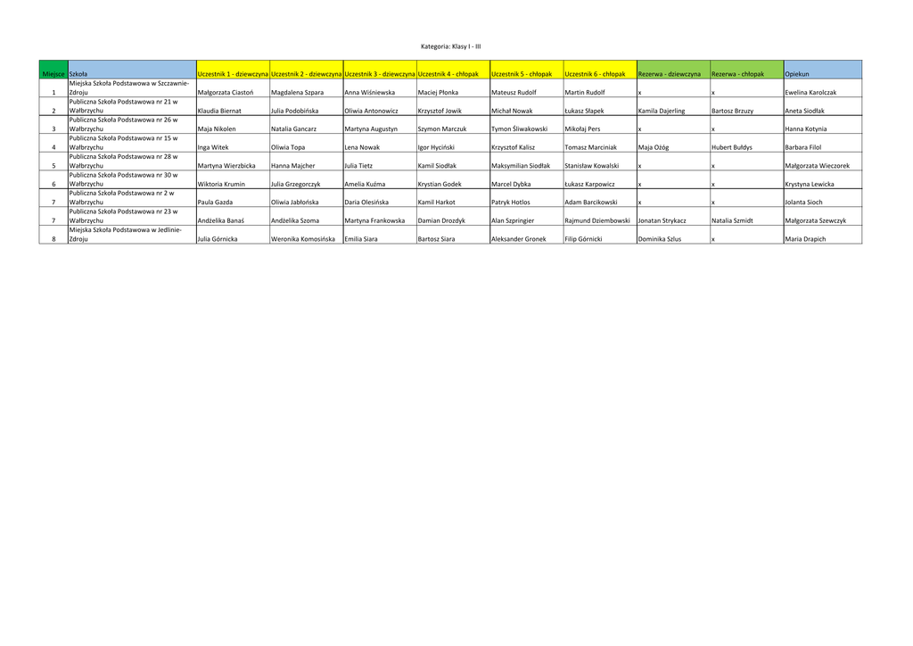 Kategoria: Klasy I - III Miejsce Szkoła Miejska Szkoła Podstawowa w SzczawnieZdroju 1 Publiczna Szkoła Podstawowa nr 21 w Wałbrzychu 2 Publiczna Szkoła Podstawowa nr 26 w Wałbrzychu 3 Publiczna Szkoła Podstawowa nr 15 w Wałbrzychu 4 Publiczna Szkoła Podstawowa nr 28 w Wałbrzychu 5 Publiczna Szkoła Podstawowa nr 30 w Wałbrzychu 6 Publiczna Szkoła Podstawowa nr 2 w 7 Wałbrzychu Publiczna Szkoła Podstawowa nr 23 w 7 Wałbrzychu Miejska Szkoła Podstawowa w JedlinieZdroju 8 Uczestnik 1 - dziewczyna Uczestnik 2 - dziewczyna Uczestnik 3 - dziewczyna Uczestnik 4 - chłopak Uczestnik 5 - chłopak Uczestnik 6 - chłopak Rezerwa - dziewczyna Rezerwa - chłopak Opiekun Małgorzata Ciastoń Magdalena Szpara Anna Wiśniewska Maciej Płonka Mateusz Rudolf Martin Rudolf x x Ewelina Karolczak Klaudia Biernat Julia Podobińska Oliwia Antonowicz Krzysztof Jowik Michał Nowak Łukasz Słapek Kamila Dajerling Bartosz Brzuzy Aneta Siodłak Maja Nikolen Natalia Gancarz Martyna Augustyn Szymon Marczuk Tymon Śliwakowski Mikołaj Pers x x Hanna Kotynia Inga Witek Oliwia Topa Lena Nowak Igor Hyciński Krzysztof Kalisz Tomasz Marciniak Maja Ożóg Hubert Bułdys Barbara Filol Martyna Wierzbicka Hanna Majcher Julia Tietz Kamil Siodłak Maksymilian Siodłak Stanisław Kowalski x x Małgorzata Wieczorek Wiktoria Krumin Julia Grzegorczyk Amelia Kuźma Krystian Godek Marcel Dybka Łukasz Karpowicz x x Krystyna Lewicka Paula Gazda Oliwia Jabłońska Daria Olesińska Kamil Harkot Patryk Hotlos Adam Barcikowski x x Jolanta Sioch Andżelika Banaś Andżelika Szoma Martyna Frankowska Damian Drozdyk Alan Szpringier Rajmund Dziembowski Jonatan Strykacz Natalia Szmidt Małgorzata Szewczyk Julia Górnicka Weronika Komosińska Emilia Siara Bartosz Siara Aleksander Gronek Filip Górnicki Dominika Szlus x Maria Drapich