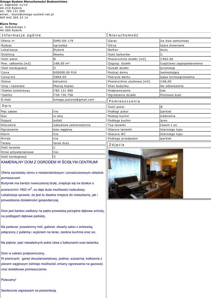 Omega-System Nieruchomości Budownictwo ul. Dąbrówki 1c/14 44-210 Rybnik tel. 785 131 000 email.: [email protected] NIP 642 305 33 14 Biuro firmy: ul. Sobieskiego 1 44-200 Rybnik Informacje ogólne Nieruchomość Oferta nr OMG-DS-179 Garaż na dwa samochody Rodzaj sprzedaż Okna stare drewniane Lokalizacja Rybnik Balkon duży Dzielnica Nowiny Ilość balkonów 1 Ilość pokoi 8 Powierzchnia działki [m2] 1902.00 Pow. całkowita [m2] 168.00 m² Zagosp. działki częściowo zagospodarowana Ilość kondygnacji 3 Kształt działki prostokąt Cena 650000.00 PLN Rodzaj domu wolnostojący Cena/m2 3869.05 Pokrycie dachu papa termozgrzewalna Status aktualna Powierzchnia użytkowa [m2] 168,00 Imię i nazwisko Maciej Kopiec Stan budynku do odświeżenia Telefon komórkowy 785 131 000 Podpiwniczenie tak Telefon 730 730 758 Ogrodzenie działki frontowe kute E-mail [email protected] Opis Pomieszczenia Ilość pokoi 8 Plac zabaw nie Podłogi pokoi parkiet Gaz w ulicy Rodzaj kuchni oddzielna Dojazd asfalt Podłoga kuchni gres Otoczenie zabudowa jednorodzinna Typ łazienki razem z wc Ogrzewanie piec węglowy Glazura łazienki starszego typu Alarm nie Glazura WC starszego typu Winda nie Podłoga przedpokoi parkiet Tarasy taras duży Ilość tarasów 1 Drzwi antywłamaniowe nie Ilość kondygnacji 3 KAMERALNY DOM Z OGRODEM W ŚCISŁYM CENTRUM! Oferta sprzedaży domu o niestandardowym i ponadczasowym układzie pomieszczeń. Budynek ma bardzo nowoczesną bryłę, znajduje się na działce o powierzchni 1902 m2 , co daje duże możliwości rozbudowy. Lokalizacja sprawie, że jest to idealne miejsce do mieszkania, jak i prowadzenia działalności gospodarczej. Dom jest bardzo zadbany na piętro prowadzą porządne dębowe schody, na podłogach dębowe parkiety. Na parterze: przestronny holl, gabinet, otwarty salon z antresolą, połączony z jadalnią i wyjściem na taras, osobna kuchnia oraz wc, Na piętrze: pięć niezależnych pokoi (dwa z balkonami) oraz łazienka. Dom w całości podpiwniczony. W piwnicach: garaż dwustanowiskowy, pralnia, suszarnia, kotłownia z piecem węglowym (istnieje możliwość zmiany ogrzewania na gazowe) oraz dodatkowe pomieszczenie. Polecamy! Serdecznie zapraszam na prezentację. Zdjęcia Kontakt: 730 730 758 Pełna oferta : www.omega-system.net.pl OMEGA-SYSTEM 44-200 Rybnik ul. Wiejska 10 [email protected] Omega-System Nieruchomości Budownictwo ul. Dąbrówki 1c/14 44-210 Rybnik tel. 785 131 000 email.: [email protected] NIP 642 305 33 14 Biuro firmy: ul. Sobieskiego 1 44-200 Rybnik