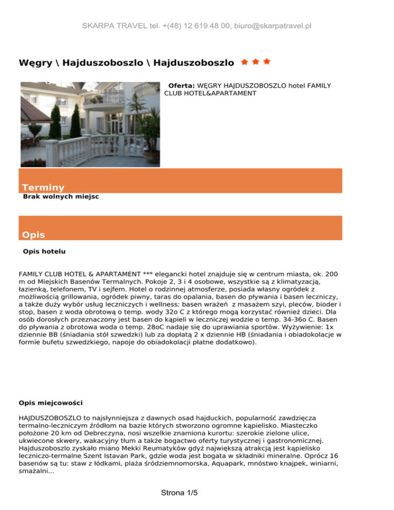 SKARPA TRAVEL tel. +(48) 12 619 48 00, [email protected] Węgry \ Hajduszoboszlo \ Hajduszoboszlo Oferta: WĘGRY HAJDUSZOBOSZLO hotel FAMILY CLUB HOTEL&APARTAMENT Terminy Brak wolnych miejsc Opis Opis hotelu FAMILY CLUB HOTEL & APARTAMENT *** elegancki hotel znajduje się w centrum miasta, ok. 200 m od Miejskich Basenów Termalnych. Pokoje 2, 3 i 4 osobowe, wszystkie są z klimatyzacją, łazienką, telefonem, TV i sejfem. Hotel o rodzinnej atmosferze, posiada własny ogródek z możliwością grillowania, ogródek piwny, taras do opalania, basen do pływania i basen leczniczy, a także duży wybór usług leczniczych i wellness: basen wrażeń z masażem szyi, pleców, bioder i stop, basen z woda obrotową o temp. wody 32o C z którego mogą korzystać również dzieci. Dla osób dorosłych przeznaczony jest basen do kąpieli w leczniczej wodzie o temp. 34-36o C. Basen do pływania z obrotowa woda o temp. 28oC nadaje się do uprawiania sportów. Wyżywienie: 1x dziennie BB (śniadania stół szwedzki) lub za dopłatą 2 x dziennie HB (śniadania i obiadokolacje w formie bufetu szwedzkiego, napoje do obiadokolacji płatne dodatkowo). Opis miejcowości HAJDUSZOBOSZLO to najsłynniejsza z dawnych osad hajduckich, popularność zawdzięcza termalno-leczniczym źródłom na bazie których stworzono ogromne kąpielisko. Miasteczko położone 20 km od Debreczyna, nosi wszelkie znamiona kurortu: szerokie zielone ulice, ukwiecone skwery, wakacyjny tłum a także bogactwo oferty turystycznej i gastronomicznej. Hajduszoboszlo zyskało miano Mekki Reumatyków gdyż największą atrakcją jest kąpielisko leczniczo-termalne Szent Istavan Park, gdzie woda jest bogata w składniki mineralne. Oprócz 16 basenów są tu: staw z łódkami, plaża śródziemnomorska, Aquapark, mnóstwo knajpek, winiarni, smażalni... Strona 1/5 SKARPA TRAVEL tel. +(48) 12 619 48 00, [email protected] Cena w PLN obejmuje przejazd autokarem lub dojazd własny, opłata rezerwacyjna, ubezpieczenie KL+NNW +choroby przewlekłe i nowotworowe+bagaż, turystyczny fundusz gwarancyjny. Cena w EUR obejmuje 7 lub 14 noclegów, wyżywienie wg oferty, korzystanie na terenie hotelu z basenu do pływania, basenu wrażeń, kąpieli z bąbelkami, basenu z wodą termalną, leżaki, sauna, sauna parowa, mobilny rezydent węgierski, Dopłaty 1. Taksa klimatyczna płatna na miejscu ok . 500 HUF /dzień/osoba od 18 lat, (ok . 1,8 EUR). 2. Możliwość wykupienia obiadokolacji w cenie : 30 EUR / 7 dni osoba dorosła, 15 EUR / 7 dni dziecko do 12 lat. Zniżki 1. Dziecko do 5 lat zajmujące łóżko razem z rodzicami, bez świadczeń, otrzymuje pobyt darmowy, płaci tylko 50 zł / 7 dni, przy dojeździe autokarem 240 zł / 7 dni. 2. Dziecko 5-12 lat na dostawce płaci w terminie: 07.01 - 03.06 i 26.08 - 16.12 130 zł +90 EUR/7 dni, przy dojeździe autokarem 320 zł + 90 EUR/7 dni. 03.06 - 26.08 130 zł + 100 EUR/7dni, przy dojeździe autokarem 320 zł + 100 EUR/7 dni. Uwagi organizatora 1.Kwota w złotych płatna jest w Polsce, kwota w EUR płatna na Węgrzech. 2.Przy dojeździe własnym, gdy potrzebna jest faktura na całość i przy zakupie ubezpieczenia od kosztów rezygnacji wtedy obowiązkowo równowartość kwoty w EUR płatna jest w Polsce. Kwota w EUR przeliczana jest na zł wg kursu NBP pieniądz sprzedaż z dnia ostatniej wpłaty. 3.W dniu wykupienia imprezy/ wpłaty zaliczki klient ma możliwość wykupienia dodatkowego Strona 2/5 SKARPA TRAVEL tel. +(48) 12 619 48 00, [email protected] ubezpieczenia od kosztów rezygnacji z imprezy zgodnie z Ogólnymi Warunkmi Ubezpieczenia KOSZTÓW IMPREZY TURYSTYCZNEJ w wysokości 3,3% jednak nie później niż 5 dni od dnia podpisania umowy. 4. Wycieczki fakultatywne organizowane są przez lokalne biura podróży. 5.Doba hotelowa rozpoczyna się o godz 14 i kończy o godz 9. 6. Miejsca i godziny odjazdów autokarów podano w rozkładzie jazdy 7. Potrzebny DOWÓD OSOBISTY lub PASZPORT ! Prosze pamiętać również o dokumencie dla dzieci. 8. Dla osób dojeżdżających do Krakowa możemy zarezerwować przednocleg w cenie od 100 zł. 9. STAŁY KLIENT: obejmuje osoby korzystające trzeci kolejny rok z naszej oferty! Uwagi przewoźnika 1.Transport na trasach antenowych w Polsce możliwy jest mikrobusem, autokarem klasy turystycznej, samochodem osobowym lub innym przewoźnikiem np. Polskim Busem, Luxbusem, PKP, PKS itp. Ewentualną zmianę godzin odjazdów podamy najpóźniej na 24 godziny przed odjazdem. Trasa połączeń na terenie kraju zależy od zgłoszeń z poszczególnych miast, co może spowodować, ze przejazd nie będzie realizowany najkrótszą z możliwych tras. 2. Na trasach poza granicami Polski transport odbywa się autokarami wyposażonymi w siedzenia uchylne, klimatyzację, toalety, video i nagłośnienie. Przy małej ilości osób, możliwość przewozu uczestników małym autobusem bez WC i mini baru, wtedy toalety na postojach płatne przez przewoźnika. 3. Podane godziny wyjazdów i przyjazdów mogą ulec zmianie z różnych przyczyn np. złe warunki drogowe, atmosferyczne, zwiększanie ruchu na drogach szczególnie w szczycie sezonu letniego i inne. 4. Prosimy o przybycie na miejsce zbiórki najpóźniej 15 minut przed planowaną godziną odjazdu. Miejsca w autokarze są przydzielane w kolejności podpisania umowy, a klienci o miejscach informowani są przez obsługę na miejscu zbiórki. W autokarze obowiązuje całkowity zakaz palenia papierosów oraz spożywania alkoholu. Osoby korzystające z samego przejazdu, powinny obowiązkowo ubezpieczyć się na czas pobytu. Przewoźnik gwarantuje tylko ubezpieczenie na czas przejazdu. Ramowy program imprezy (klasyczny 7 noclegowy) 1 dzień wyjazd z Polski wg rozkładu jazdy, przyjazd na Węgry w godzinach południowych 2-7 dzień WYPOCZYNEK możliwość wykupienia wycieczek fakultatywnych, zabiegi lecznicze, itp. 8 dzień wykwaterowanie do godziny 9:00, czas wolny. Wyjazd wg rozkładu jazdy przejazd przez Słowację. Przejazd do Polski w g