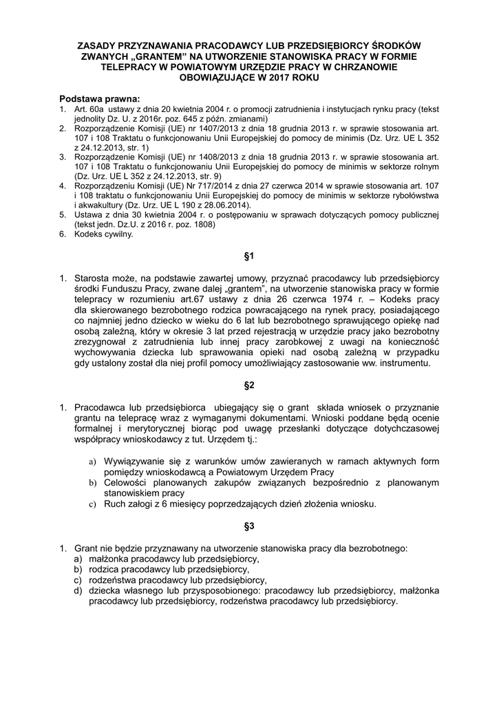 ZASADY PRZYZNAWANIA PRACODAWCY LUB PRZEDSIĘBIORCY ŚRODKÓW ZWANYCH „GRANTEM” NA UTWORZENIE STANOWISKA PRACY W FORMIE TELEPRACY W POWIATOWYM URZĘDZIE PRACY W CHRZANOWIE OBOWIĄZUJĄCE W 2017 ROKU Podstawa prawna: 1. Art. 60a ustawy z dnia 20 kwietnia 2004 r. o promocji zatrudnienia i instytucjach rynku pracy (tekst jednolity Dz. U. z 2016r. poz. 645 z późn. zmianami) 2. Rozporządzenie Komisji (UE) nr 1407/2013 z dnia 18 grudnia 2013 r. w sprawie stosowania art. 107 i 108 Traktatu o funkcjonowaniu Unii Europejskiej do pomocy de minimis (Dz. Urz. UE L 352 z 24.12.2013, str. 1) 3. Rozporządzenie Komisji (UE) nr 1408/2013 z dnia 18 grudnia 2013 r. w sprawie stosowania art. 107 i 108 Traktatu o funkcjonowaniu Unii Europejskiej do pomocy de minimis w sektorze rolnym (Dz. Urz. UE L 352 z 24.12.2013, str. 9) 4. Rozporządzeniu Komisji (UE) Nr 717/2014 z dnia 27 czerwca 2014 w sprawie stosowania art. 107 i 108 traktatu o funkcjonowaniu Unii Europejskiej do pomocy de minimis w sektorze rybołówstwa i akwakultury (Dz. Urz. UE L 190 z 28.06.2014). 5. Ustawa z dnia 30 kwietnia 2004 r. o postępowaniu w sprawach dotyczących pomocy publicznej (tekst jedn. Dz.U. z 2016 r. poz. 1808) 6. Kodeks cywilny. §1 1. Starosta może, na podstawie zawartej umowy, przyznać pracodawcy lub przedsiębiorcy środki Funduszu Pracy, zwane dalej „grantem”, na utworzenie stanowiska pracy w formie telepracy w rozumieniu art.67 ustawy z dnia 26 czerwca 1974 r. – Kodeks pracy dla skierowanego bezrobotnego rodzica powracającego na rynek pracy, posiadającego co najmniej jedno dziecko w wieku do 6 lat lub bezrobotnego sprawującego opiekę nad osobą zależną, który w okresie 3 lat przed rejestracją w urzędzie pracy jako bezrobotny zrezygnował z zatrudnienia lub innej pracy zarobkowej z uwagi na konieczność wychowywania dziecka lub sprawowania opieki nad osobą zależną w przypadku gdy ustalony został dla niej profil pomocy umożliwiający zastosowanie ww. instrumentu. §2 1. Pracodawca lub przedsiębiorca ubiegający się o grant składa wniosek o przyznanie grantu na telepracę wraz z wymaganymi dokumentami. Wnioski poddane będą ocenie formalnej i merytorycznej biorąc pod uwagę przesłanki dotyczące dotychczasowej współpracy wnioskodawcy z tut. Urzędem tj.: a) Wywiązywanie się z warunków umów zawieranych w ramach aktywnych form pomiędzy wnioskodawcą a Powiatowym Urzędem Pracy b) Celowości planowanych zakupów związanych bezpośrednio z planowanym stanowiskiem pracy c) Ruch załogi z 6 miesięcy poprzedzających dzień złożenia wniosku. §3 1. Grant nie będzie przyznawany na utworzenie stanowiska pracy dla bezrobotnego: a) małżonka pracodawcy lub przedsiębiorcy, b) rodzica pracodawcy lub przedsiębiorcy, c) rodzeństwa pracodawcy lub przedsiębiorcy, d) dziecka własnego lub przysposobionego: pracodawcy lub przedsiębiorcy, małżonka pracodawcy lub przedsiębiorcy, rodzeństwa pracodawcy lub przedsiębiorcy. §4 1. Grant może przysługiwać w kwocie określonej w umowie zawartej ze starostą, nie wyższej jednak niż 6-krotność minimalnego wynagrodzenia za pracę obowiązującego w dniu zawarcia umowy, za każdego skierowanego bezrobotnego. Kwota grantu wypłacanego będzie jako dotacja z „góry”. 2. Pracodawca lub przedsiębiorca są obowiązani, stosownie do zawartej umowy, do utrzymania zatrudnienia skierowanego bezrobotnego przez okres 12 miesięcy w pełnym wymiarze czasu pracy lub przez okres 18 miesięcy w połowie wymiaru czasu pracy. 3. Niewywiązanie się z warunku, o którym mowa powyżej, lub wykorzystanie grantu niezgodnie z umową, lub jego niewykorzystanie powoduje obowiązek zwrotu grantu wraz z odsetkami ustawowymi naliczonymi od dnia otrzymania grantu, w terminie 30 dni od dnia doręczenia wezwania starosty. §5 1) Zwrot grantu następuje: a) w kwocie proporcjonalnej do okresu, w którym warunek określony w §4 pkt. 2 niniejszych zasad nie został spełniony, wraz z odsetkami ustawowymi naliczonymi od dnia otrzymania grantu – w przypadku niewywiązania się z tego warunku; b) w całości wraz z odsetkami ustawowymi naliczonymi od dnia otrzymania grantu w przypadku wykorzystania grantu niezgodnie z umową lub jego niewykorzystania. §6 1. W przypadku rozwiązania umowy o pracę przez skierowanego bezrobotnego, rozwiązania z nim umowy o pracę na podstawie art. 52 ustawy z dnia 26 czerwca 1974 r. – Kodeks pracy lub wygaśnięcia stosunku pracy skierowanego bezrobotnego przed upływem okresu odpowiednio 12 lub 18 miesięcy, starosta kieruje na zwolnione stanowisko pracy innego bezrobotnego. 2. W przypadku odmowy przyjęcia skierowanego bezrobotnego na zwolnione stanowisko pracy pracodawca lub przedsiębiorca zwraca grant w kwocie proporcjonalnej do okresu, w którym warunek określony w §4 pkt. 2 niniejszych zasad nie został spełniony, wraz z odsetkami ustawowymi naliczonymi od dnia otrzymania grantu. 3. W przypadku braku możliwości skierowania odpowiedniego bezrobotnego przez Powiatowy Urząd Pracy na zwolnione stanowisko pracy pracodawca lub przedsiębiorca nie zwraca grantu za okres zatrudniania skierowanego bezrobotnego. §7 1. Grant wypłacany będzie na utworzenie stanowiska w formie telepracy zgodnie z kosztorysem zaakceptowanym przez Powiatowy Urząd Pracy. Środki powinny być wydatkowane na koszty związane z utworzeniem stanowiska pracy tj. koszty zakupu sprzętu teleinformatycznego, jego ubezpieczenie i instalacja oraz przeszkolenie pracownika z obsługi sprzętu o ile jest to przewidziane. §8 1. W celu zapewnienia zwrotu otrzymanych środków w przypadku niedotrzymania warunków umowy, Urząd uzależnia wypłatę środków od przedstawienia przez wnioskodawcę wiarygodnego zabezpieczenia. 2. Preferowaną formą zabezpieczenia jest poręczenie zgodnie z przepisami prawa cywilnego udzielone przez osoby fizyczne, które osiągają dochód w wysokości 2.500,00 zł. netto – w przypadku jednego poręczyciela lub dwóch poręczyciel