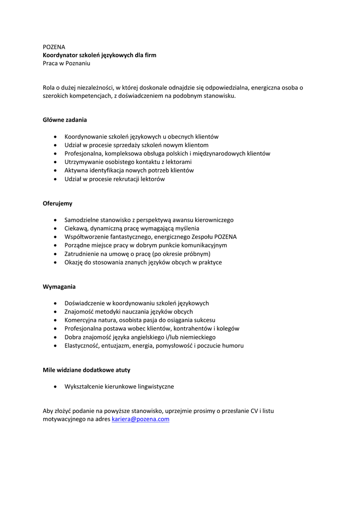 POZENA Koordynator szkoleń językowych dla firm Praca w Poznaniu Rola o dużej niezależności, w której doskonale odnajdzie się odpowiedzialna, energiczna osoba o szerokich kompetencjach, z doświadczeniem na podobnym stanowisku. Główne zadania Koordynowanie szkoleń językowych u obecnych klientów Udział w procesie sprzedaży szkoleń nowym klientom Profesjonalna, kompleksowa obsługa polskich i międzynarodowych klientów Utrzymywanie osobistego kontaktu z lektorami Aktywna identyfikacja nowych potrzeb klientów Udział w procesie rekrutacji lektorów Oferujemy Samodzielne stanowisko z perspektywą awansu kierowniczego Ciekawą, dynamiczną pracę wymagającą myślenia Współtworzenie fantastycznego, energicznego Zespołu POZENA Porządne miejsce pracy w dobrym punkcie komunikacyjnym Zatrudnienie na umowę o pracę (po okresie próbnym) Okazję do stosowania znanych języków obcych w praktyce Wymagania Doświadczenie w koordynowaniu szkoleń językowych Znajomość metodyki nauczania języków obcych Komercyjna natura, osobista pasja do osiągania sukcesu Profesjonalna postawa wobec klientów, kontrahentów i kolegów Dobra znajomość języka angielskiego i/lub niemieckiego Elastyczność, entuzjazm, energia, pomysłowość i poczucie humoru Mile widziane dodatkowe atuty Wykształcenie kierunkowe lingwistyczne Aby złożyć podanie na powyższe stanowisko, uprzejmie prosimy o przesłanie CV i listu motywacyjnego na adres [email protected]