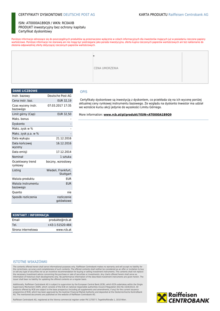 CERTYFIKATY DYSKONTOWE DEUTSCHE POST AG KARTA PRODUKTU Raiffeisen Centrobank AG ISIN: AT0000A1B9Q9 / WKN: RC0AXB PRODUKT inwestycyjny bez ochrony kapitału Certyfikat dyskontowy Poniższe informacje odnoszące się do poszczególnych produktów są przeznaczone wyłącznie w celach informacyjnych dla inwestorów mających już w posiadaniu rzeczone papiery wartościowe. Poniższe informacje nie stanowią ani nie mogą być postrzegane jako porada inwestycyjna, oferta kupna rzeczonych papierów wartościowych ani też nakłanianie do złożenia odpowiedniej oferty dotyczącej rzeczonych papierów wartościowych. CENA UMORZENIA DANE LICZBOWE OPIS Instr. bazowy Deutsche Post AG Cena instr. baz. EUR 32,19 Czas wyceny instr. bazowego 07.03.2017 17:35 Limit górny (Cap) EUR 32,50 Maks. bonus - Dyskonto - Maks. zysk w % - Maks. zysk p.a. w % Certyfikaty dyskontowe są inwestycją z dyskontem, co przekłada się na ich wycenę poniżej aktualnej ceny rynkowej instrumentu bazowego. Ze względu na dyskonto Inwestor ma udział we wzroście kursu akcji jedynie do wysokości Limitu Górnego. More information: www.rcb.at/pl/produkt/?ISIN=AT0000A1B9Q9 - Data wykupu 21.12.2016 Data końcowej wyceny 16.12.2016 Data emisji 17.12.2014 Nominał 1 sztuka Oczekiwany trend rynkowy boczny, wzrostowy Listing Wiedeń, Frankfurt, Stuttgart Waluta produktu EUR Waluta instrumentu bazowego EUR Quanto nie Sposób rozliczenia rozliczenie gotówkowe KONTAKT / INFORMACJA Email Tel. Strona internetowa [email protected] +43-1-51520-484 www.rcb.at ISTOTNE WSKAZÓWKI The contents offered herein shall serve informational purposes only. Raiffeisen Centrobank makes no warranty and will accept no liability for the correctness, accuracy and completeness of such contents. The offered contents shall neither be considered as an offer or invitation to buy or sell any type of securities nor as an incentive recommendation for buying or selling investment instruments. The contents shall not replace the necessary investment advice concerning the purchase or sale of securities or investments. Any charts offered herein shall serve as information of historical chart developments only. No performance information of the described investment instruments are given herein. The issuer shall bear no liability for updating the offered contents on a regular basis. Additionally, Raiffeisen Centrobank AG is subject to supervision by the European Central Bank (ECB), which ECB undertakes within the Single Supervisory Mechanism (SSM), which consists of the ECB on national responsible authorities (Council Regulation (EU) No 1024/2013). All products offered by RCB are subject to the base prospectus (including all supplements and amendments, if any) for the current issuance programme of RCB, which has been approved by the Austrian Financial Market Authority and deposited at the Oesterreichische Kontrollbank AG. The mentioned documents are published on the website of Raiffeisen Centrobank AG. Raiffeisen Centrobank AG, registered at the Vienna commercial register under FN 117507 f, Tegetthoffstraße 1, 1010 Wien. Powered by TCPDF (www.tcpdf.org)