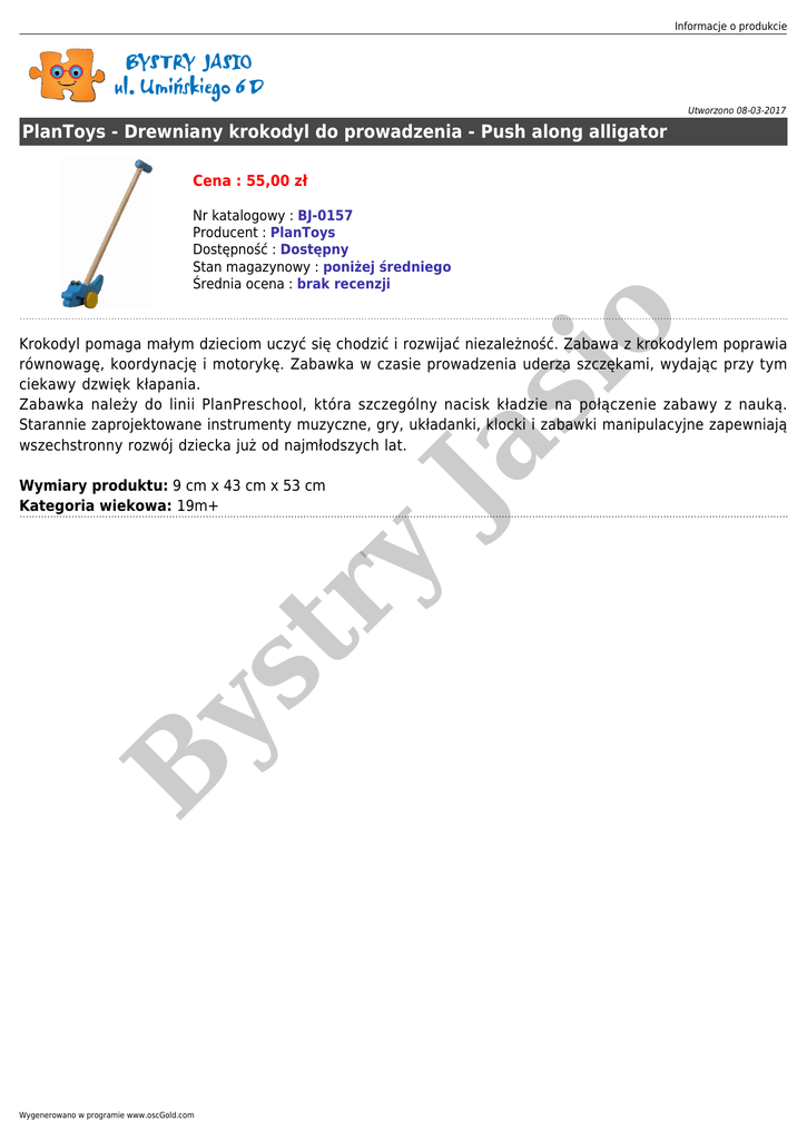 Informacje o produkcie Utworzono 08-03-2017 PlanToys - Drewniany krokodyl do prowadzenia - Push along alligator Cena : 55,00 zł si o Nr katalogowy : BJ-0157 Producent : PlanToys Dostępność : Dostępny Stan magazynowy : poniżej średniego Średnia ocena : brak recenzji B ys tr y Wymiary produktu: 9 cm x 43 cm x 53 cm Kategoria wiekowa: 19m+ Ja Krokodyl pomaga małym dzieciom uczyć się chodzić i rozwijać niezależność. Zabawa z krokodylem poprawia równowagę, koordynację i motorykę. Zabawka w czasie prowadzenia uderza szczękami, wydając przy tym ciekawy dzwięk kłapania. Zabawka należy do linii PlanPreschool, która szczególny nacisk kładzie na połączenie zabawy z nauką. Starannie zaprojektowane instrumenty muzyczne, gry, układanki, klocki i zabawki manipulacyjne zapewniają wszechstronny rozwój dziecka już od najmłodszych lat. Wygenerowano w programie www.oscGold.com