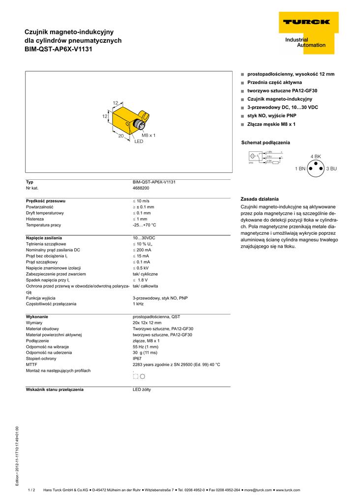 Czujnik magneto-indukcyjny dla cylindrów pneumatycznych BIM-QST-AP6X-V1131 ■ prostopadłościenny, wysokość 12 mm ■ Przednia część aktywna ■ tworzywo sztuczne PA12-GF30 ■ Czujnik magneto-indukcyjny ■ 3-przewodowy DC, 10…30 VDC ■ styk NO, wyjście PNP ■ Złącze męskie M8 x 1 Schemat podłączenia Typ Nr kat. BIM-QST-AP6X-V1131 4688200 Prędkość przesuwu Powtarzalność Dryft temperaturowy Histereza Temperatura pracy ð 10 m/s ï ± 0.1 mm ð 0.1 mm ð 1 mm -25…+70 °C Napięcie zasilania Tętnienia szczątkowe Nominalny prąd zasilania DC Prąd bez obciążenia I0 Prąd szczątkowy Napięcie znamionowe izolacji Zabezpieczenie przed zwarciem Spadek napięcia przy Ie Ochrona przed przerwą w obwodzie/odwrotną polaryzacją Funkcja wyjścia Częstotliwość przełączania 10…30VDC ð 10 % Uss ð 200 mA ð 15 mA ð 0.1 mA ð 0.5 kV tak/ cykliczne ð 1.8 V tak/ całkowita Wykonanie Wymiary Materiał obudowy Materiał powierzchni aktywnej Podłączenie Odporność na wibracje Odporność na uderzenia Stopień ochrony MTTF Montaż na następujących profilach prostopadłościenna, QST 20x 12x 12 mm Tworzywo sztuczne, PA12-GF30 tworzywo sztuczne, PA12-GF30 złącze, M8 x 1 55 Hz (1 mm) 30 g (11 ms) IP67 2283 years zgodnie z SN 29500 (Ed. 99) 40 °C . GF Wskaźnik stanu przełączenia LED żółty Zasada działania Czujniki magneto-indukcyjne są aktywowane przez pola magnetyczne i są szczególnie dedykowane do detekcji pozycji tłoka w cylindrach. Pola magnetyczne przenikają metale diamagnetyczne i umożliwiają wykrycie poprzez aluminiową ścianę cylindra magnesu trwałego znajdującego się na tłoku. Edition • 2012-11-11T10:17:49+01:00 3-przewodowy, styk NO, PNP 1 kHz 1/2 Hans Turck GmbH & Co.KG ñ D-45472 Mülheim an der Ruhr ñ Witzlebenstraße 7 ñ Tel. 0208 4952-0 ñ Fax 0208 4952-264 ñ [email protected] ñ www.turck.com Czujnik magneto-indukcyjny dla cylindrów pneumatycznych BIM-QST-AP6X-V1131 Akcesoria montażowe Typ Nr kat. KLQ 1-Z KLEMMSTÜCK 6971911 Wymiary montaż na G cylindrach cięgnowych; średnica cylindra 32… 63 mm; materiał: anodyzowane aluminium; klamrę zaciskową należy zamawiać osobno KLQ 2-Z KLEMMSTÜCK 6971912 montaż na G cylindrach cięgnowych; średnica cylindra 50… 125 mm; materiał: anodyzowane aluminium; klamrę zaciskową należy zamawiać osobno KLQ 1 KLEMMSTÜCK 6971901 montaż na G cylindrach profilowanych; średnica cylindra 32…50 mm; materiał: anodyzowane aluminium; klamrę zaciskową należy zamawiać osobno KLQ 2 KLEMMSTÜCK 6971902 montaż na G cylindrach profilowanych; średnica cylindra 50…100 mm; materiał: anodyzowane aluminium; klamrę za- Edition • 2012-11-11T10:17:49+01:00 ciskową należy zamawiać osobno 2/2 Hans Turck GmbH & Co.KG ñ D-45472 Mülheim an der Ruhr ñ Witzlebenstraße 7 ñ Tel. 0208 4952-0 ñ Fax 0208 4952-264 ñ [email protected] ñ www.turck.com
