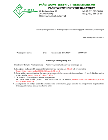 PAŃSTWOWY INSTYTUT WETERYNARYJNY PAŃSTWOWY INSTYTUT BADAWCZY Al. Partyzantów 57 24-100 Puławy http://www.piwet.pulawy.pl tel. (0-81) 889 30 00 fax (0-81) 886 25 95 Uczestnicy postępowania na dostawę odczynników laboratoryjnych i materiałów pomocniczych znak sprawy DG-2501/4/1/11 Wasze pismo z dnia: Znak: Nasz znak:DG-2501/4/60/11 2011/01/10 Informacja o modyfikacji nr 2 Państwowy Instytut Weterynaryjny - Państwowy Instytut Badawczy informuje, iż: 1. Dodaje się zadanie 2.14- odczynniki laboratoryjne wg katalogu Merck lub równoważne Tween 20 do syntezy nr kat 822184500, op./0,5 l- op. 1 2. Zamawiający uzupełnia dane dotyczące termometru będącego przedmiotem zadania 1.5 pkt. 2. Dodaje punkty wzorcowania: punkty -20 st. C, +4 st. C, 40 st. C. 3. W zadaniu 2.7- zostają wykreślone komponenty PIG ALBUMIN ELISA QUANTITATION SET NR KAT E100-110, COMPONENTS A100-110A-8, RS-10107-3, A100-110P-19 4. Z załącznika 1b zostaje usunięta kolumna cena jednostkowa, gdyż została ona skopiowana niepotrzebnie. Istnieje już kolumna cena jednostkowa netto.