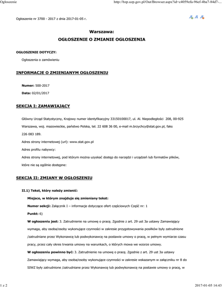 Ogłoszenie 1z2 http://bzp.uzp.gov.pl/Out/Browser.aspx?id=c4059efa-96ef-4ba7-84d7-... Ogłoszenie nr 3700 - 2017 z dnia 2017-01-05 r. Warszawa: OGŁOSZENIE O ZMIANIE OGŁOSZENIA OGŁOSZENIE DOTYCZY: Ogłoszenia o zamówieniu INFORMACJE O ZMIENIANYM OGŁOSZENIU Numer: 500-2017 Data: 02/01/2017 SEKCJA I: ZAMAWIAJĄCY Główny Urząd Statystyczny, Krajowy numer identyfikacyjny 33150100017, ul. Al. Niepodległości 208, 00-925 Warszawa, woj. mazowieckie, państwo Polska, tel. 22 608 36 00, e-mail [email protected], faks 226 083 189. Adres strony internetowej (url): www.stat.gov.pl Adres profilu nabywcy: Adres strony internetowej, pod którym można uzyskać dostęp do narzędzi i urządzeń lub formatów plików, które nie są ogólnie dostępne: SEKCJA II: ZMIANY W OGŁOSZENIU II.1) Tekst, który należy zmienić: Miejsce, w którym znajduje się zmieniany tekst: Numer sekcji: Załącznik I – informacje dotyczące ofert częściowych Część nr: 1 Punkt: 6) W ogłoszeniu jest: 3. Zatrudnienie na umowę o pracę. Zgodnie z art. 29 ust 3a ustawy Zamawiający wymaga, aby osoba/osoby wykonujące czynności w zakresie przygotowywania posiłków były zatrudnione /zatrudniane przez Wykonawcę lub podwykonawcę na postawie umowy o pracę, w pełnym wymiarze czasu pracy, przez cały okres trwania umowy na warunkach, o których mowa we wzorze umowy. W ogłoszeniu powinno być: 3. Zatrudnienie na umowę o pracę. Zgodnie z art. 29 ust 3a ustawy Zamawiający wymaga, aby osoba/osoby wykonujące czynności w zakresie wskazanym w załączniku nr 8 do SIWZ były zatrudnione /zatrudniane przez Wykonawcę lub podwykonawcę na postawie umowy o pracę, w 2017-01-05 14:43 Ogłoszenie 2z2 http://bzp.uzp.gov.pl/Out/Browser.aspx?id=c4059efa-96ef-4ba7-84d7-... pełnym wymiarze czasu pracy, przez cały okres trwania umowy na warunkach, o których mowa we wzorze umowy. Miejsce, w którym znajduje się zmieniany tekst: Numer sekcji: Załącznik I – informacje dotyczące ofert częściowych Część nr: 2 Punkt: 6) W ogłoszeniu jest: 3. Zatrudnienie na umowę o pracę. Zgodnie z art. 29 ust 3a ustawy Zamawiający wymaga, aby osoba/osoby wykonujące czynności w zakresie przygotowywania posiłków były zatrudnione /zatrudniane przez Wykonawcę lub podwykonawcę na postawie umowy o pracę, w pełnym wymiarze czasu pracy, przez cały okres trwania umowy na warunkach, o których mowa we wzorze umowy. W ogłoszeniu powinno być: 3. Zatrudnienie na umowę o pracę. Zgodnie z art. 29 ust 3a ustawy Zamawiający wymaga, aby osoba/osoby wykonujące czynności w zakresie wskazanym w załączniku nr 8 do SIWZ były zatrudnione /zatrudniane przez Wykonawcę lub podwykonawcę na postawie umowy o pracę, w pełnym wymiarze czasu pracy, przez cały okres trwania umowy na warunkach, o których mowa we wzorze umowy. Miejsce, w którym znajduje się zmieniany tekst: Numer sekcji: Załącznik I – informacje dotyczące ofert częściowych Część nr: 3 Punkt: 6) W ogłoszeniu jest: 3. Zatrudnienie na umowę o pracę. Zgodnie z art. 29 ust 3a ustawy Zamawiający wymaga, aby osoba/osoby wykonujące czynności w zakresie przygotowywania posiłków były zatrudnione /zatrudniane przez Wykonawcę lub podwykonawcę na postawie umowy o pracę, w pełnym wymiarze czasu pracy, przez cały okres trwania umowy na warunkach, o których mowa we wzorze umowy. W ogłoszeniu powinno być: 3. Zatrudnienie na umowę o pracę. Zgodnie z art. 29 ust 3a ustawy Zamawiający wymaga, aby osoba/osoby wykonujące czynności w zakresie wskazanym w załączniku nr 8 do SIWZ były zatrudnione /zatrudniane przez Wykonawcę lub podwykonawcę na postawie umowy o pracę, w pełnym wymiarze czasu pracy, przez cały okres trwania umowy na warunkach, o których mowa we wzorze umowy. 2017-01-05 14:43