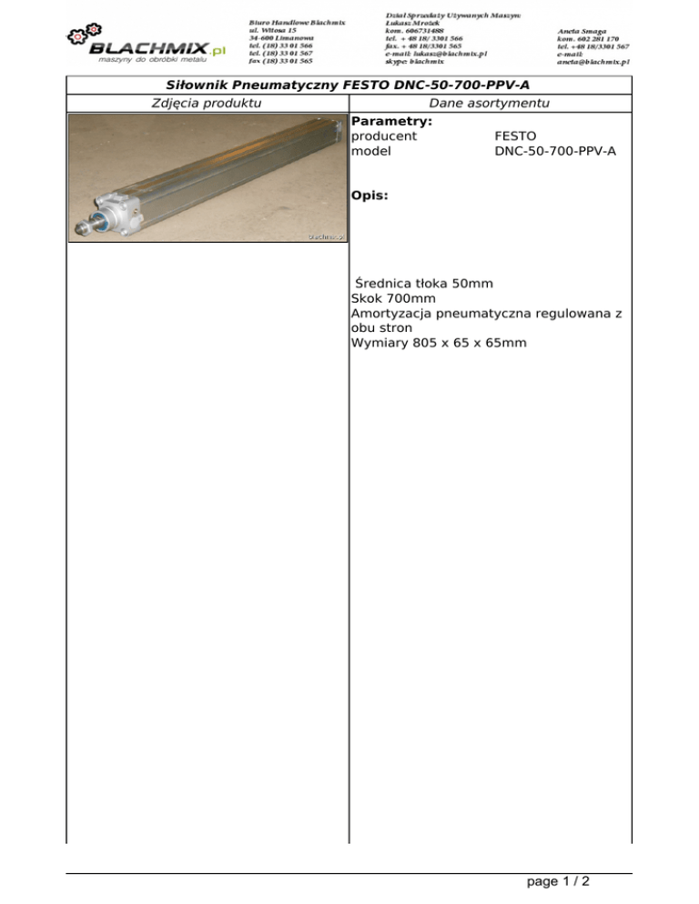 Siłownik Pneumatyczny FESTO DNC-50-700-PPV-A Zdjęcia produktu Dane asortymentu Parametry: producent model FESTO DNC-50-700-PPV-A Opis: Średnica tłoka 50mm Skok 700mm Amortyzacja pneumatyczna regulowana z obu stron Wymiary 805 x 65 x 65mm page 1 / 2 page 2 / 2 Powered by TCPDF (www.tcpdf.org)