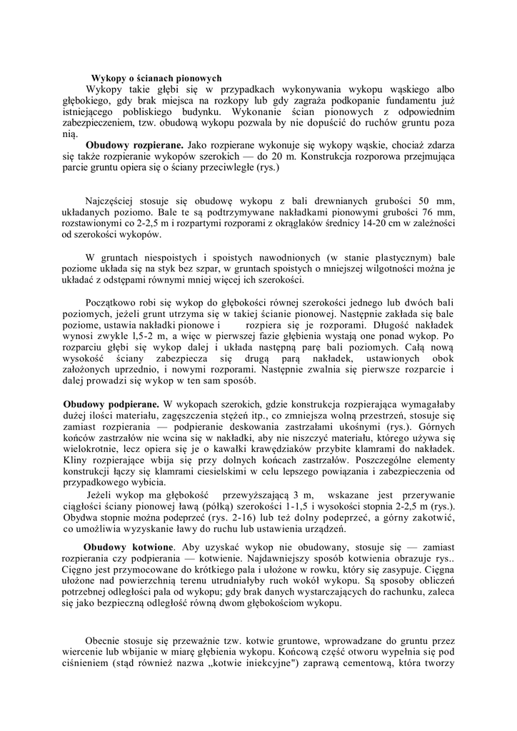 Wykopy o ścianach pionowych Wykopy takie głębi się w przypadkach wykonywania wykopu wąskiego albo głębokiego, gdy brak miejsca na rozkopy lub gdy zagraża podkopanie fundamentu już istniejącego pobliskiego budynku. Wykonanie ścian pionowych z odpowiednim zabezpieczeniem, tzw. obudową wykopu pozwala by nie dopuścić do ruchów gruntu poza nią. Obudowy rozpierane. Jako rozpierane wykonuje się wykopy wąskie, chociaż zdarza się także rozpieranie wykopów szerokich — do 20 m. Konstrukcja rozporowa przejmująca parcie gruntu opiera się o ściany przeciwległe (rys.) Najczęściej stosuje się obudowę wykopu z bali drewnianych grubości 50 mm, układanych poziomo. Bale te są podtrzymywane nakładkami pionowymi grubości 76 mm, rozstawionymi co 2-2,5 m i rozpartymi rozporami z okrąglaków średnicy 14-20 cm w zależności od szerokości wykopów. W gruntach niespoistych i spoistych nawodnionych (w stanie plastycznym) bale poziome układa się na styk bez szpar, w gruntach spoistych o mniejszej wilgotności można je układać z odstępami równymi mniej więcej ich szerokości. Początkowo robi się wykop do głębokości równej szerokości jednego lub dwóch bali poziomych, jeżeli grunt utrzyma się w takiej ścianie pionowej. Następnie zakłada się bale poziome, ustawia nakładki pionowe i rozpiera się je rozporami. Długość nakładek wynosi zwykle l,5-2 m, a więc w pierwszej fazie głębienia wystają one ponad wykop. Po rozparciu głębi się wykop dalej i układa następną parę bali poziomych. Całą nową wysokość ściany zabezpiecza się drugą parą nakładek, ustawionych obok założonych uprzednio, i nowymi rozporami. Następnie zwalnia się pierwsze rozparcie i dalej prowadzi się wykop w ten sam sposób. Obudowy podpierane. W wykopach szerokich, gdzie konstrukcja rozpierająca wymagałaby dużej ilości materiału, zagęszczenia stężeń itp., co zmniejsza wolną przestrzeń, stosuje się zamiast rozpierania — podpieranie deskowania zastrzałami ukośnymi (rys.). Górnych końców zastrzałów nie wcina się w nakładki, aby nie niszczyć materiału, którego używa się wielokrotnie, lecz opiera się je o kawałki krawędziaków przybite klamrami do nakładek. Kliny rozpierające wbija się przy dolnych końcach zastrzałów. Poszczególne elementy konstrukcji łączy się klamrami ciesielskimi w celu lepszego powiązania i zabezpieczenia od przypadkowego wybicia. Jeżeli wykop ma głębokość przewyższającą 3 m, wskazane jest przerywanie ciągłości ściany pionowej ławą (półką) szerokości 1-1,5 i wysokości stopnia 2-2,5 m (rys.). Obydwa stopnie można podeprzeć (rys. 2-16) lub też dolny podeprzeć, a górny zakotwić, co umożliwia wyzyskanie ławy do ruchu lub ustawienia urządzeń. Obudowy kotwione. Aby uzyskać wykop nie obudowany, stosuje się — zamiast rozpierania czy podpierania — kotwienie. Najdawniejszy sposób kotwienia obrazuje rys.. Cięgno jest przymocowane do krótkiego pala i ułożone w rowku, który się zasypuje. Cięgna ułożone nad powierzchnią terenu utrudniałyby ruch wokół wykopu. Są sposoby obliczeń potrzebnej odległości pala od wykopu; gdy brak danych wystarczających do rachunku, zaleca się jako bezpieczną odległość równą dwom głębokościom wykopu. Obecnie stosuje się przeważnie tzw. kotwie gruntowe, wprowadzane do gruntu przez wiercenie lub wbijanie w miarę głębienia wykopu. Końcową część otworu wypełnia się pod ciśnieniem (stąd również nazwa „kotwie iniekcyjne") zaprawą cementową, która tworzy tzw. buławę; cięgno zabezpiecza się przed korozją (rys. 2-20). Wytrzymałość kotwi sprawdza się na budowie. Wykopy szczelinowe. Przy wykonywaniu wykopów wąskich i jednocześnie głębokich (szczelin), zwłaszcza poniżej poziomu wody gruntowej, ściany ich utrzymuje się przez rozpieranie za pomocą cieczy tiksotropowych (zawiesin iłowych). Wykop głębi się koparką, zwykle chwytakową, przy czym najmniejszą możliwą szerokość wykopu wyznacza szerokość narzędzia głębiącego (praktycznie 50 cm). Cięższa od wody zawiesina opiera się swym ciśnieniem ciśnieniu wody gruntowej i parciu gruntu na ściany wykopu, nie dopuszczając do zawalenia się wykopu. Ścianki szczelne stalowe. W Polsce rozpowszechnił się niemiecki typ Larssena (rys.) Odwodnienie wykopów W przypadku różnicy poziomu wód gruntowych i poziomu dna wykopu może wystąpić konieczność odwodnienia wykopu. Dla umożliwienia prowadzenia prac na dnie wykopu dąży się do usunięcia wód napływających z gruntu na dno wykopu. W praktyce stosuje się odwodnienie powierzchniowe i odwodnienie przez tzw depresję. Odwodnienie powierzchniowe stosowane jest w gruntach spoistych w których najczęściej napływ wód ze zbocz wykopu nie jest gwałtowny. W gruntach niespoistych o dużej przepuszczalności odwadnianie dna wykopu metodą powierzchniową może powodować osuwanie się zboczy. W takich przypadkach stosuje się odwodnienie wgłębne przez tworzenie depresji.. Instalacja drenarska powinna być zaprojektowana jako zamknięta opaska wokół całego budynku. Rury drenarskie układa się z min. 0,5% spadkiem, 20 cm poniżej górnej powierzchni płyty fundamentowej i poziomej izolacji wodoszczelnej piwnic. Ciągi drenarskie obsypane są ze wszystkich stron 15 cm warstwą grubego żwiru i zabezpieczone przed zamuleniem włókniną filtracyjną. Odpływ nadmiaru wody spod płyty fundamentowej do drenażu opaskowego zapewniają otwory o średnicy 5 cm wykonane w ławach fundamentowych. Fundamenty budynków Posadowienie bezpośrednie budynku ma miejsce wtedy, kiedy obciążenie przekazywane jest na warstwę nośną gruntu, znajdującą się bezpośrednio pod fundamentem. Jeżeli warstwa nośna gruntu znajduje się głębiej niż poziom posadowienia budynku, zastosować można tzw. posadowienie pośrednie, w którym obciążenie jest przekazywane na głębiej położoną warstwę nośną za