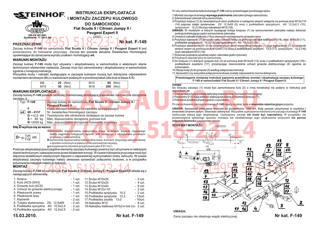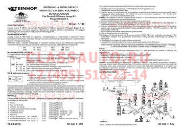 INSTRUKCJA EKSPLOATACJI I MONTA¯U ZACZEPU KULOWEGO DO SAMOCHODU Fiat Scudo II / Citroen Jumpy II / Peugeot Expert II +7 (495) 518-23-14 DIN EN ISO 9001 Zertifikat Nr. 71 100 D 366 (2007 - ® r. ) Nr kat. F-149 PRZEZNACZENIE Zaczep kulowy F-149 do samochodu Fiat Scudo II / Citroen Jumpy II / Peugeot Expert II jest przeznaczony do holowania przyczepy. Zaczep ten posiada aktualne Œwiadectwo Homologacji uprawniaj¹ce do oznaczenia wyrobu znakiem homologacji e4. WARUNKI MONTA¯U Zaczep kulowy F-149 mo¿e byæ u¿ywany i eksploatowany w samochodzie o w³aœciwym stanie technicznym elementów nadwozia. Zaczep musi byæ zamontowany i eksploatowany w samochodzie zgodnie z niniejsz¹ instrukcj¹. Wszystkie œruby i nakrêtki wystêpuj¹ce w zaczepie kulowym musz¹ byæ dokrêcone odpowiednim momentem obrotowym (Mo) o wartoœciach podanych w poni¿szej tabeli (dla œrub w klasie 8.8): M8 M10 - 25 (Nm) 50 (Nm) M12 M16 - 85 (Nm) 200 (Nm) W celu zamontowania haka kulowego F-149 nale¿y przestrzegaæ poni¿szego opisu: 1.Monta¿ zaczepu kulowego wymaga podcinania zderzaka tylnego samochodu. 2.Zdemontowaæ zderzak tylny samochodu. 3.Przy³o¿yæ korpus (1) do wewnêtrznych stron pod³u¿nic a nastêpnie skrêciæ wstêpnie za pomoc¹ œrub M12x110 (14) poprzez tulejki dystansowe Ø25/Ø12,5x69 (8) wraz z podk³adkami specjalnymi Ø40/Ø12,5x2,5 (10), sprê¿ystymi Ø12,2 (16) oraz nakrêtkami M12 (18). UWAGA: W modelach w których wystêpuje kolizja korpusu (1) ze wzmocnieniem zderzaka nale¿y dokonaæ podciêcia blokuj¹cej czêœci wzmocnienia zderzaka. 4.Umieœciæ nakrêtki klatkowe (19) w otworach monta¿owych od spodu ramy. 5.Przy³o¿yæ k¹towniki (7) od spodu ramy i skrêciæ lekko za pomoc¹ nakrêtek klatkowych (19), œrub M10x35 (11), podk³adek sprê¿ystych Ø10,2 (15) oraz specjalnych Ø40/Ø10,5x2,5 (9). 6.Przy³o¿yæ p³askowniki (5 i 6) do zewnêtrznych stron wsporników korpusu (1) oraz k¹towników (7) a nastêpnie skrêciæ razem za pomoc¹ œrub M12x40 (13) wraz z podk³adkami zwyk³ymi Ø13,0 (17), sprê¿ystymi Ø12,2 (16) oraz nakrêtkami M12 (18). 7.Wykonaæ podciêcie spodniej czêœci zderzaka (patrz rysunek). 8.Przykrêciæ zderzak tylny do samochodu. 9.Do korpusu (1) dokrêciæ gniazdo kuli (3) za pomoc¹ œrub M12x25 (12) wraz z podk³adkami sprê¿ystymi (16) i podk³adkami zwyk³ymi (17), przykrêcaj¹c równoczeœnie uchwyt gniazda elektrycznego (4) zgodnie ze schematem. 10.Wpi¹æ kulê (2) do gniazda (3) wed³ug za³¹czonej instrukcji. 11.Sprawdziæ czy wszystkie po³¹czenia œrubowe zosta³y odpowiednio mocno dokrêcone. +7 (495) 518-23-14 Przestrzeganie niniejszej instrukcji zapewnia prawid³owy monta¿ i eksploatacjê zaczepu kulowego F-149 w samochodzie Fiat Scudo II / Citroen Jumpy II / Peugeot Expert II. Uwaga: Do korpusu zaczepu (1) mo¿e byæ zamontowana kula (2) o innej konstrukcji ni¿ podano w instrukcji pod warunkiem, ¿e: 1.Zastosowana kula posiada tabliczkê znamionow¹ z numerem homologacji. 2.Parametry D i S maj¹ wartoœæ wiêksz¹ lub równ¹ od wartoœci korpusu (1). 3.Po³o¿enia œrodka kuli jest zgodne z rysunkiem. CLASSAUTO.RU WARUNKI EKSPLOATACJI Zaczep kulowy F-149 posiada tabliczkê znamionow¹ okreœlaj¹c¹ prawid³owe i bezpieczne obci¹¿enie zaczepu, tj. : Zaczep kulowy do samochodu Fiat Scudo II / Citroen Jumpy II / Typ: F-149 Peugeot Expert II Klasa zaczepu kulowego (urz¹dzenia sprzêgaj¹cego) F Nr. œwiadectwa Homologacji zaczepu e4 00 - 4137 D =12,0 kN Teoretyczna si³a odniesienia dzia³aj¹ca na zaczep kulowy S = 80 kg Max. dopuszczalne obci¹¿enie pionowe kuli R =2000 kg Max. dopuszczalne obci¹¿enie holowanej przyczepy +7 (495) 518-23-14 SCHEMAT MONTA¯U: 20 57 30 12 20 42,5 42,5 +7 (495) 518-23-14 +7 (495) 518-23-14 Zaczep kulowy F-149 do samochodu Fiat Scudo II / Citroen Jumpy II / Peugeot Expert II sk³ada siê z nastêpuj¹cych elementów: 15.03.2010. 12 370 370 MONTA¯ - 1 szt. - 1 szt. - 1 szt. - 1 szt. - 1 szt. - 1 szt. - 2 szt. - 2 szt. - 2 szt. - 2 szt. spód zderzaka ~782 Podczas eksploatacji poszczególne elementy zaczepu kulowego powinny byæ utrzymane w nale¿ytym stanie technicznym i zabezpieczone przed dzia³aniem korozji. W czasie holowania przyczepa musi byæ z³¹czona dodatkowym elastycznym z³¹czem o odpowiedniej wytrzyma³oœci (linka, ³añcuch). W czasie eksploatacji zaczepu kulowego nale¿y okresowo sprawdzaæ po³¹czenia œrubowe, a w przypadku poluzowania nakrêtek nale¿y je dokrêciæ. 1. Korpus 2. Kula (ACS-2043) 3. Gniazdo kuli (ACS) 4. Uchwyt do gniazda elektrycznego 5. P³askownik prawy 6. P³askownik lewy 7. K¹townik 8. Tulejka dystansowa Ø25/Ø12,5x69 9. Podk³adka specjalna Ø40/Ø10,5x2,5 10.Podk³adka specjalna Ø40/Ø12,5x2,5 75 T-technicznie dopuszczalna maksymalna masa, w tonach, pojazdu ci¹gn¹cego (tak¿e ci¹gników holuj¹cych) ³¹cznie, jeœli wystêpuje, z obci¹¿eniem pionowym przyczepy z osi¹ centraln¹. R-technicznie dopuszczalna maksymalna masa, w tonach, przyczepy samochodowej z dyszlem ruchomym w p³aszczyŸnie pionowej lub naczepy. g-przyspieszenie ziemskie (przyjmowane jako 9,81 m/s2) œrodek zderzaka 30 Si³ê D wylicza siê ze wzoru: D= gx TxR kN T+R Po zamontowaniu zaczepu kulowego F-149 nale¿y uzyskaæ wpis w dowodzie rejestracyjnym pojazdu. UWAGA: Sprawdzaæ po³¹czenia œrubowe po przejechaniu 1000 km. Kulê zawsze utrzymywaæ w czystoœci i smarowaæ smarem sta³ym. Stosowaæ os³onê kuli. Wszystkie uszkodzenia mechaniczne zaczepu kulowego F-149 wykluczaj¹ dalsz¹ jego eksploatacjê. Uszkodzony zaczep nie mo¿e byæ naprawiany. W przypadku nie przestrzegania opisanego sposobu monta¿u lub niew³aœciwego jego u¿ytkowania producent nie ponosi odpowiedzialnoœci za powsta³e szkody. 11.Œruba M10x35 - 2 szt. 12.Œruba M12x25 - 4 szt. 13.Œruba M12x40 - 6 szt. 14.Œruba M12x110 - 2 szt. 15.Podk³adka sprê¿ysta Ø10,2 - 2 szt. - 12szt. 16.Podk³adka sprê¿ysta Ø12,2 - 10szt. 17.Podk³adka zwyk³a Ø13,0 - 8 szt. 18.Nakrêtka M12 19.Nakrêtka klatk