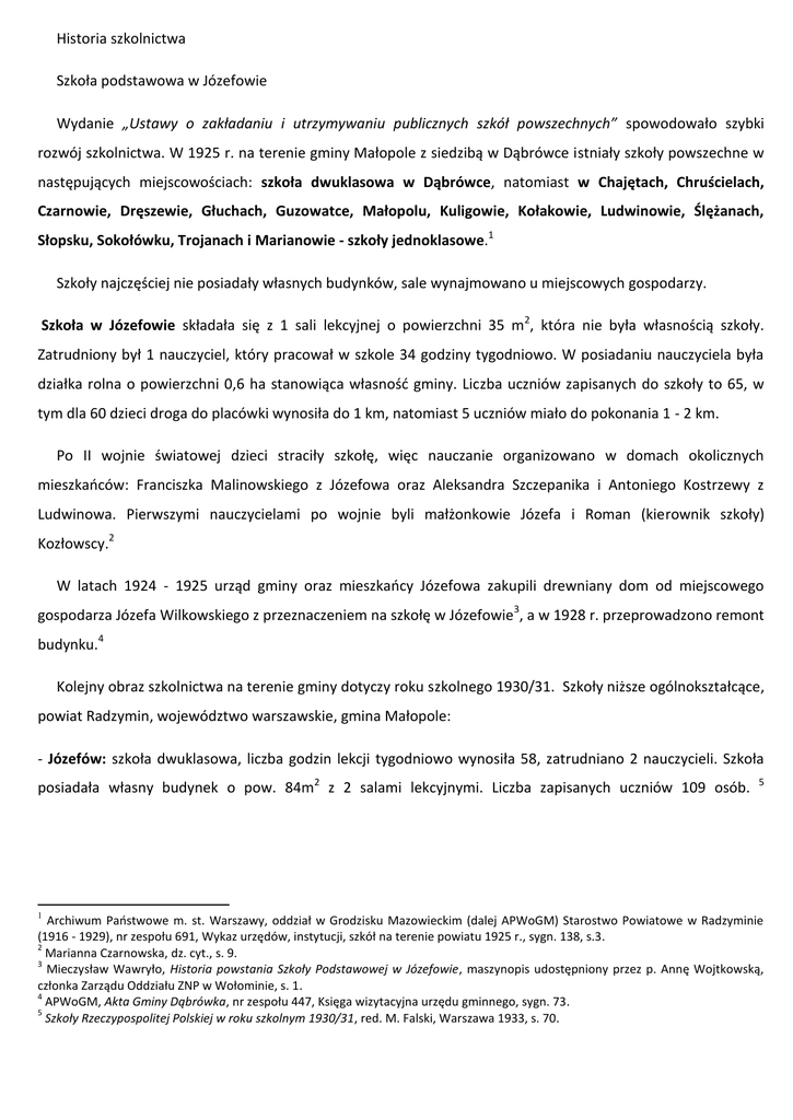 Historia szkolnictwa Szkoła podstawowa w Józefowie Wydanie „Ustawy o zakładaniu i utrzymywaniu publicznych szkół powszechnych” spowodowało szybki rozwój szkolnictwa. W 1925 r. na terenie gminy Małopole z siedzibą w Dąbrówce istniały szkoły powszechne w następujących miejscowościach: szkoła dwuklasowa w Dąbrówce, natomiast w Chajętach, Chruścielach, Czarnowie, Dręszewie, Głuchach, Guzowatce, Małopolu, Kuligowie, Kołakowie, Ludwinowie, Ślężanach, Słopsku, Sokołówku, Trojanach i Marianowie - szkoły jednoklasowe.1 Szkoły najczęściej nie posiadały własnych budynków, sale wynajmowano u miejscowych gospodarzy. Szkoła w Józefowie składała się z 1 sali lekcyjnej o powierzchni 35 m2, która nie była własnością szkoły. Zatrudniony był 1 nauczyciel, który pracował w szkole 34 godziny tygodniowo. W posiadaniu nauczyciela była działka rolna o powierzchni 0,6 ha stanowiąca własność gminy. Liczba uczniów zapisanych do szkoły to 65, w tym dla 60 dzieci droga do placówki wynosiła do 1 km, natomiast 5 uczniów miało do pokonania 1 - 2 km. Po II wojnie światowej dzieci straciły szkołę, więc nauczanie organizowano w domach okolicznych mieszkańców: Franciszka Malinowskiego z Józefowa oraz Aleksandra Szczepanika i Antoniego Kostrzewy z Ludwinowa. Pierwszymi nauczycielami po wojnie byli małżonkowie Józefa i Roman (kierownik szkoły) Kozłowscy.2 W latach 1924 - 1925 urząd gminy oraz mieszkańcy Józefowa zakupili drewniany dom od miejscowego gospodarza Józefa Wilkowskiego z przeznaczeniem na szkołę w Józefowie3, a w 1928 r. przeprowadzono remont budynku.4 Kolejny obraz szkolnictwa na terenie gminy dotyczy roku szkolnego 1930/31. Szkoły niższe ogólnokształcące, powiat Radzymin, województwo warszawskie, gmina Małopole: - Józefów: szkoła dwuklasowa, liczba godzin lekcji tygodniowo wynosiła 58, zatrudniano 2 nauczycieli. Szkoła posiadała własny budynek o pow. 84m2 z 2 salami lekcyjnymi. Liczba zapisanych uczniów 109 osób. 1 5 Archiwum Państwowe m. st. Warszawy, oddział w Grodzisku Mazowieckim (dalej APWoGM) Starostwo Powiatowe w Radzyminie (1916 - 1929), nr zespołu 691, Wykaz urzędów, instytucji, szkół na terenie powiatu 1925 r., sygn. 138, s.3. 2 Marianna Czarnowska, dz. cyt., s. 9. 3 Mieczysław Wawryło, Historia powstania Szkoły Podstawowej w Józefowie, maszynopis udostępniony przez p. Annę Wojtkowską, członka Zarządu Oddziału ZNP w Wołominie, s. 1. 4 APWoGM, Akta Gminy Dąbrówka, nr zespołu 447, Księga wizytacyjna urzędu gminnego, sygn. 73. 5 Szkoły Rzeczypospolitej Polskiej w roku szkolnym 1930/31, red. M. Falski, Warszawa 1933, s. 70. Początkowo jedyną nauczycielką i kierowniczką szkoły była pani Zasadowska, w szkole uczyli także Wojciech Pałaszewski i Jan Bielecki, którzy pochodzili z Ludwinowa.6 W 1947 r. okoliczni mieszkańcy - z przeznaczeniem na szkołę - kupili barak, który sprowadzono z Zielonej Góry.7 W baraku mieściły się 4 sale lekcyjne i mieszkanie dla nauczyciela. Następną kierowniczką była pani Maria Biesiadecka, która pracowała do końca 1950 r. Sytuacja materialna szkoły była bardzo trudna, niektóre pomoce naukowe np. ławki, wykonywali sami uczniowie. Nie było elektryczności i kanalizacji. Duży problem stanowiła frekwencja uczniów, gdyż bardzo często rodzice pozostawiali dzieci w domu do pracy w polu lub do wypasania bydła.8 Od roku 1950 do 1955 funkcję kierownika szkoły pełniła Antonina Iczałow. Latem 1950 r. gminna Komisja Oświaty dokonała oceny stanu budynku szkolnego. Zalecono zakup odpowiednich materiałów i dokonanie remontu dachu, wykonanie pieców oraz bieżących napraw wewnątrz szkoły. Do zakupu przewidziano także wyposażenie szkoły: tablicę, stół, 2 krzesła oraz 30 ławek. 9 Dużym problemem był fakt, iż w klasach dzieci nie były z jednego rocznika. Kolejnym kierownikiem szkoły była Lucyna Brakonięcka, która kierowała szkołą do 1960 r. Podczas sprawowania przez nią urzędu do szkoły doszły dwie nauczycielki: Henryka Sczechura (później Rucińska) oraz Marianna Sikora (później Czarnowska). Pani kierownik zajmowała znajdujące się przy szkole mieszkanie, które podzielone było na dwie części: kancelarię i część mieszkalną. Zajęcia z dziećmi prowadzone były w klasach łączonych. Tak wspomina ówczesna szkołę nauczycielka - Marianna Czarnowska: „W izbach lekcyjnych były piece kaflowe i drewniane podłogi. W każdej klasie był kącik czystości, czyli miednica i wiadro do mycia rąk. (…) W czasie dużych mrozów w klasach było zimno, dzieci często siedziały w paltach. Jeśli były dowożone, to tylko saniami. Drewniane ubikacje znajdowały się w podwórku. Wodę czerpano ze studni, nie było kanalizacji. Mimo tak trudnych warunków dzieci chętnie uczęszczały do szkoły, były zdyscyplinowane i zawsze czysto ubrane.” 10 W 1960 r. funkcję kierownika szkoły pełniła przez rok Maria Malinowska. W czasie tak krótkiego urzędowania szkolny barak tętnił życiem do późnych godzin wieczornych. Było to wynikiem zakupu przez Komitet Rodzicielski pierwszego telewizora, który gromadził w szkole okolicznych mieszkańców. Podczas urzędowania Mari 6 Marianna Czarnowska, Moja szkoła. Wspomnienia, wydarzenia, ludzie, maszynopis w posiadaniu autora, Józefów 2008, s. 9. Mieczysław Wawryło, Historia powstania…, dz. cyt., s. 1 8 APW o GM, Akta Gminy Dąbrówka, nr zespołu 447, Komisja Oświaty, sygn. 13 s. 35. 9 Tamże, s. 43 10 Marianna Czarnowska, dz. cyt., s. 11. 7 Malinowskiej w szkole zatrudnionych było trzech nauczycieli: Marianna Czarnowska, Stanisław Majewski i Henryka Szczechura. Następną osobą kierującą szkołą był Stanisław Majewski, który zatrudnił jeszcze dwóch nauczycieli: Teresę Dąbrowską i Eugeniusza Rucińskiego oraz Mariana Dybka na zastępstwa.11 W latach 1964 - 1975 funkcję kierownika, a następnie dyrektora szkoły pełniła Marianna Czarn