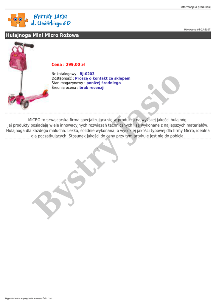 Informacje o produkcie Utworzono 08-03-2017 Hulajnoga Mini Micro Różowa Cena : 299,00 zł si o Nr katalogowy : BJ-0203 Dostępność : Proszę o kontakt ze sklepem Stan magazynowy : poniżej średniego Średnia ocena : brak recenzji B ys tr y Ja MICRO to szwajcarska firma specjalizująca się w produkcji najwyższej jakości hulajnóg. Jej produkty posiadają wiele innowacyjnych rozwiązań technicznych i są wykonane z najlepszych materiałów. Hulajnoga dla każdego malucha. Lekka, solidnie wykonana, o wysokiej jakości typowej dla firmy Micro, idealna dla początkujących. Stosunek jakości do ceny przy tym artykule jest nie do pobicia. Wygenerowano w programie www.oscGold.com