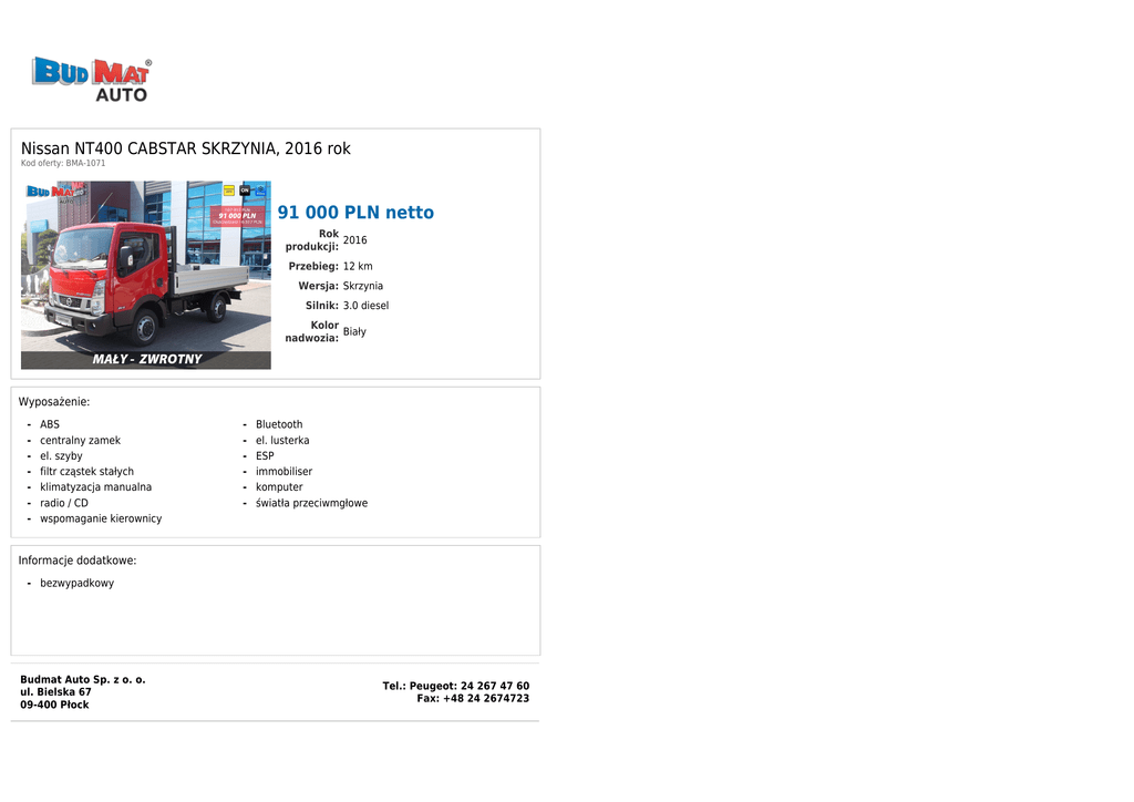 Nissan NT400 CABSTAR SKRZYNIA, 2016 rok Kod oferty: BMA-1071 91 000 PLN netto Rok 2016 produkcji: Przebieg: 12 km Wersja: Skrzynia Silnik: 3.0 diesel Kolor Biały nadwozia: Wyposażenie: - ABS centralny zamek el. szyby filtr cząstek stałych klimatyzacja manualna radio / CD wspomaganie kierownicy - Bluetooth el. lusterka ESP immobiliser komputer światła przeciwmgłowe Informacje dodatkowe: - bezwypadkowy Budmat Auto Sp. z o. o. ul. Bielska 67 09-400 Płock Tel.: Peugeot: 24 267 47 60 Fax: +48 24 2674723
