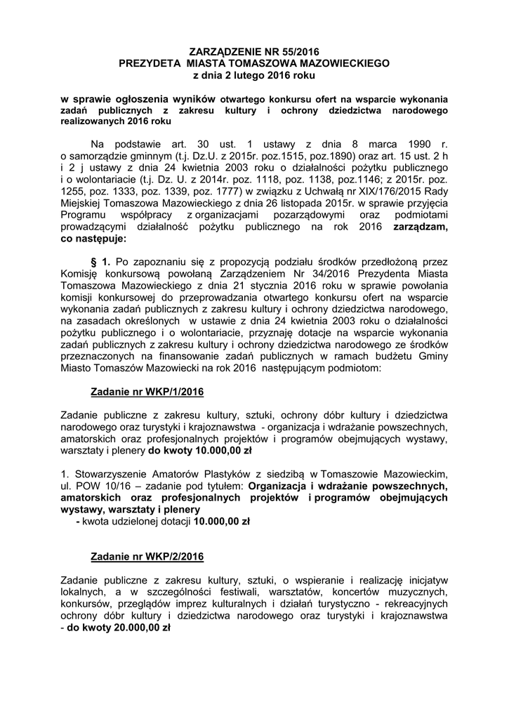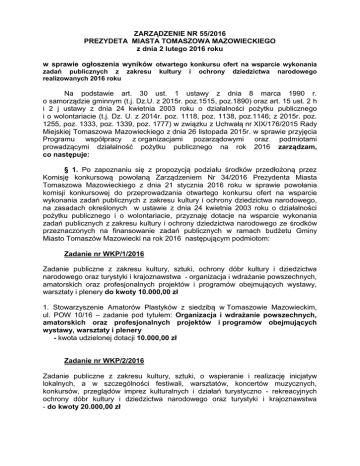 ZARZĄDZENIE NR 55/2016 PREZYDETA MIASTA TOMASZOWA MAZOWIECKIEGO z dnia 2 lutego 2016 roku w sprawie ogłoszenia wyników otwartego konkursu ofert na wsparcie wykonania zadań publicznych z zakresu realizowanych 2016 roku kultury i ochrony dziedzictwa narodowego Na podstawie art. 30 ust. 1 ustawy z dnia 8 marca 1990 r. o samorządzie gminnym (t.j. Dz.U. z 2015r. poz.1515, poz.1890) oraz art. 15 ust. 2 h i 2 j ustawy z dnia 24 kwietnia 2003 roku o działalności pożytku publicznego i o wolontariacie (t.j. Dz. U. z 2014r. poz. 1118, poz. 1138, poz.1146; z 2015r. poz. 1255, poz. 1333, poz. 1339, poz. 1777) w związku z Uchwałą nr XIX/176/2015 Rady Miejskiej Tomaszowa Mazowieckiego z dnia 26 listopada 2015r. w sprawie przyjęcia Programu współpracy z organizacjami pozarządowymi oraz podmiotami prowadzącymi działalność pożytku publicznego na rok 2016 zarządzam, co następuje: § 1. Po zapoznaniu się z propozycją podziału środków przedłożoną przez Komisję konkursową powołaną Zarządzeniem Nr 34/2016 Prezydenta Miasta Tomaszowa Mazowieckiego z dnia 21 stycznia 2016 roku w sprawie powołania komisji konkursowej do przeprowadzania otwartego konkursu ofert na wsparcie wykonania zadań publicznych z zakresu kultury i ochrony dziedzictwa narodowego, na zasadach określonych w ustawie z dnia 24 kwietnia 2003 roku o działalności pożytku publicznego i o wolontariacie, przyznaję dotacje na wsparcie wykonania zadań publicznych z zakresu kultury i ochrony dziedzictwa narodowego ze środków przeznaczonych na finansowanie zadań publicznych w ramach budżetu Gminy Miasto Tomaszów Mazowiecki na rok 2016 następującym podmiotom: Zadanie nr WKP/1/2016 Zadanie publiczne z zakresu kultury, sztuki, ochrony dóbr kultury i dziedzictwa narodowego oraz turystyki i krajoznawstwa - organizacja i wdrażanie powszechnych, amatorskich oraz profesjonalnych projektów i programów obejmujących wystawy, warsztaty i plenery do kwoty 10.000,00 zł 1. Stowarzyszenie Amatorów Plastyków z siedzibą w Tomaszowie Mazowieckim, ul. POW 10/16 – zadanie pod tytułem: Organizacja i wdrażanie powszechnych, amatorskich oraz profesjonalnych projektów i programów obejmujących wystawy, warsztaty i plenery - kwota udzielonej dotacji 10.000,00 zł Zadanie nr WKP/2/2016 Zadanie publiczne z zakresu kultury, sztuki, o wspieranie i realizację inicjatyw lokalnych, a w szczególności festiwali, warsztatów, koncertów muzycznych, konkursów, przeglądów imprez kulturalnych i działań turystyczno - rekreacyjnych ochrony dóbr kultury i dziedzictwa narodowego oraz turystyki i krajoznawstwa - do kwoty 20.000,00 zł 1. Tomaszowski Uniwersytet Trzeciego Wieku z siedzibą w Tomaszowie Mazowieckim, ul. Browarna 7 – zadanie pod tytułem: „Wczasy w sercu miasta 3” – cykl imprez kulturalnych dla dorosłych mieszkańców miasta – kwota udzielonej dotacji 5.000,00 zł 2. Stowarzyszenie Rodzin Dzieci i Osób Niepełnosprawnych z siedzibą w Tomaszowie Mazowieckim, ul. Warszawska 95/97 – zadanie pod tytułem „ Rozśpiewana Jesień” i „Słowa Kwitną Wszędzie” - kwota udzielonej dotacji 5.000,00 3. Związek Harcerstwa Polskiego – Hufiec ZHP Tomaszów Mazowiecki z siedzibą w Tomaszowie Mazowieckim ul. Polna 12 – zadanie pod tytułem XXVII Festiwal Piosenki Harcerskiej i Turystycznej pn. „Zielona Nuta” - kwota udzielonej dotacji 10.000,00 zł Zadanie nr WKP/3/2016 Zadanie publiczne z zakresu podtrzymywania i upowszechniania tradycji narodowej, pielęgnowania polskości oraz rozwoju świadomości narodowej, obywatelskiej i kulturowej - realizowanie programów dotyczących wychowania patriotycznego i wychowania w duchu społeczeństwa obywatelskiego oraz podtrzymywania tradycji narodowych - do kwoty 20.000,00 zł 1. Klub Sportowy AMBER z siedzibą w Tomaszowie Mazowieckim, ul. PCK 2/4 – zadanie pod tytułem: VI Biało – Czerwony Spływ Niepodległości - kwota udzielonej dotacji 1.000,00 zł 2. Związek Strzelecki „STRZELEC” Organizacja Społeczno Wychowawcza Jednostka Strzelecka 1002 z siedzibą w Tomaszowie Mazowieckim, ul. Farbiarska 20 – zadanie pod tytułem: „Realizowanie programów dotyczących wychowania patriotycznego i wychowania w duchu społeczeństwa obywatelskiego oraz podtrzymania tradycji narodowych” - kwota udzielonej dotacji 13.000,00 zł § 2. Ogłoszenie wyników publikuje się poprzez zamieszczenie: 1) w Biuletynie Informacji Publicznej Urzędu Miasta w Tomaszowie Mazowieckim; 2) na stronie internetowej Miasta Tomaszowa Mazowieckiego w zakładce „Nasze sprawy - Organizacje pozarządowe”; 3) na tablicy ogłoszeń Urzędu Miasta w Tomaszowie Mazowieckim. § 3. Wykonanie Zarządzenia powierzam Dyrektorowi Wydziału Kultury, Promocji i Turystyki. § 4. Zarządzenie wchodzi w życie z dniem podpisania.