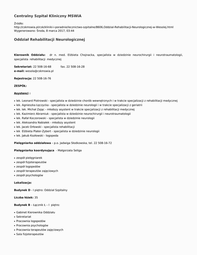 Centralny Szpital Kliniczny MSWiA Źródło: http://cskmswia.pl/csk/kliniki-i-poradnie/lecznictwo-szpitalne/8606,Oddzial-Rehabilitacji-Neurologicznej-w-Wesolej.html Wygenerowano: Środa, 8 marca 2017, 03:44 Oddział Rehabilitacji Neurologicznej Kierownik Oddziału: dr n. med. Elżbieta Chojnacka, specjalista w dziedzinie neurochirurgii i neurotraumatologii, specjalista rehabilitacji medycznej Sekretariat: 22 508-16-68 fax. 22 508-16-28 e-mail: [email protected] Rejestracja: 22 508-16-76 ZESPÓŁ: Asystenci : ● lek. Leonard Piotrowski - specjalista w dziedzinie chorób wewnętrznych i w trakcie specjalizacji z rehabilitacji medycznej ● lek. Agnieszka Łęczycka - specjalista w dziedzinie neurologii i w trakcie specjalizacji z geriatrii ● lek. lek. Michał Zając - młodszy asystent w trakcie specjalizacji z rehabilitacji medycznej ● lek. Kazimierz Abramiuk - specjalista w dziedzinie neurochirurgii i neurotraumatologii ● lek. Rafał Koczorowski - specjalista w dziedzinie neurologii ● lek. Aleksandra Nabiałek - młodszy asystent ● lek. Jacek Orłowski - specjalista rehabilitacji ● lek Elżbieta Plater-Zybert - specjalista w dziedzinie neurologii ● lek. Jakub Kozłowski - logopeda Pielęgniarka oddziałowa – p.o. Jadwiga Słodkowska, tel. 22 508-16-72 Pielęgniarka koordynująca - Małgorzata Seliga ● zespół pielęgniarek ● zespół fizjoterapeutów ● zespół logopedów ● zespół terapeutów zajęciowych ● zespół psychologów Lokalizacja: Budynek D - I piętro: Oddział Szpitalny Liczba łóżek: 35 Budynek B – Łącznik Ł – I piętro: ● Gabinet Kierownika Oddziału ● Sekretariat ● Pracownia logopedów ● Pracownia psychologów ● Pracownia terapeutów zajęciowych ● Sala fizjoterapeutów Zakres działalności: Świadczenia rehabilitacyjne realizowane w warunkach stacjonarnych. Celem Oddziału jest usprawnianie osób ze schorzeniami neurologicznymi (ośrodkowego i obwodowego układu nerwowego). Wykaz realizowanych procedur medycznych: ● całodobową opiekę lekarsko-pielęgniarską, ● kinezyterapię ● fizykoterapię i inne zabiegi fizjoterapeutyczne ● zajęcia w pracowniach: logopedów, psychologów i terapii zajęciowej Tryb kierowania na rehabilitację: Zasady kierowania na rehabilitację neurologiczną w warunkach stacjonarnych określa: 1. Rozporządzenie Ministra Zdrowia z dnia 6 listopada 2013 r. w sprawie świadczeń gwarantowanych z zakresu rehabilitacji leczniczej 2. Zarządzenie Nr 90/2014/DSOZ Prezesa Narodowego Funduszu Zdrowia z dnia 18 grudnia 2014r. w sprawie określenia warunków zawierania i realizacji umów w rodzaju rehabilitacja lecznicza. WYMAGANE DOKUMENTY: ● skierowanie do szpitala ● dokument z numerem PESEL (dowód osobisty, prawo jazdy, paszport) ● pożądana kserokopia aktualnej dokumentacji medycznej w zakresie schorzenia z którym pacjent kierowany jest do Oddziału Rehabilitacyjnej Neurologicznej Drukuj Generuj PDF Powiadom znajomego Wstecz