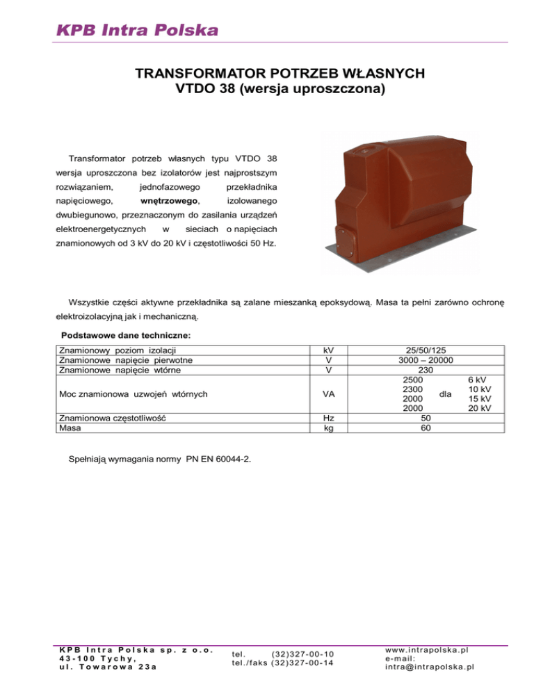 TRANSFORMATOR POTRZEB WŁASNYCH VTDO 38 (wersja uproszczona) Transformator potrzeb własnych typu VTDO 38 wersja uproszczona bez izolatorów jest najprostszym rozwiązaniem, jednofazowego przekładnika napięciowego, wnętrzowego, izolowanego dwubiegunowo, przeznaczonym do zasilania urządzeń elektroenergetycznych w sieciach o napięciach znamionowych od 3 kV do 20 kV i częstotliwości 50 Hz. Wszystkie części aktywne przekładnika są zalane mieszanką epoksydową. Masa ta pełni zarówno ochronę elektroizolacyjną jak i mechaniczną. Podstawowe dane techniczne: Znamionowy poziom izolacji Znamionowe napięcie pierwotne Znamionowe napięcie wtórne kV V V Moc znamionowa uzwojeń wtórnych VA Znamionowa częstotliwość Masa Hz kg 25/50/125 3000 – 20000 230 2500 2300 dla 2000 2000 50 60 6 kV 10 kV 15 kV 20 kV Spełniają wymagania normy PN EN 60044-2. KPB Intra Polska sp. z o.o. 43-100 Tychy, ul. Towarowa 23a t el . ( 3 2 ) 3 2 7- 0 0 - 1 0 t el . / f a k s ( 3 2 ) 3 2 7- 0 0 - 1 4 www. i n t r a p o l sk a . p l e- m a il : i n t r a@i n t r a p ol s k a . pl Izolowane dwubiegunowo transformatory typu VTDO 38 wersja uproszczona bez izolatorów posiadają wszystkie części uzwojenia pierwotnego łącznie z zaciskami "A" i "B" izolowane od ziemi. Schematy elektryczne Uwaga: Podczas eksploatacji jeden z zacisków wtórnych powinien być uziemiony Szkic wymiarowy KPB Intra Polska sp. z o.o. 43-100 Tychy, ul. Towarowa 23a t el . ( 3 2 ) 3 2 7- 0 0 - 1 0 t el . / f a k s ( 3 2 ) 3 2 7- 0 0 - 1 4 www. i n t r a p o l sk a . p l e- m a il : i n t r a@i n t r a p ol s k a . pl
